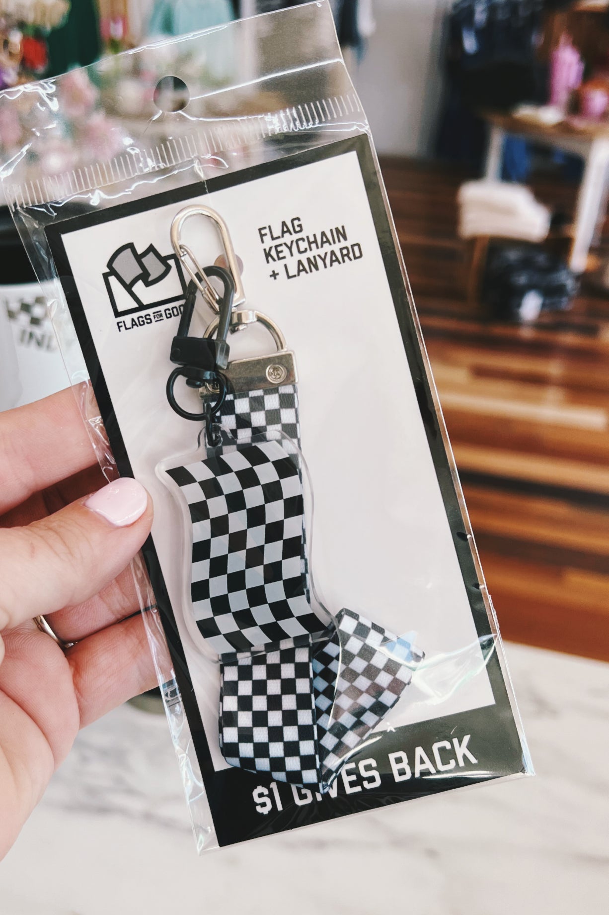 The perfect racing accessory!! This keychain can be used with both pieces together or separated to be in two spots. For example, you can put the wrist lanyard on your key ring and your flag keychain on your backpack. Or, they can be used together, rock them in whatever way makes you most happy!