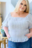 Stay ahead of the trends in our Anticipating More Smocked Blouse! Its feminine smocked bodice and chic square neckline combine with tie detail puff sleeves and muted retro ticking stripes, creating a truly chic look. Fall in love with this stunning blouse!
