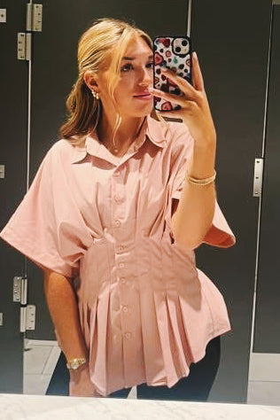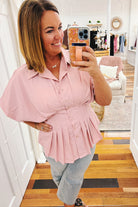 The Astrid Pleated Button Down Blouse brings trendy style with a playful twist. Its dolman sleeves and peplum bottom create a flattering silhouette, while tucked details accentuate your waist for a slimming fit. Perfect for adding fun and flair to any outfit, this blouse makes a chic statement wherever you go.