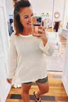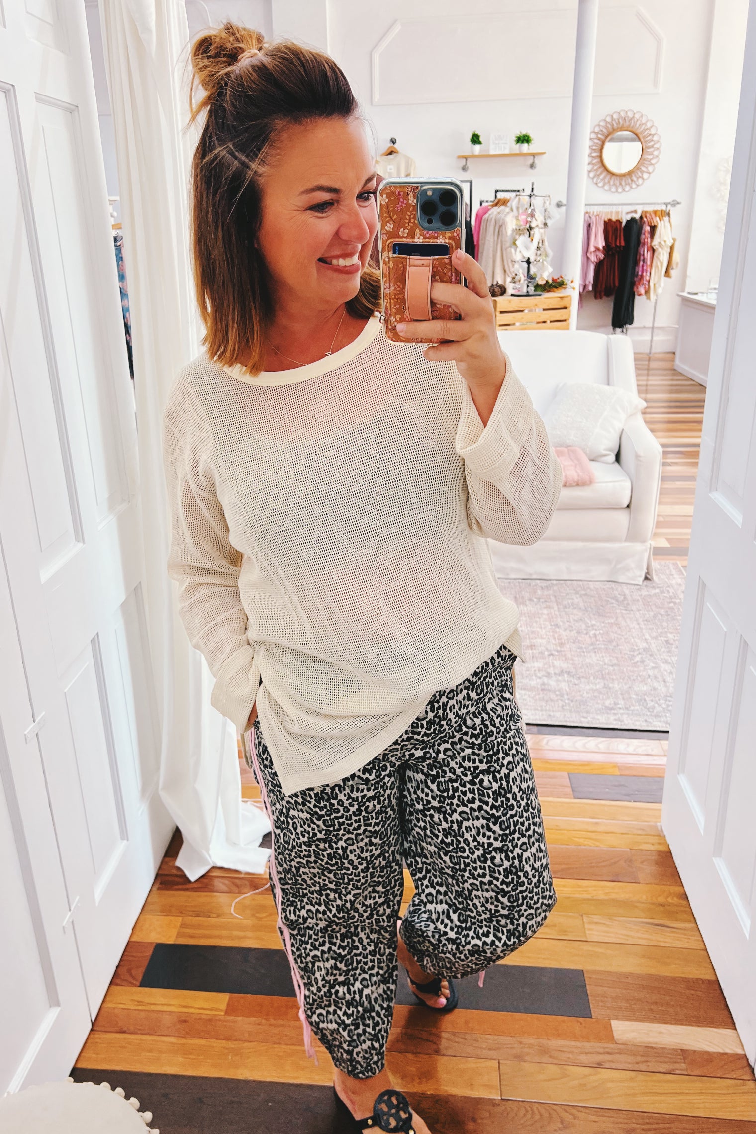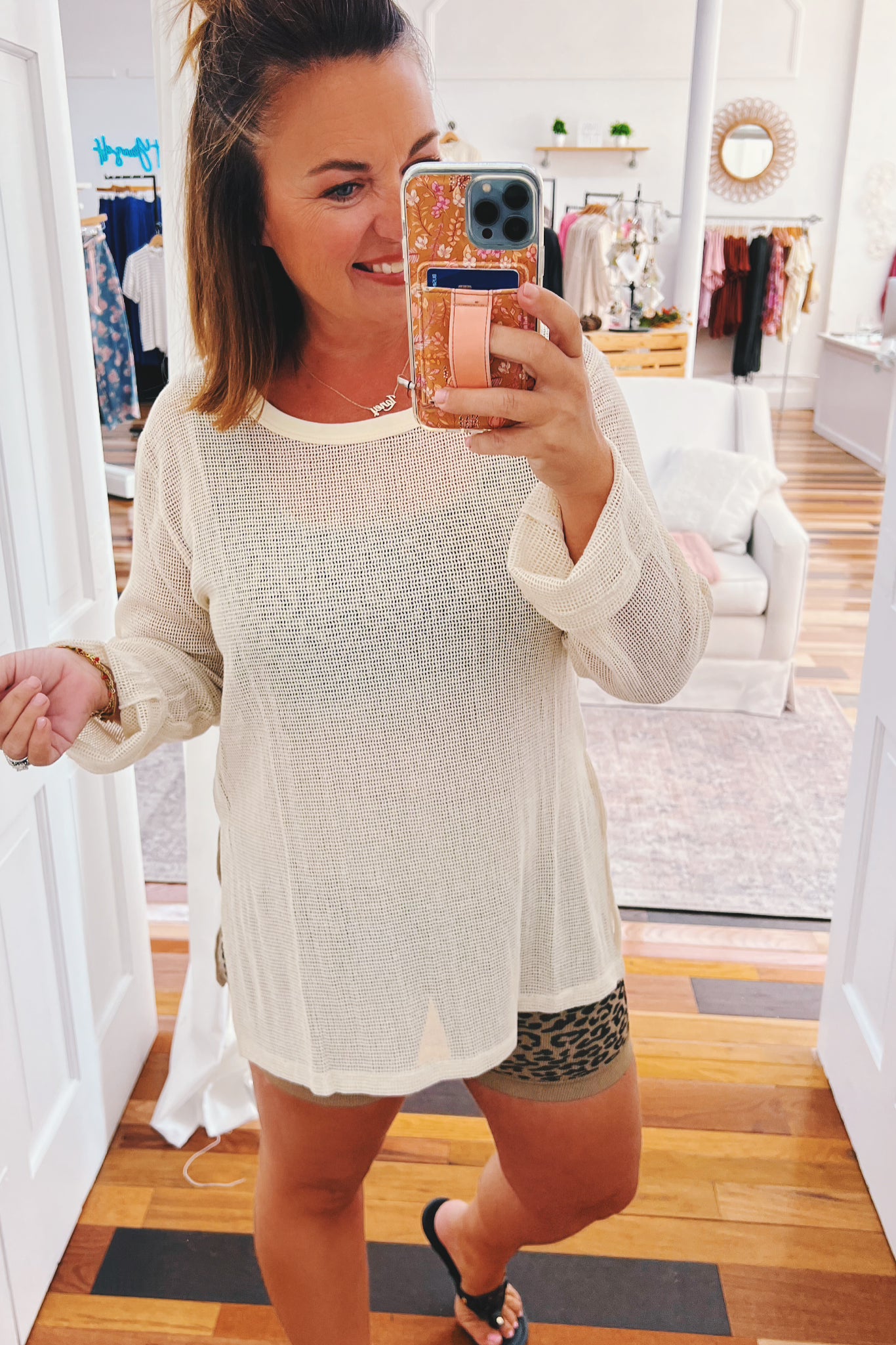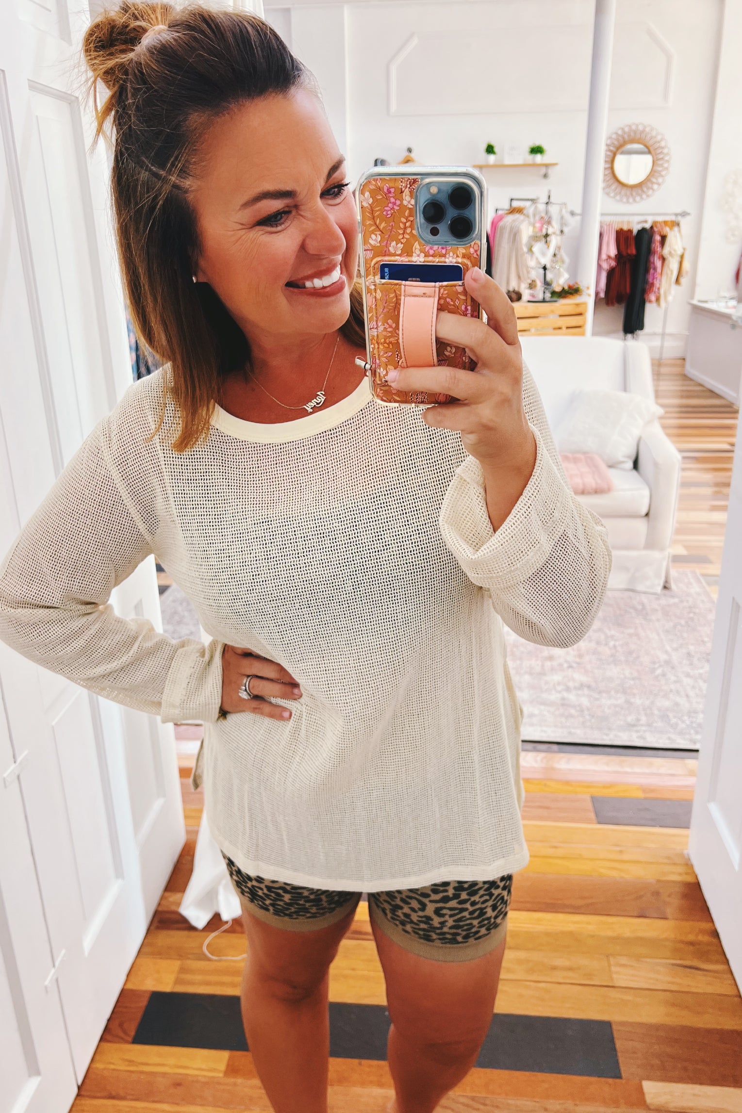 The Brynn Mesh Top in a unique oatmeal hue features a woven mesh knit and playful side slits for added flair. With long sleeves and 100% cotton fabric, this fall layering piece is both breathable and cozy, perfect for mixing comfort with style on crisp autumn days. Pair with your favorite jeans and wedges for a date night or grab the leopard biker and bra set for a FABULOUS weekend outfit.