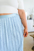 Take your wardrobe to the next level with this maxi-length A-line skirt! Featuring an elastic waistband and high-waisted fit, it's the perfect balance of comfort and style. The cascading ruffles and delicate swiss dot mesh overlay offer an extra stylish twist, sure to elevate any look. Let your style shine with this one-of-a-kind skirt!