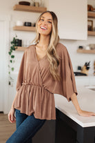 Meet the Dazzlingly Draped V-Neck Blouse! This elevated peplum style is constructed from a gorgeous shimmering bronze fabrication, a surplice front forms the flattering V-neckline. The cased elastic waistband gathers in to create a playful peplum silhouette. Pair with your favorite mini skirt or a pair of denim trousers, this blouse is easy to take from day to night.