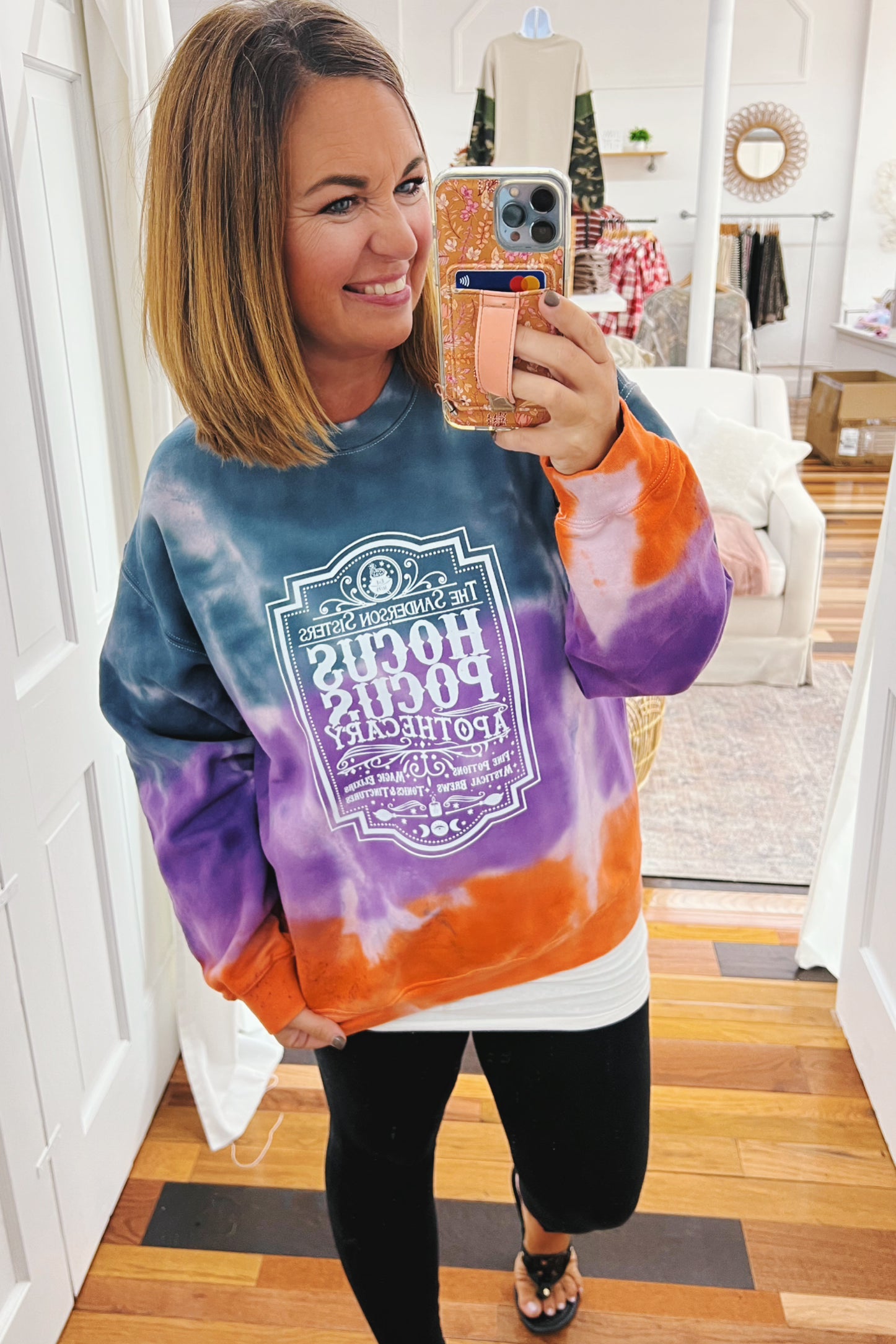 Celebrate Halloween in style with this Halloween Apothecary Sweatshirt featuring a vibrant orange, purple, and gray tie-dye pattern. Designed with a slimmer unisex fit, it’s perfect for Hocus Pocus fans who want to show off their spooky spirit. Cozy, colorful, and a must-have for the season, this sweatshirt adds a playful touch to your fall wardrobe.