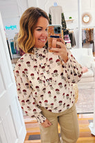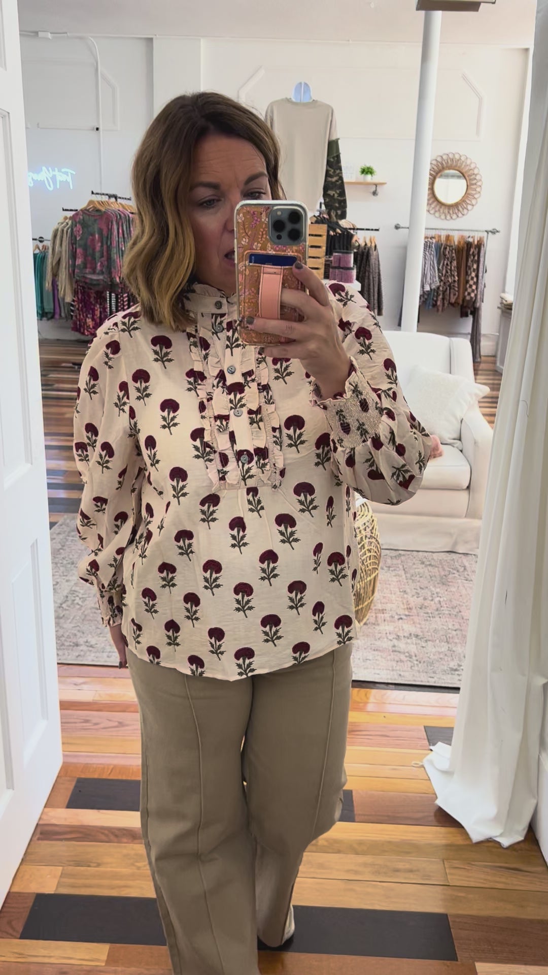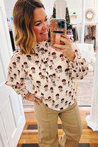 Brighten your wardrobe with the Imogene Floral Ruffle Trim Top in ecru, adorned with charming burgundy floral prints. Its playful ruffle trim adds a touch of vintage sophistication, making this piece both timeless and classic. Perfect for those who love a little flair with their everyday style!