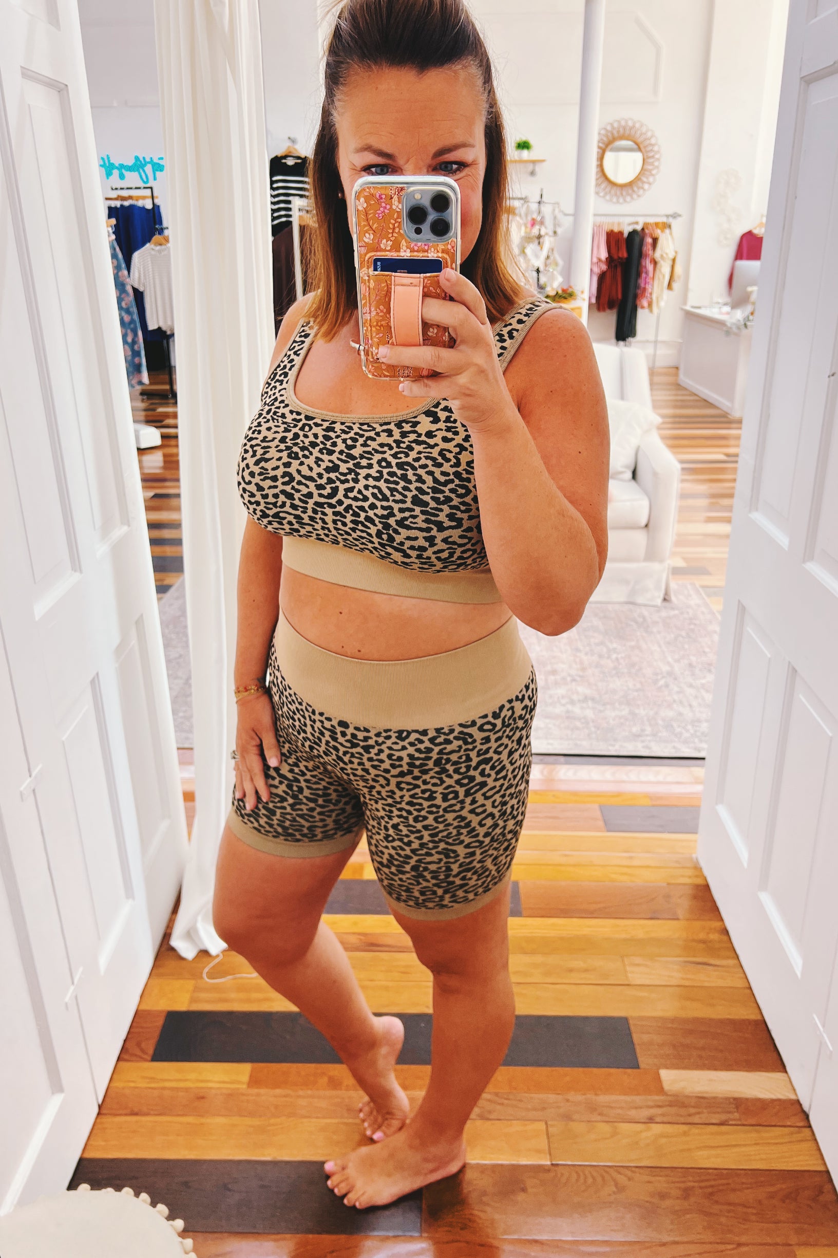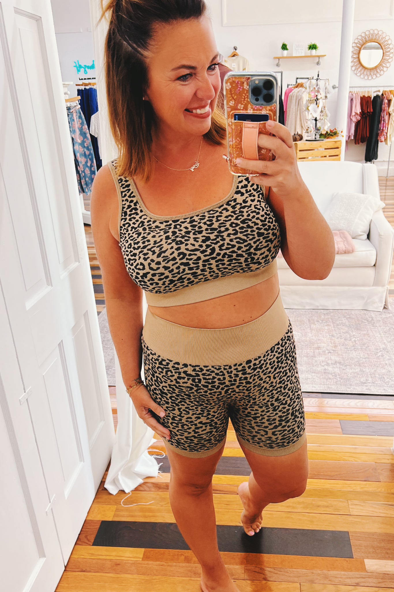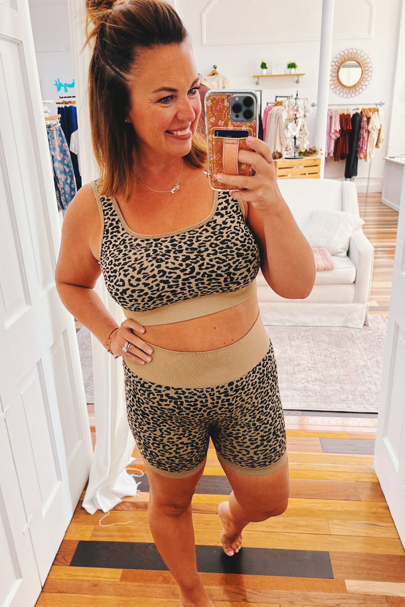 The Lily Cheetah Biker & Bra Set combines brown and camel cheetah print with comfy, stretchy knit fabric. Featuring built-in bra pads, this playful set is perfect for layering, whether you're working out or lounging around in style. You will grab this set first when traveling, hitting the practice fields or playing chauffeur for your kids. Layer with the Brynn mesh Top or your favorite oversized sweatshirt.