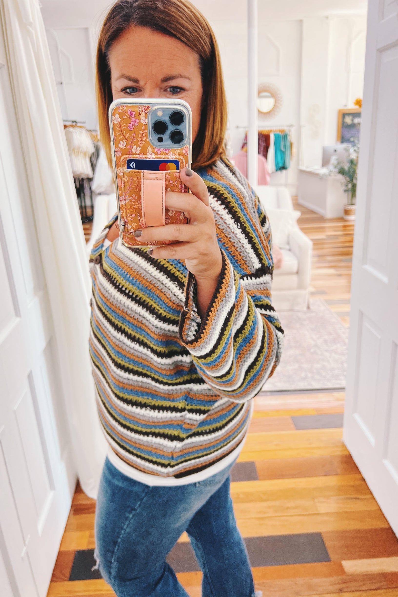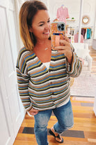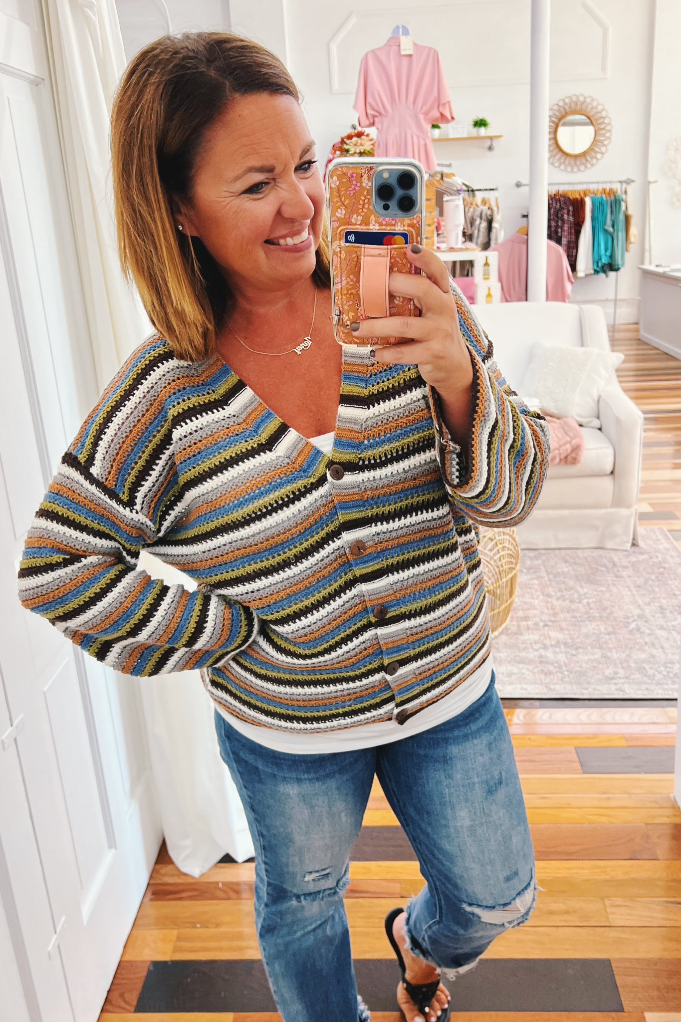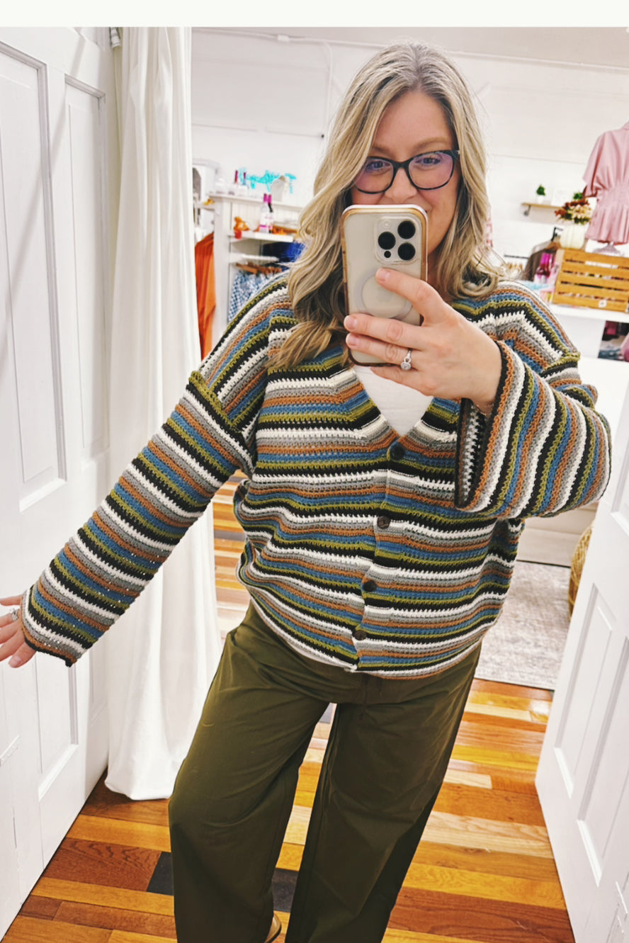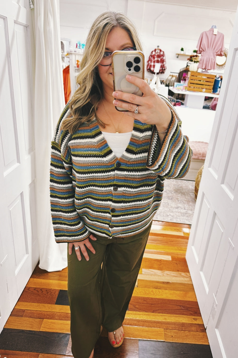 Bring retro vibes to your wardrobe with the Lottie Multicolor Knit Cardigan. Featuring a classic button-front design, wide sleeves, and cozy crochet knit, this cardigan offers a roomy fit that’s perfect for layering. Its vintage colors and timeless style make it a fun and comfortable addition to any outfit. Pair it with our Olive Green Chinos for a perfect outfit!