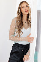 Make waves in the Pearl Diver Layering Top! This mesh long sleeve top is embellished with faux pearls and rhinestones, creating a unique and eye-catching look. Perfect for layering, this on-trend piece will add just the right amount of sparkle and texture to any outfit. Dive deep and stand out!