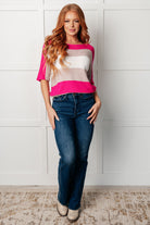 Introducing our Rows Of Rose Short Sleeve Knit Top, featuring a mid-weight sweater knit with a boat neckline, dolman sleeves, and an exaggerated ribbed hemline. Made from high stretch fabric for maximum comfort and style. Perfect for adding some playful flair to your wardrobe.