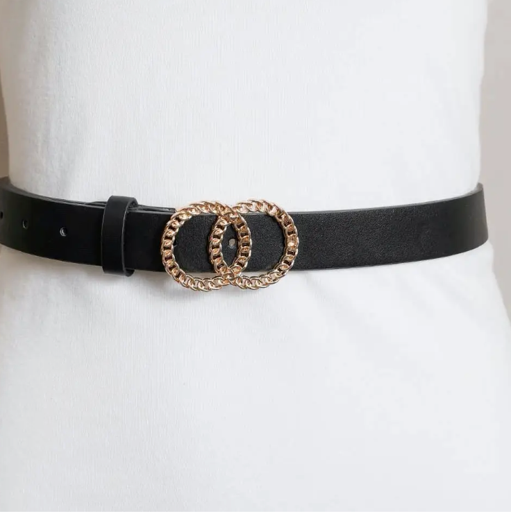 This golden belt features a stylish double chain design with an elegant ring buckle, making it the ultimate statement piece. Ideal for adding a touch of glam to your wardrobe, this trendy belt is versatile enough for both casual and dressy occasions. Whether you're heading out for a night on the town or looking to enhance your everyday style, this fashionable belt is a must-have accessory.