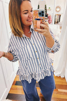 Slide into the Juliette Washed Terry Knit Pants for ultimate comfort with a playful twist. These oversized, wide flowy-leg pants in a soft blueberry mineral wash feature an elastic waist and charming side pockets with bow ties, blending cozy French terry fabric with breezy style perfect for relaxed days. We love these paired with our striped ruffle top.