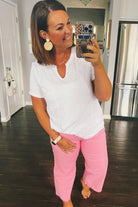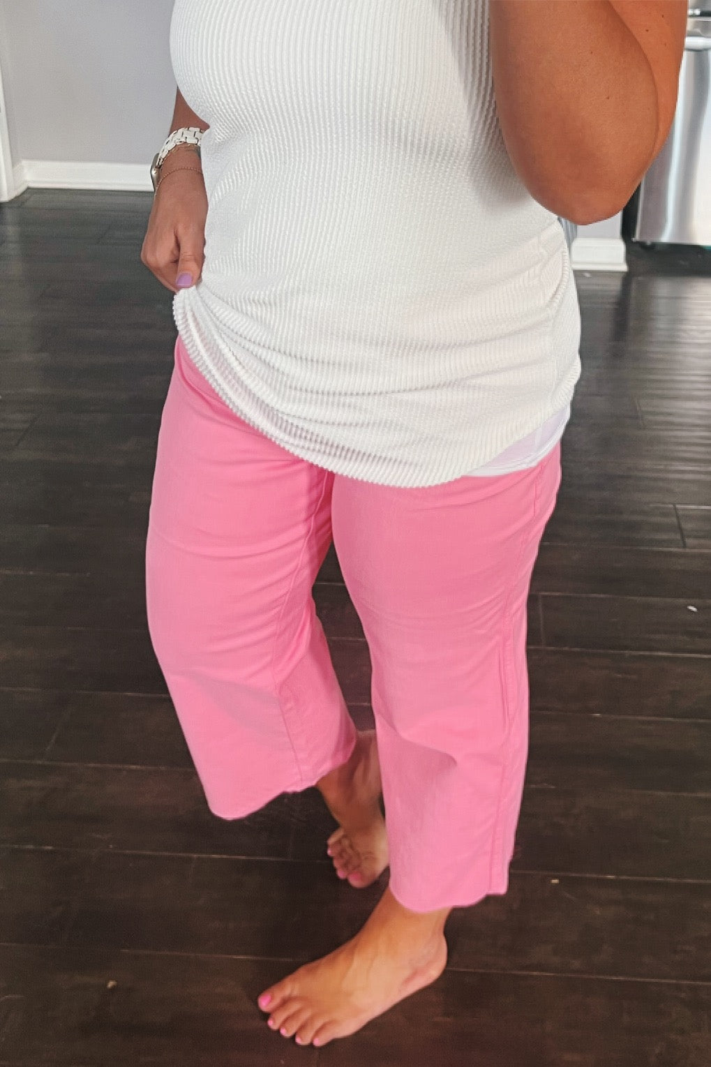 Slip into style and comfort with our Lorraine High Rise Control Top Crop Jeans from Judy Blue. Featuring tummy control technology and 4-way stretch, these jeans provide a flattering fit. The wide leg crop and raw hem add trendy details, while the fun pink color will brighten up any outfit. Garment dyed for lasting color.