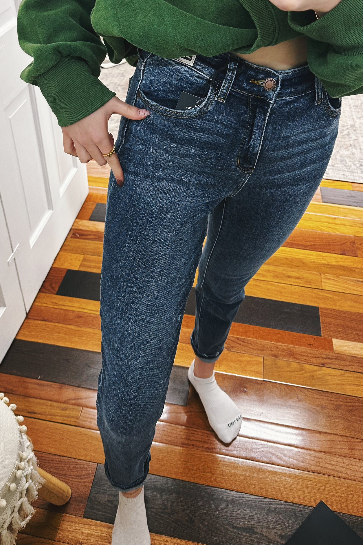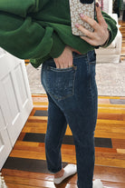 These boyfriend jeans are your new casual essential. The dark wash gets a fun twist with bleach splatter details that give off effortless, lived-in vibes. With a mid-rise fit and super stretchy fabric, they're comfortable enough for all-day wear while keeping that classic denim look. Perfect for pairing with everything from tees to oversized sweaters.
