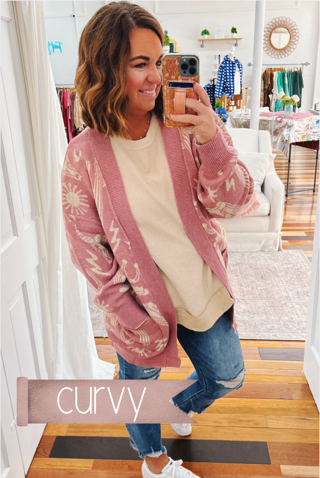 Meet Alaina, the cardigan that brings Western flair to your everyday rotation. This oversized mauve knit features a bold western print that is perfectly on trend. Soft, stretchy fabric keeps you cozy while the oversized fit keeps things comfortable. The open front design lets you layer it however you like, and functional front pockets are perfect for keeping essentials close. Throw it over a tee, dress it up with a chambray dress.