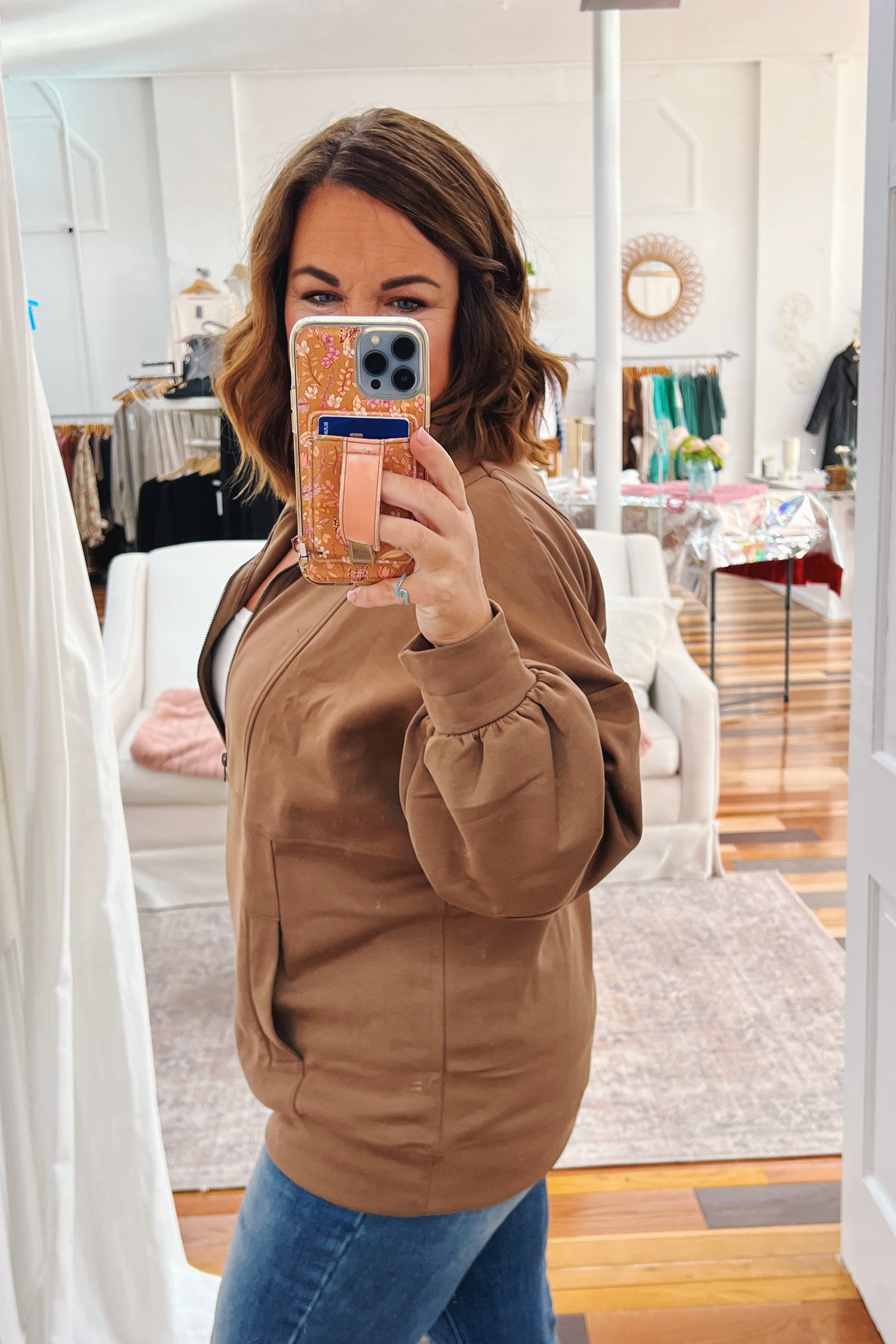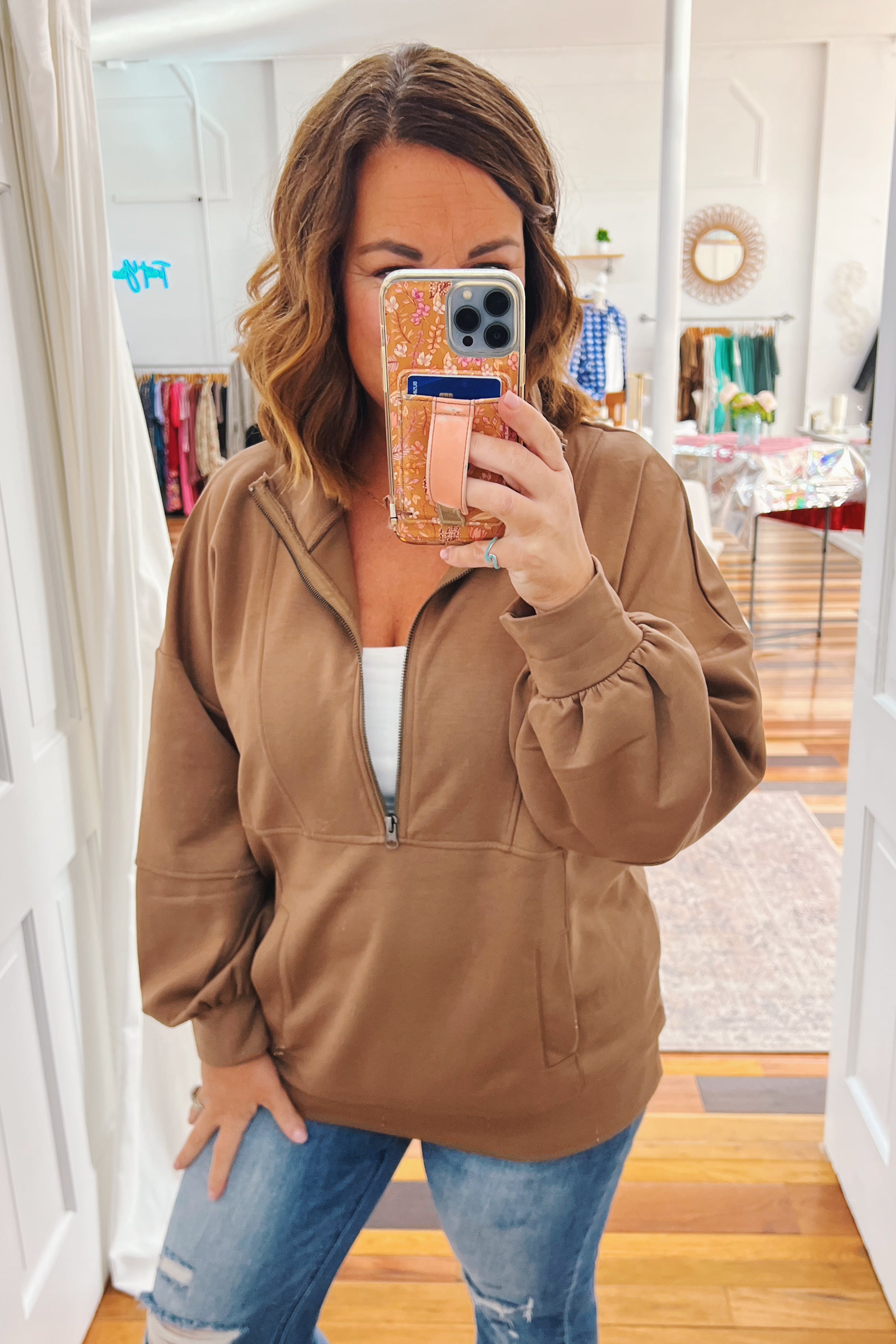 The Doris half zip is your new weekend uniform. Made from buttery scuba knit that feels like a cloud against your skin, this oversized sweatshirt features a cozy mock neck and functional kangaroo pocket—perfect for keeping your hands warm or your phone close. The silky-soft fabric hangs perfectly while the relaxed fit keeps things effortlessly chic. Whether you're lounging at home or running errands, this mocha essential pairs with everything and feels as good as it looks.