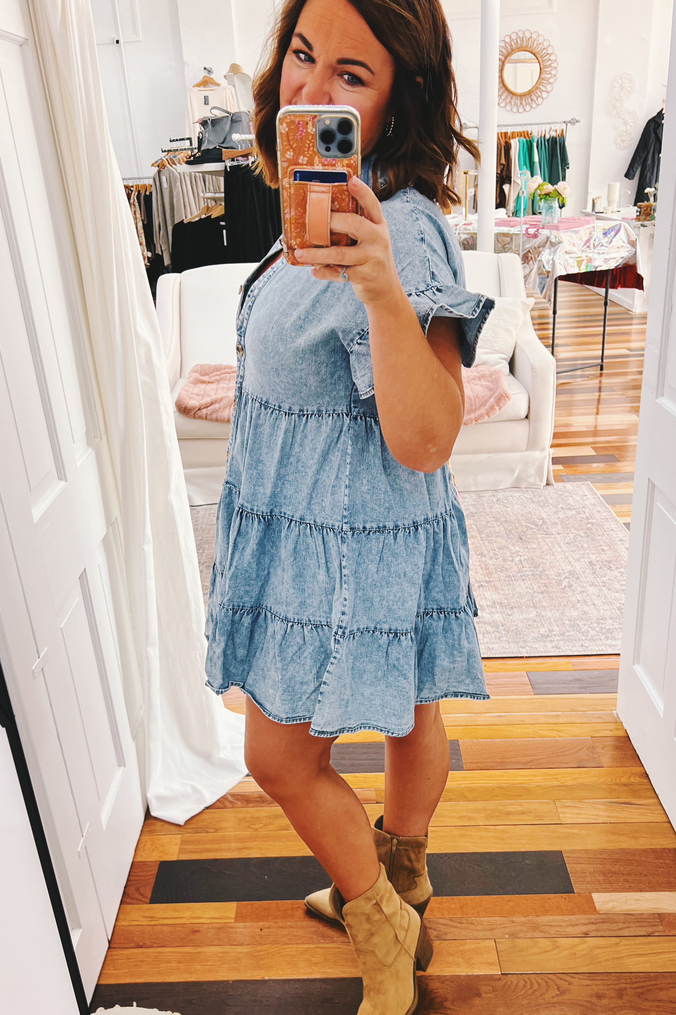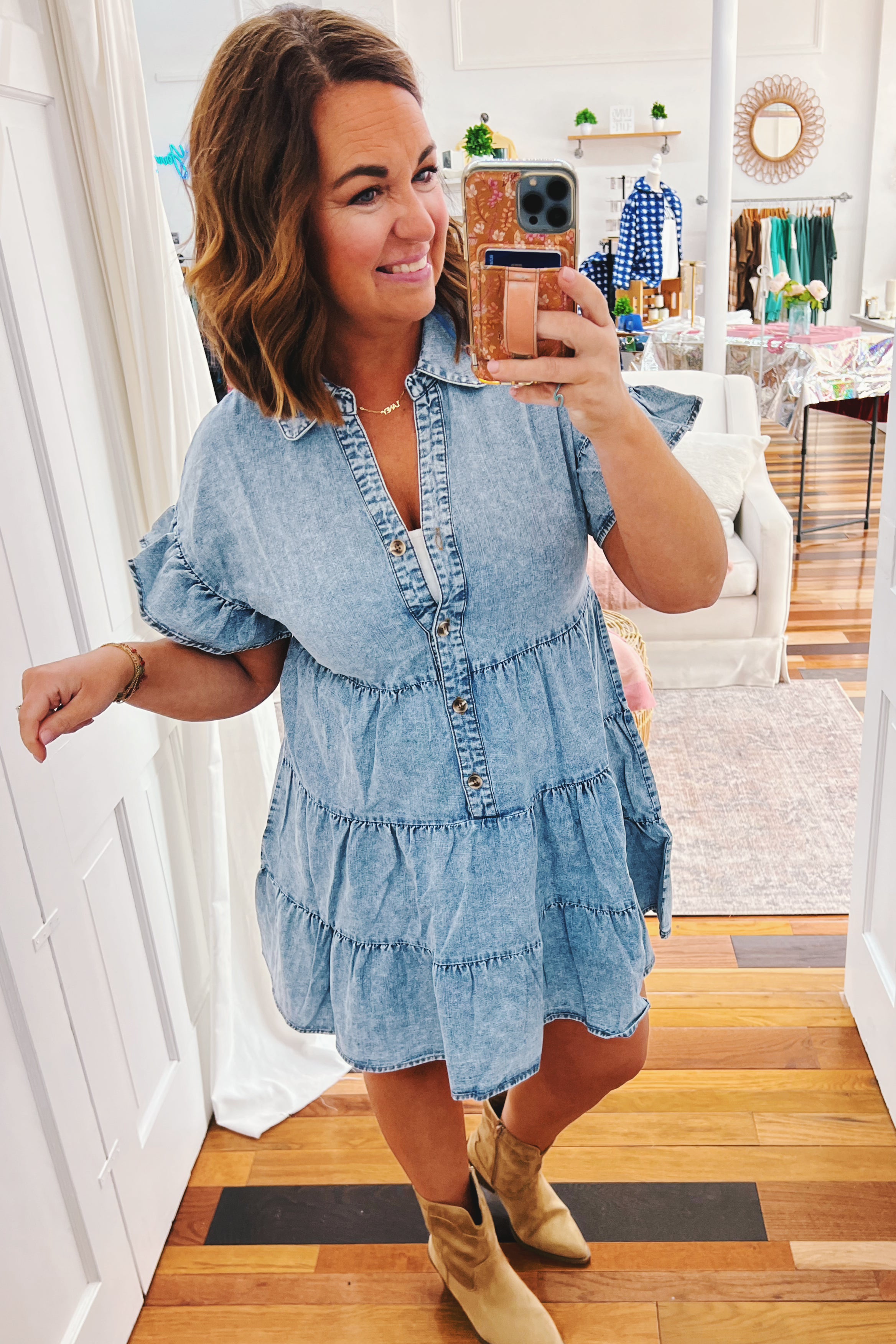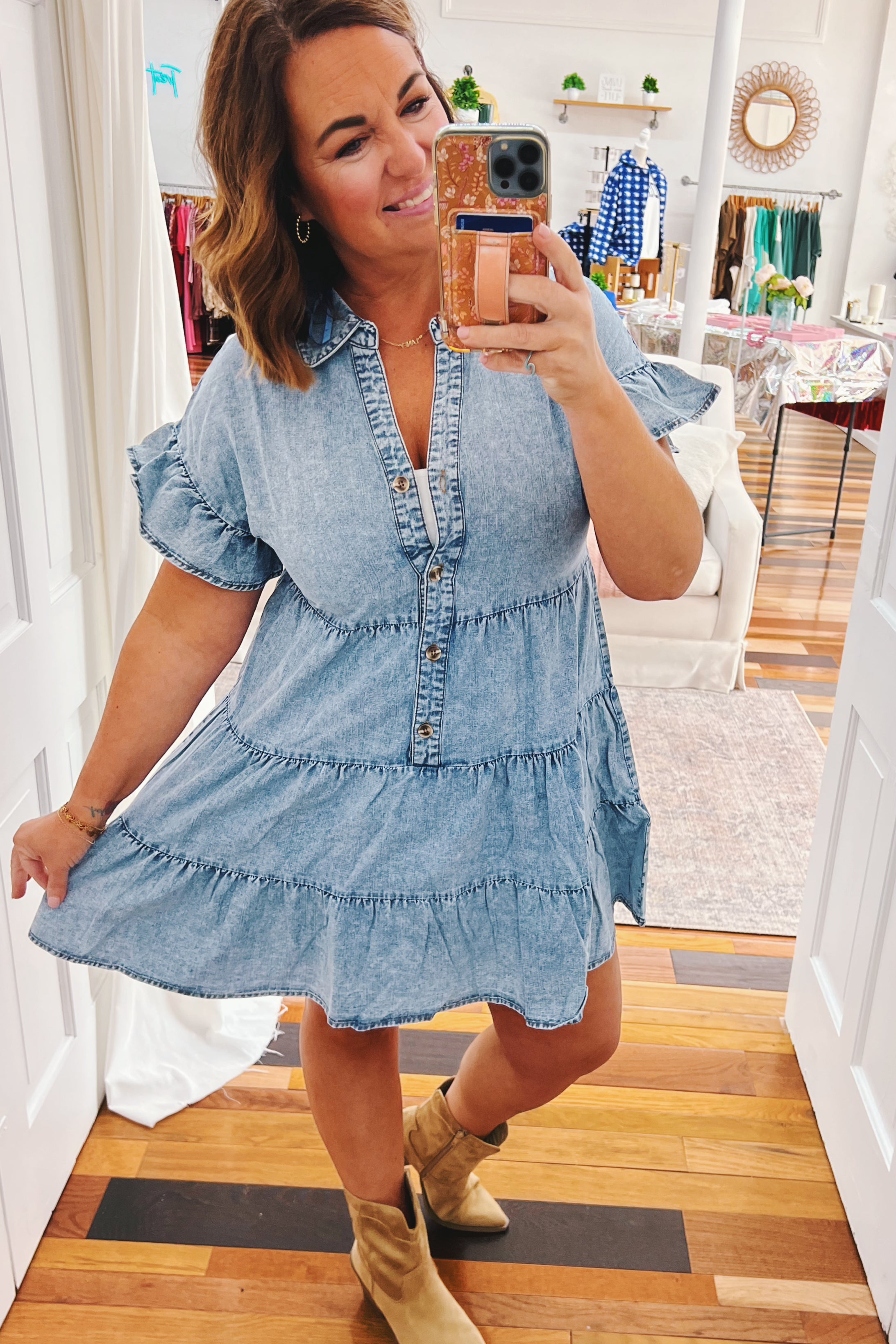 Say hello to Pippa, your new go-to for effortless charm. This medium wash chambray mini dress features a classic half button front that lets you style it your way—button it up for polished or leave it open for a relaxed vibe. The tiered skirt adds playful movement and a western vibe, creating a flattering silhouette that's equal parts cute and comfortable. Whether you're dressing it up with boots or keeping it casual with sneakers, Pippa delivers that perfect vibe you crave.