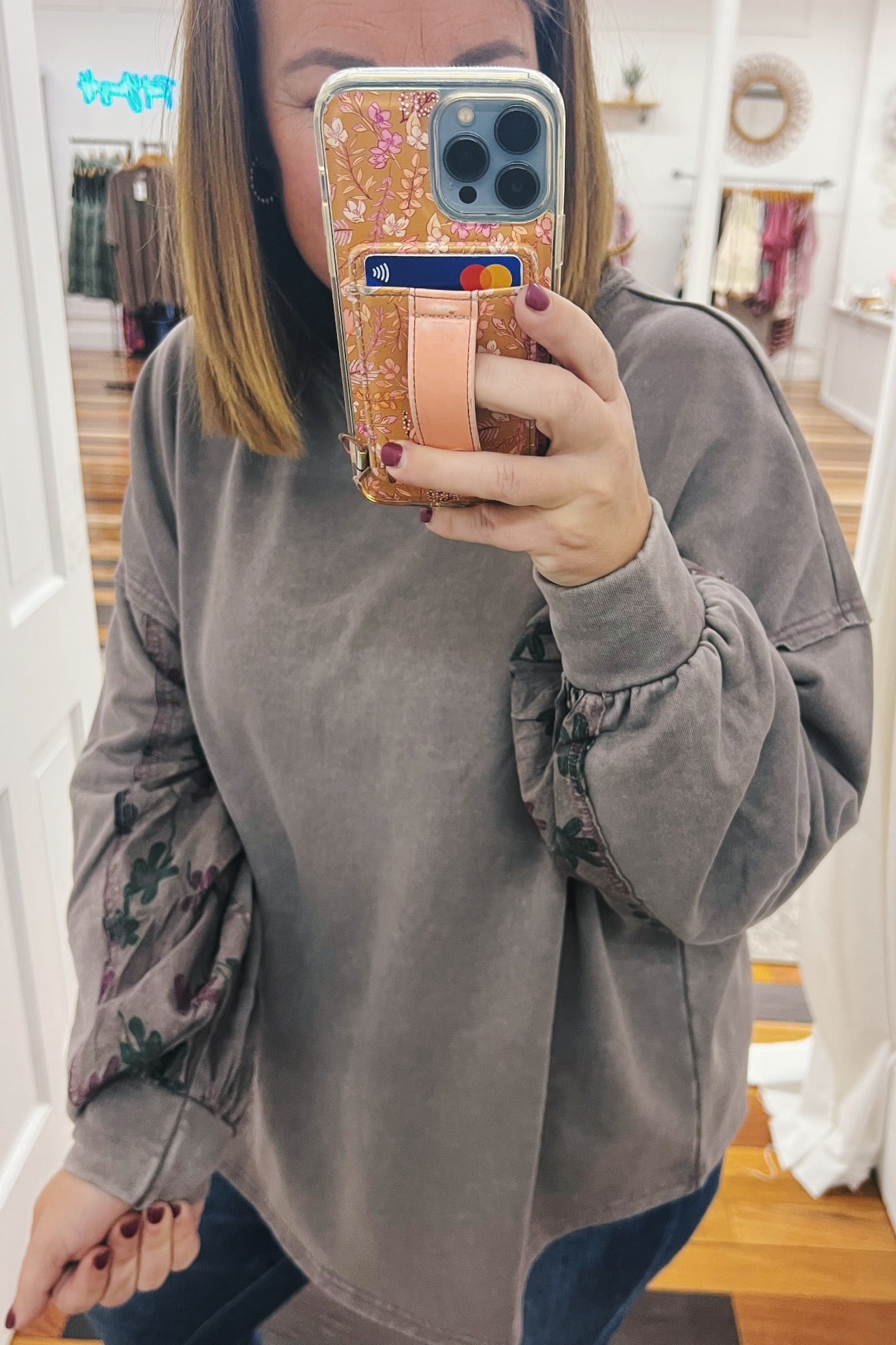 • mocha french terry mineral wash pullover with floral accent sleeves