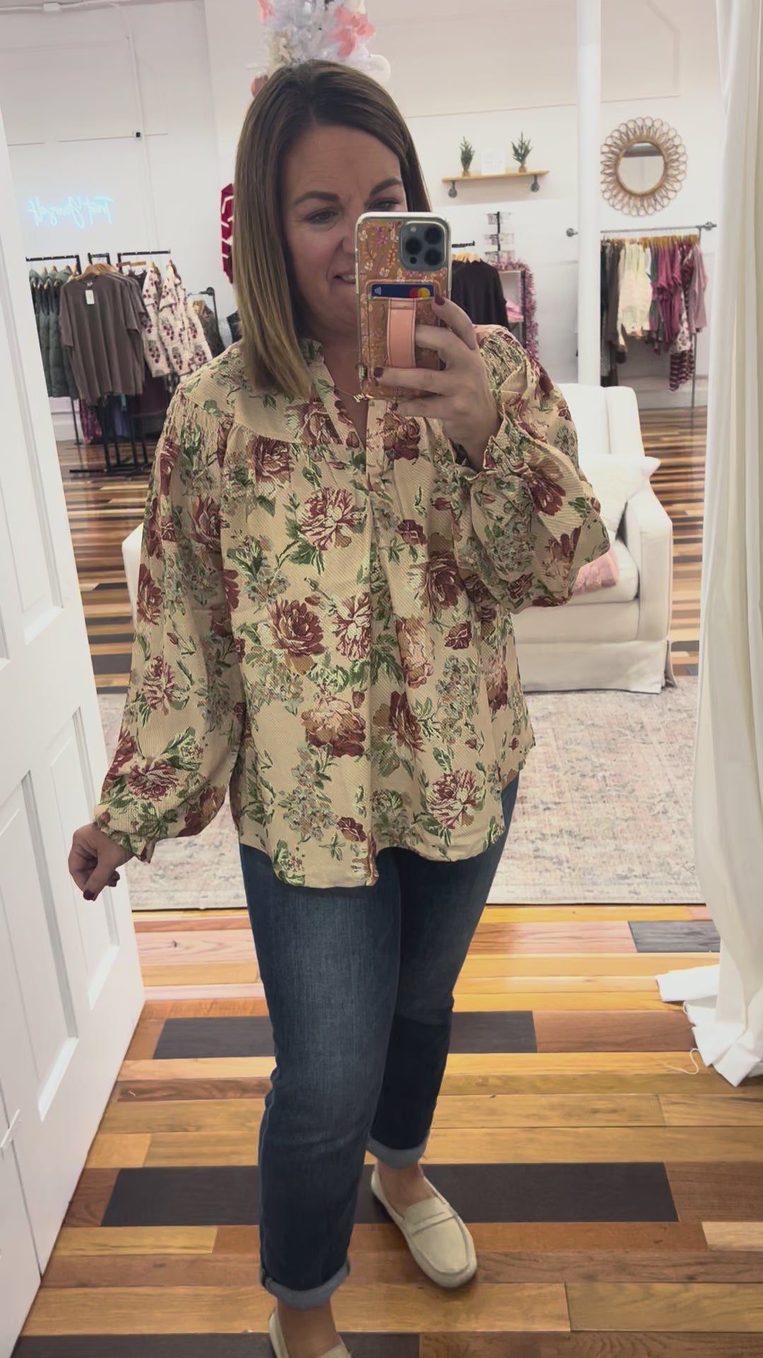 Introducing the Jocelyn Smocked Shoulder Floral Top—your new go-to for effortless elegance. This gorgeous piece features a timeless vintage floral print in soft, muted tones that pairs beautifully with everything in your closet. The smocked shoulders and elastic cuffs create a flattering, flowy silhouette that leaves you feeling so pretty. Whether you're gathering around the table this Thanksgiving or heading out for a casual weekend adventure, this top delivers comfort without compromising on style. It's the kind of piece that makes you feel put-together without even trying.