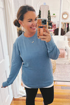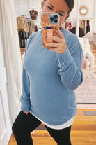 This Karla Ribbed Dolphin Hem Top in Blue is the perfect addition to your wardrobe! Its long sleeve design and ribbed knit material provide both comfort and style. The dolphin hem and longer length make it perfect with leggings, while the slimmer relaxed fit is key for layering. This top is a must have!!