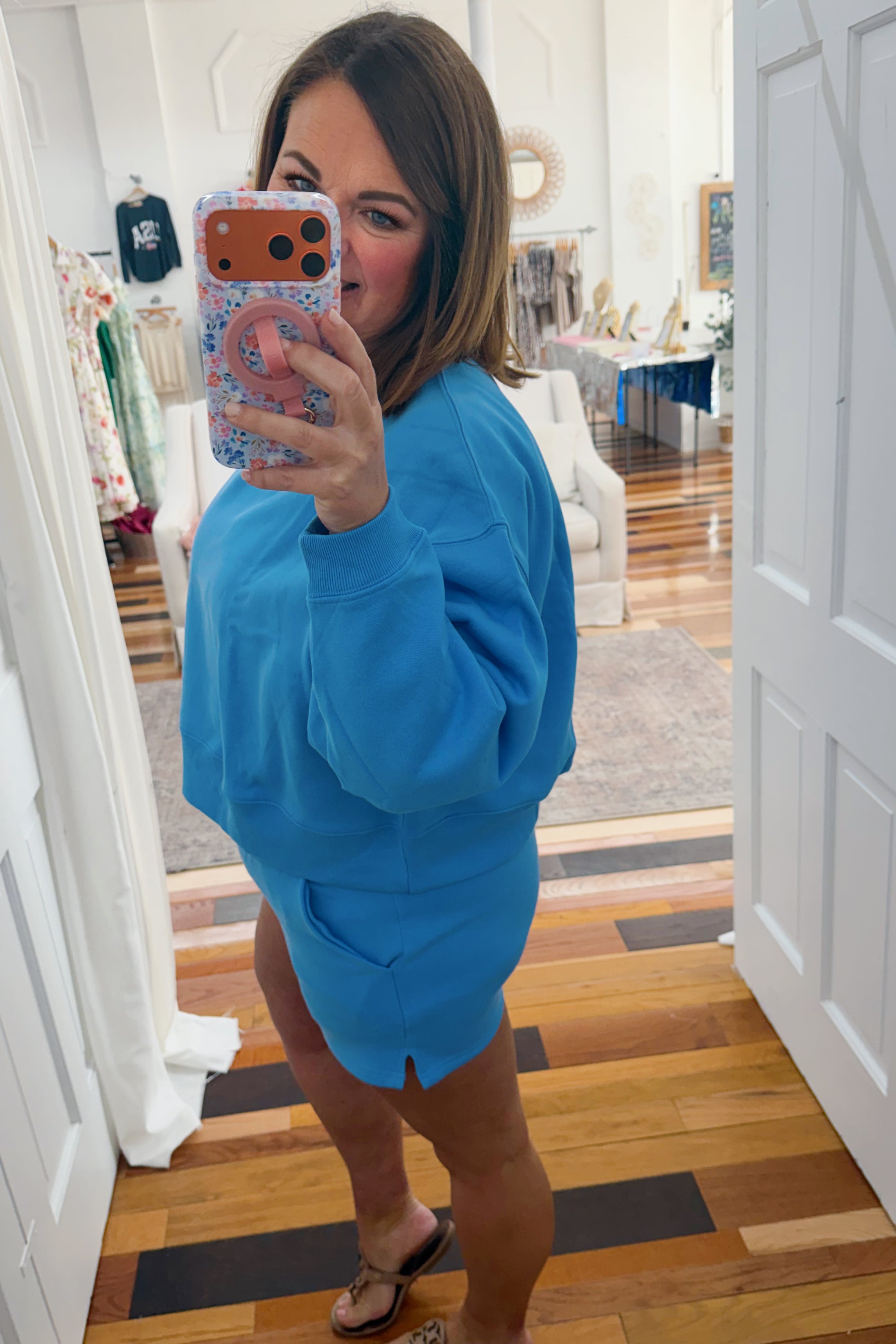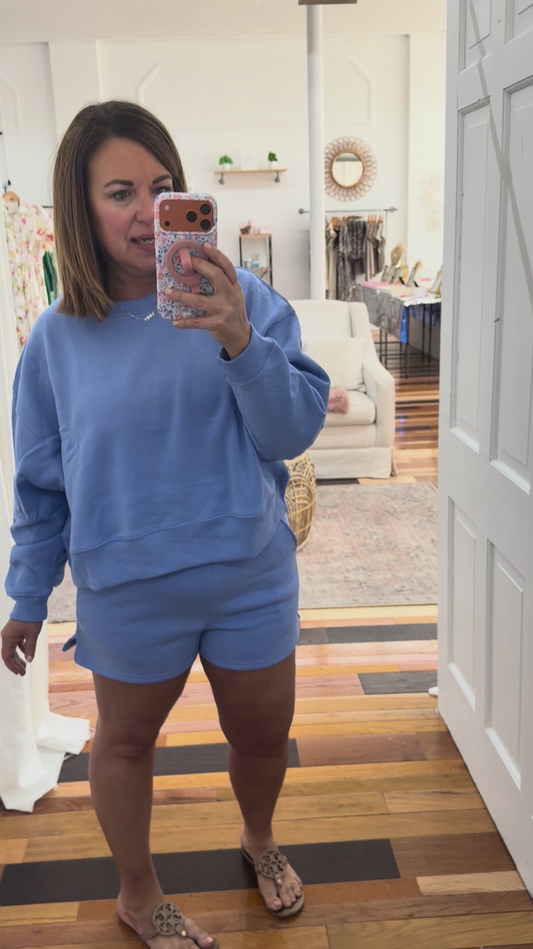 - cornflower blue fleece shorts and sweatshirt set