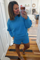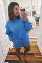 Cozy up in this trendy two-piece fleece set featuring a soft sweatshirt and matching shorts. Perfect for lounging or casual outings, the plush fleece fabric in a gorgeous cornflower blue keeps you comfortable all day long. The coordinated blue pieces create an effortless, put-together look that's both stylish and relaxed. Ideal for anyone who values comfort without compromising on style.