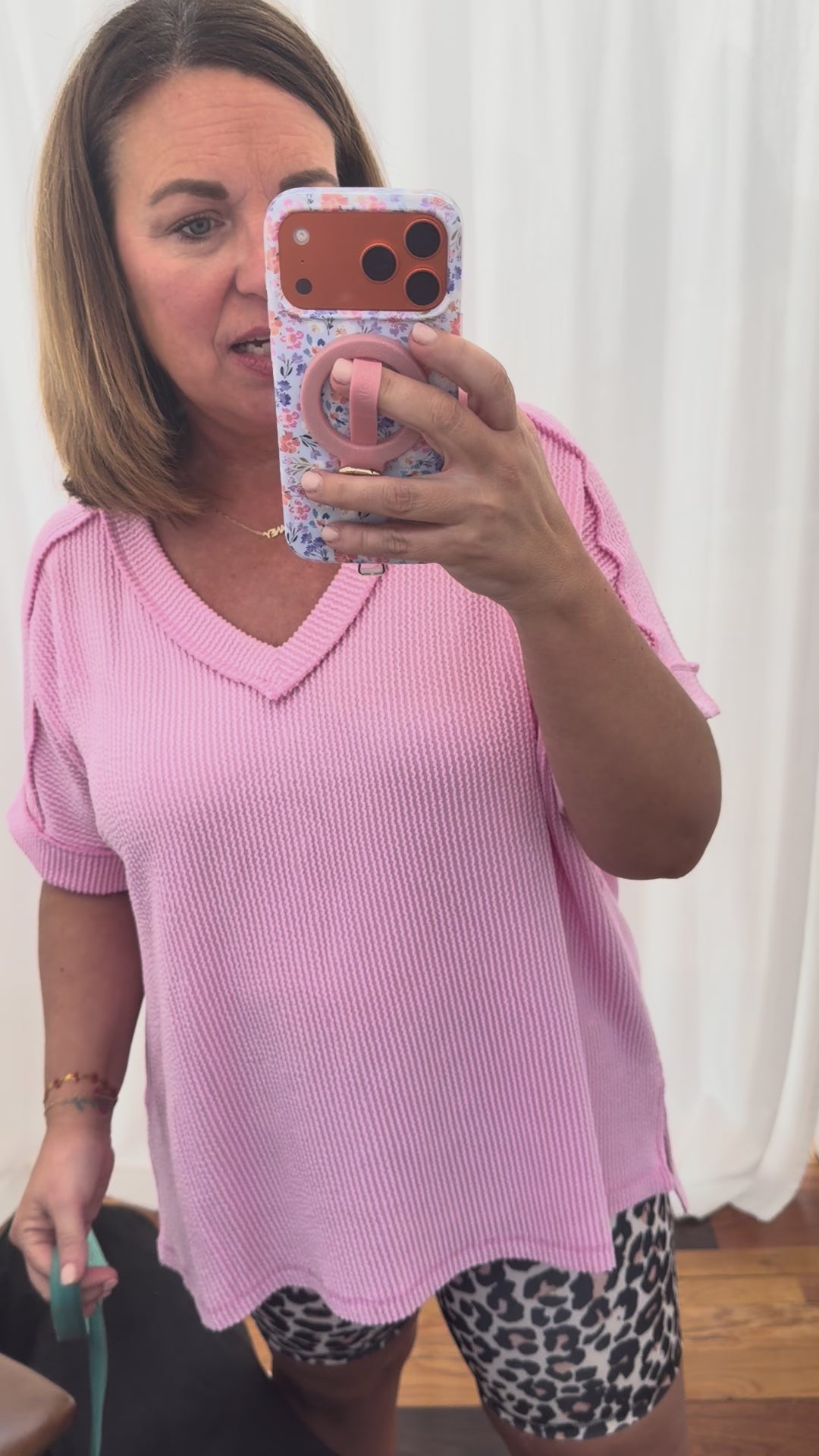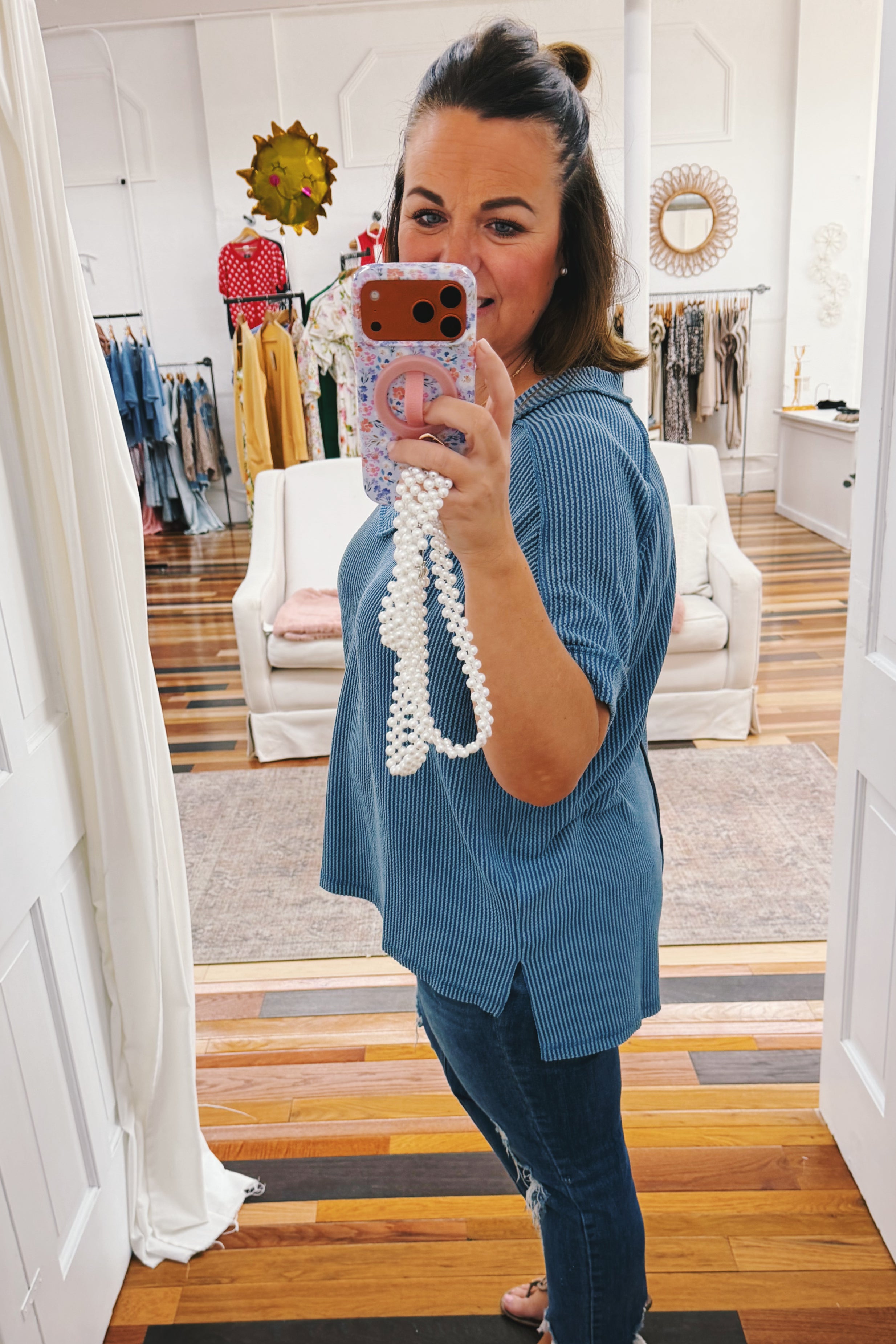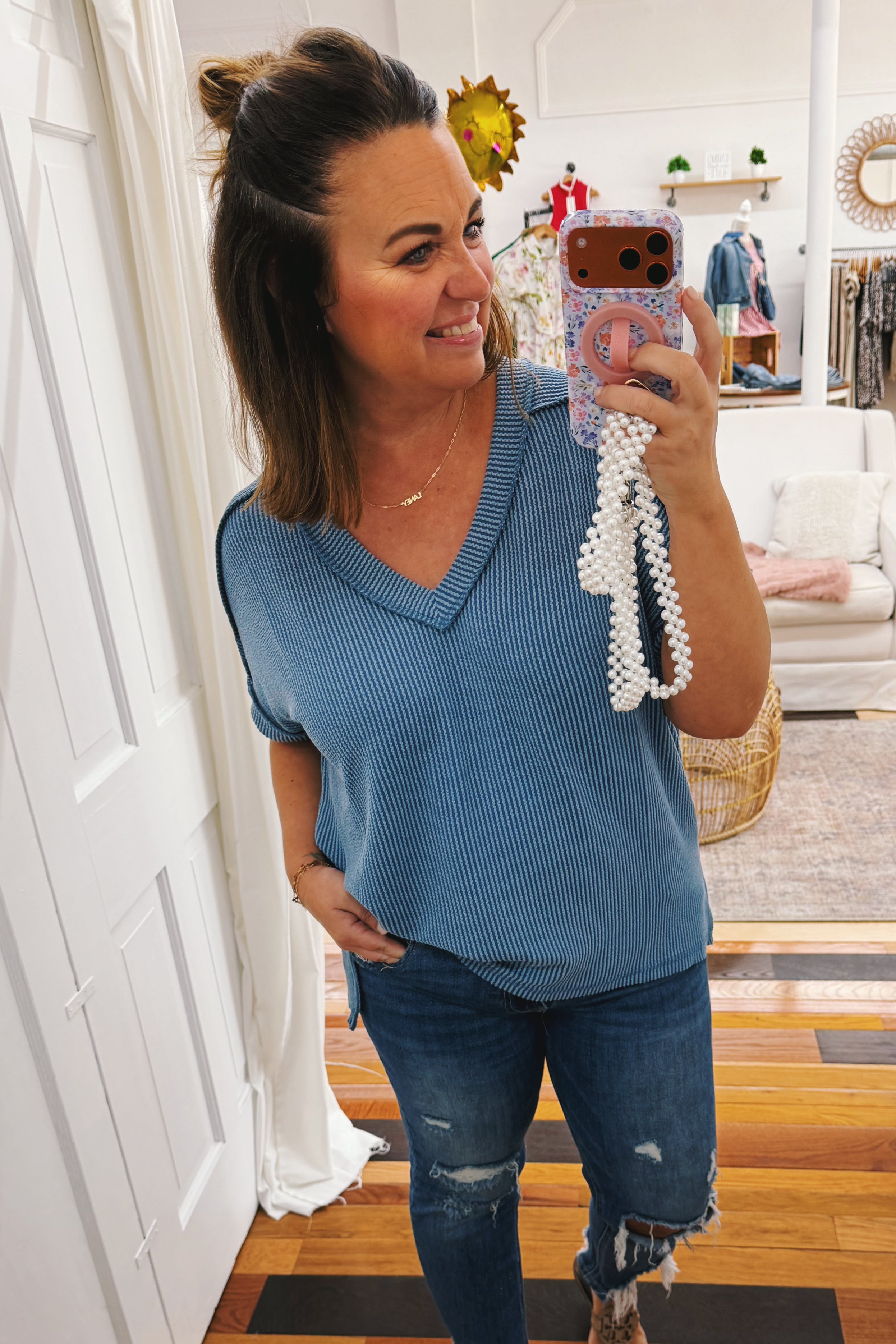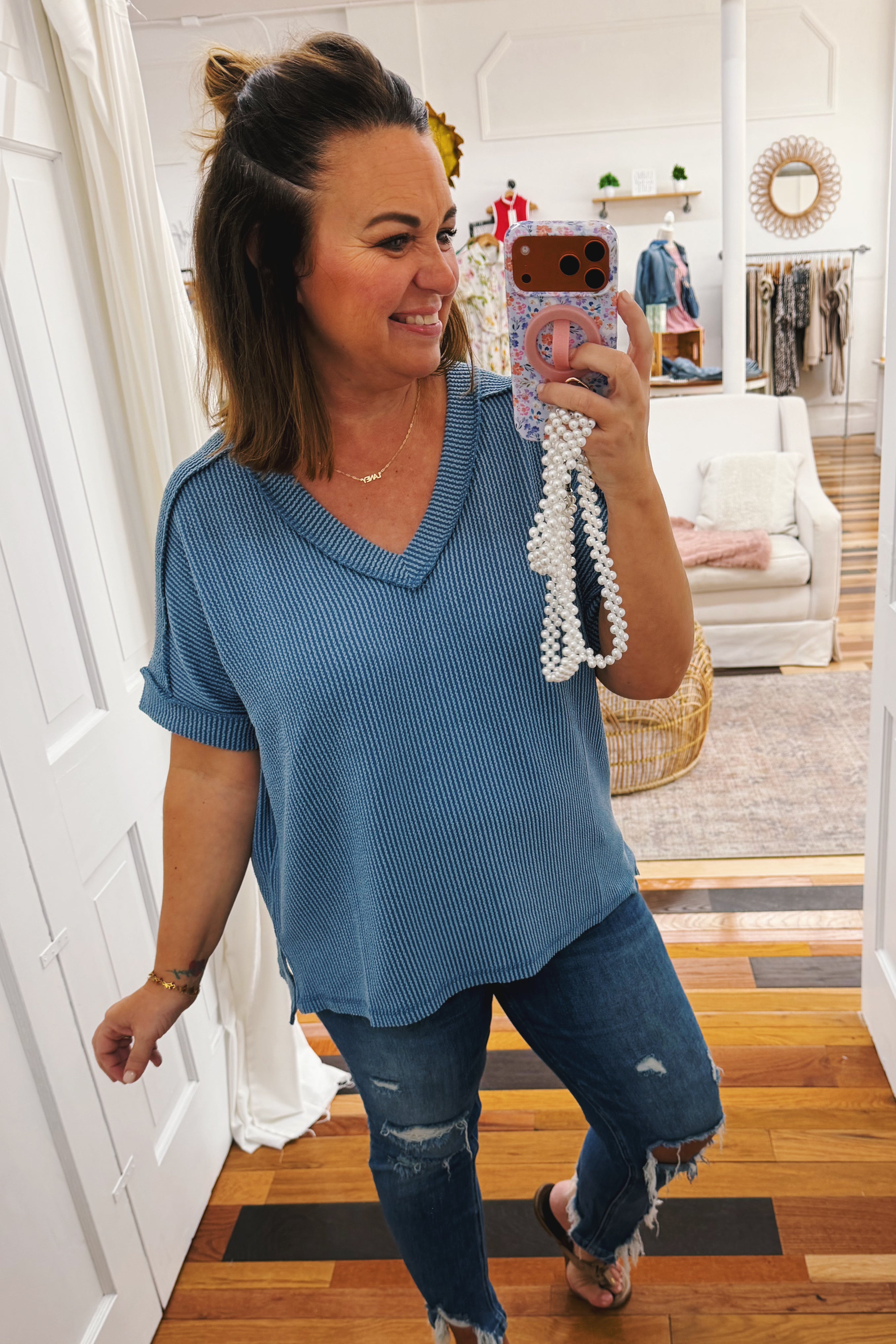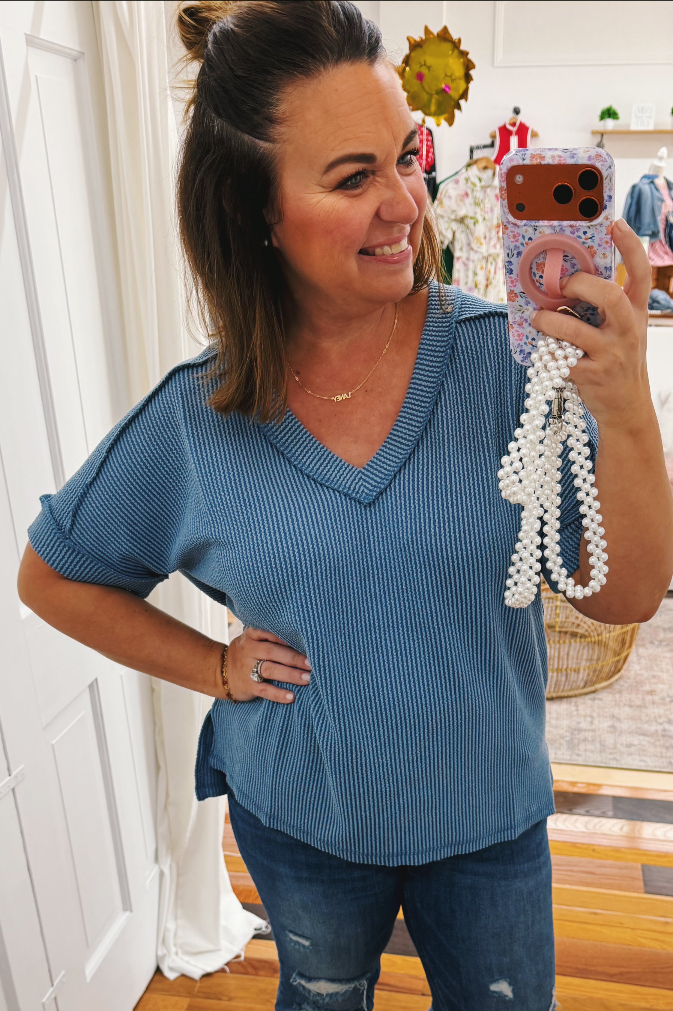 The Liza Exposed Seam Vneck Top in a trendy dusty blue is a fan favorite for good reason. Its soft, ribbed fabric stretches comfortably, while the playful exposed seams and side slits add a trendy edge. The flattering V-neck makes it easy to style for any casual day or night out.