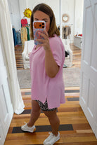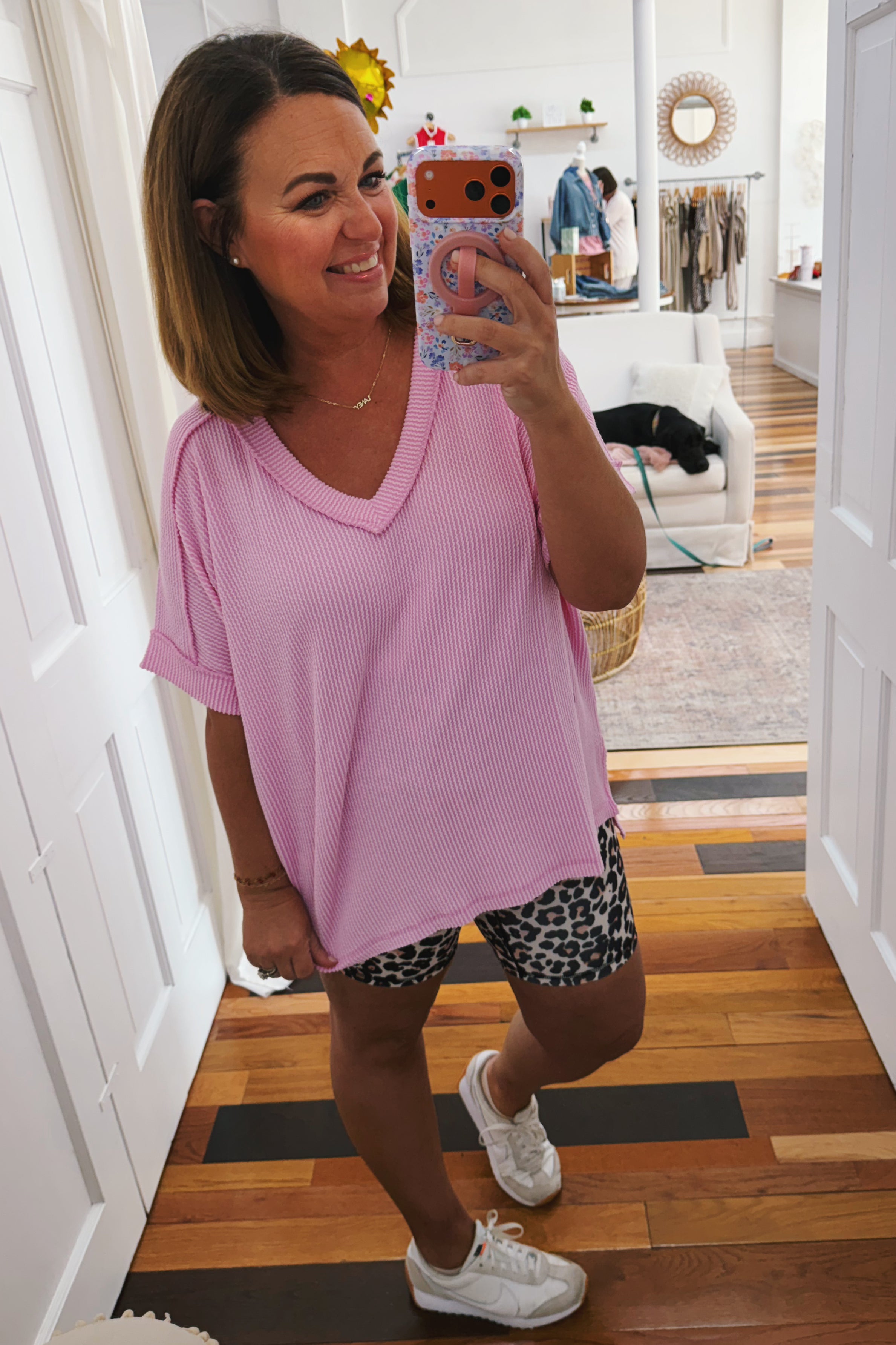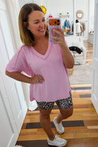 The Liza Exposed Seam Vneck Top in pink is a fan favorite for good reason. Its soft, ribbed fabric stretches comfortably, while the playful exposed seams and side slits add a trendy edge. The flattering V-neck makes it easy to style for any casual day or night out.