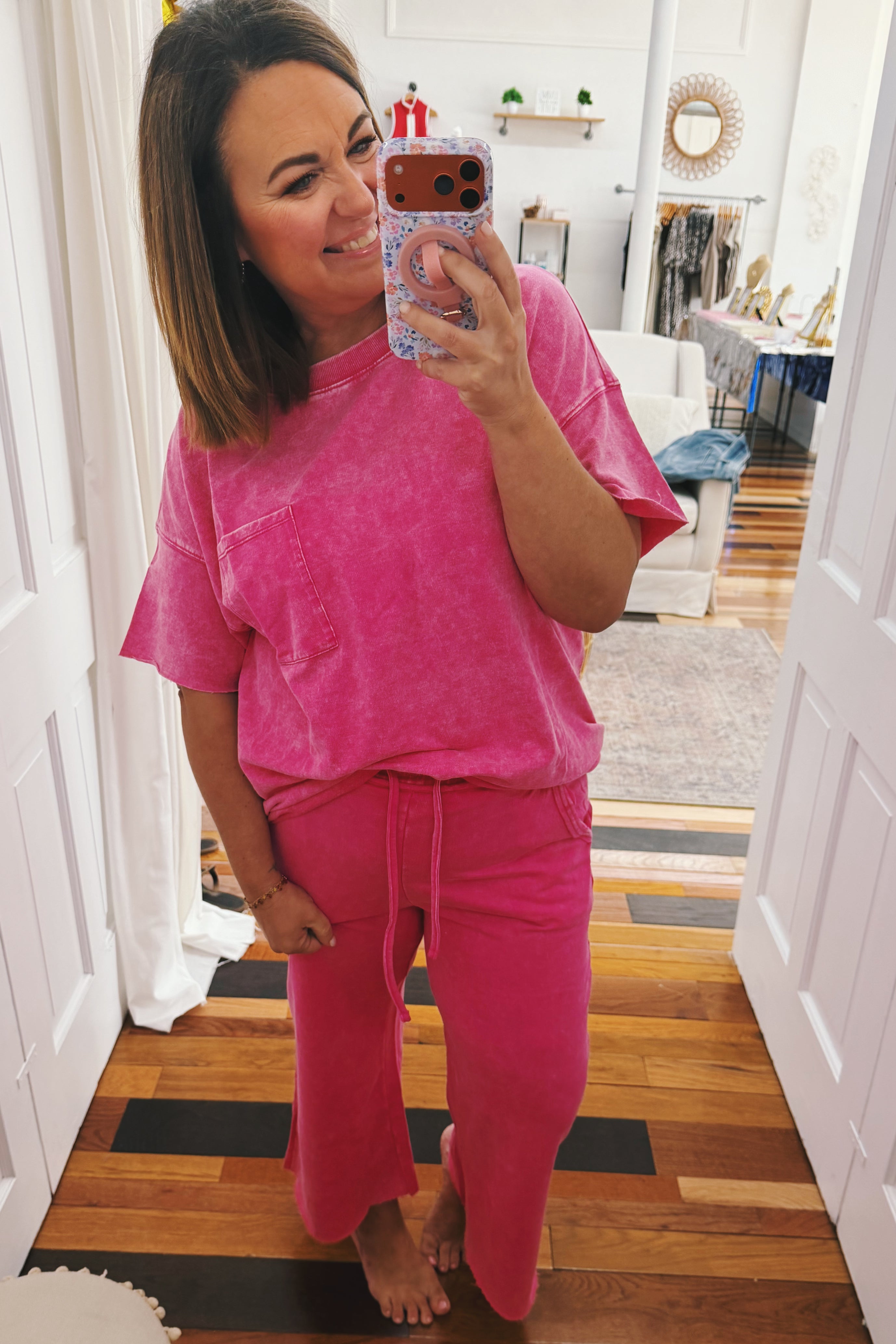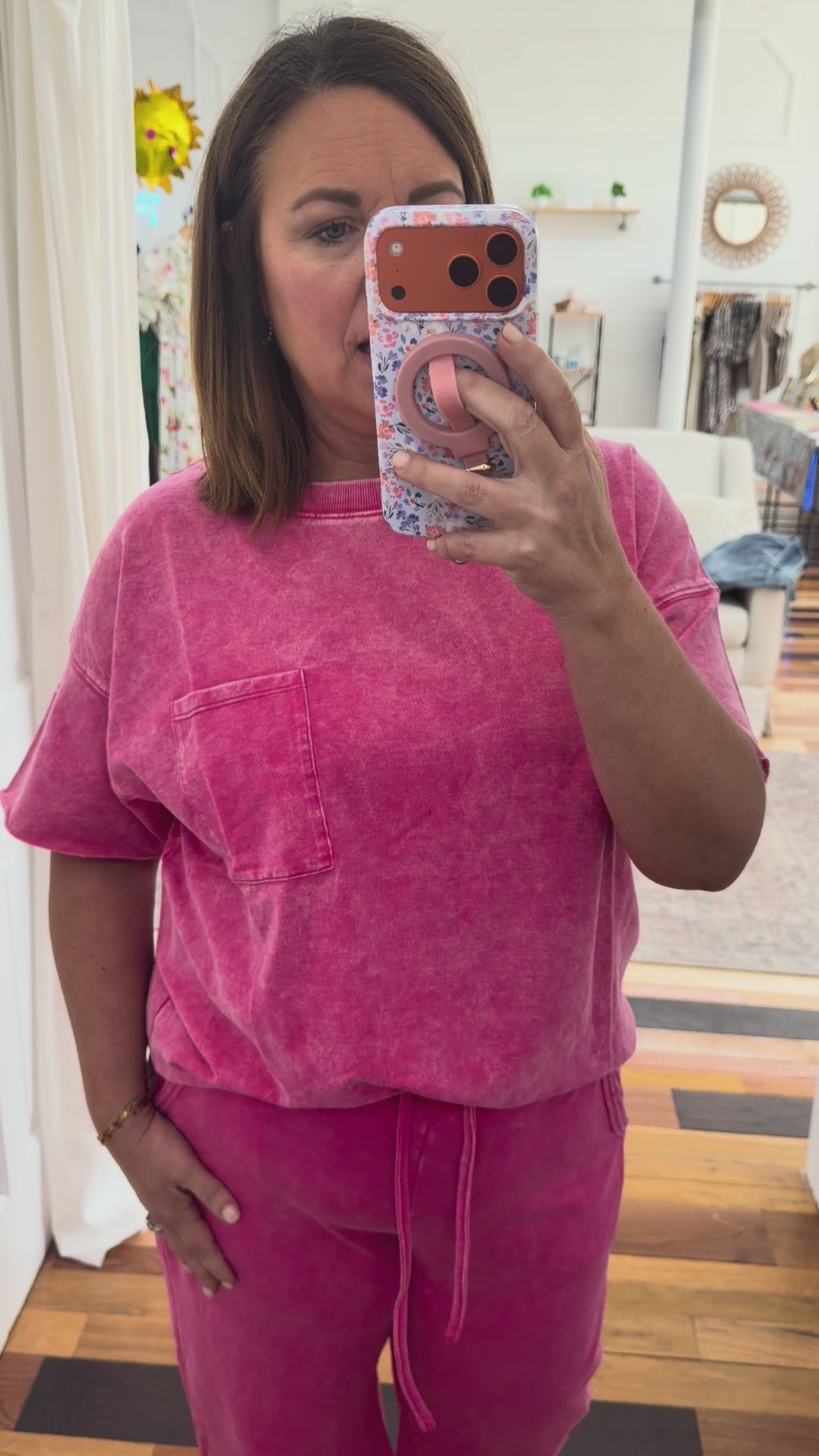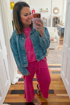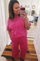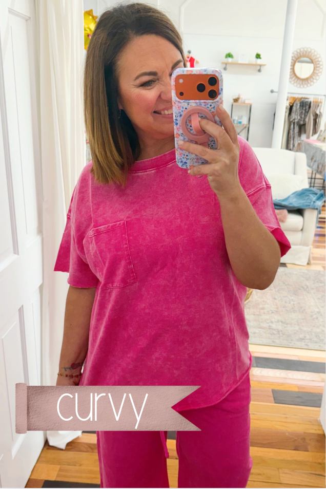 Your new favorite weekend uniform just arrived. This mineral wash French terry top is soft, slouchy, and unapologetically chill—throw it on with matching palazzo pants and you're basically ready for anything. Chest pocket? Check. Hot pink that actually pops? Double check. Perfect for coffee runs, lazy Sundays, or pretending you have your life together. Spoiler: you don't need to.