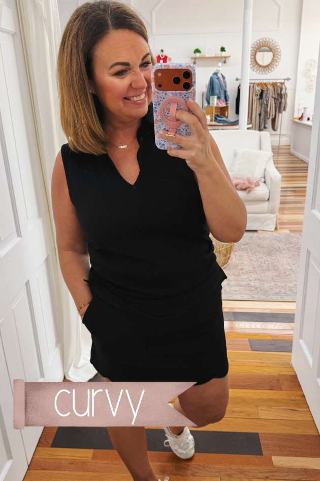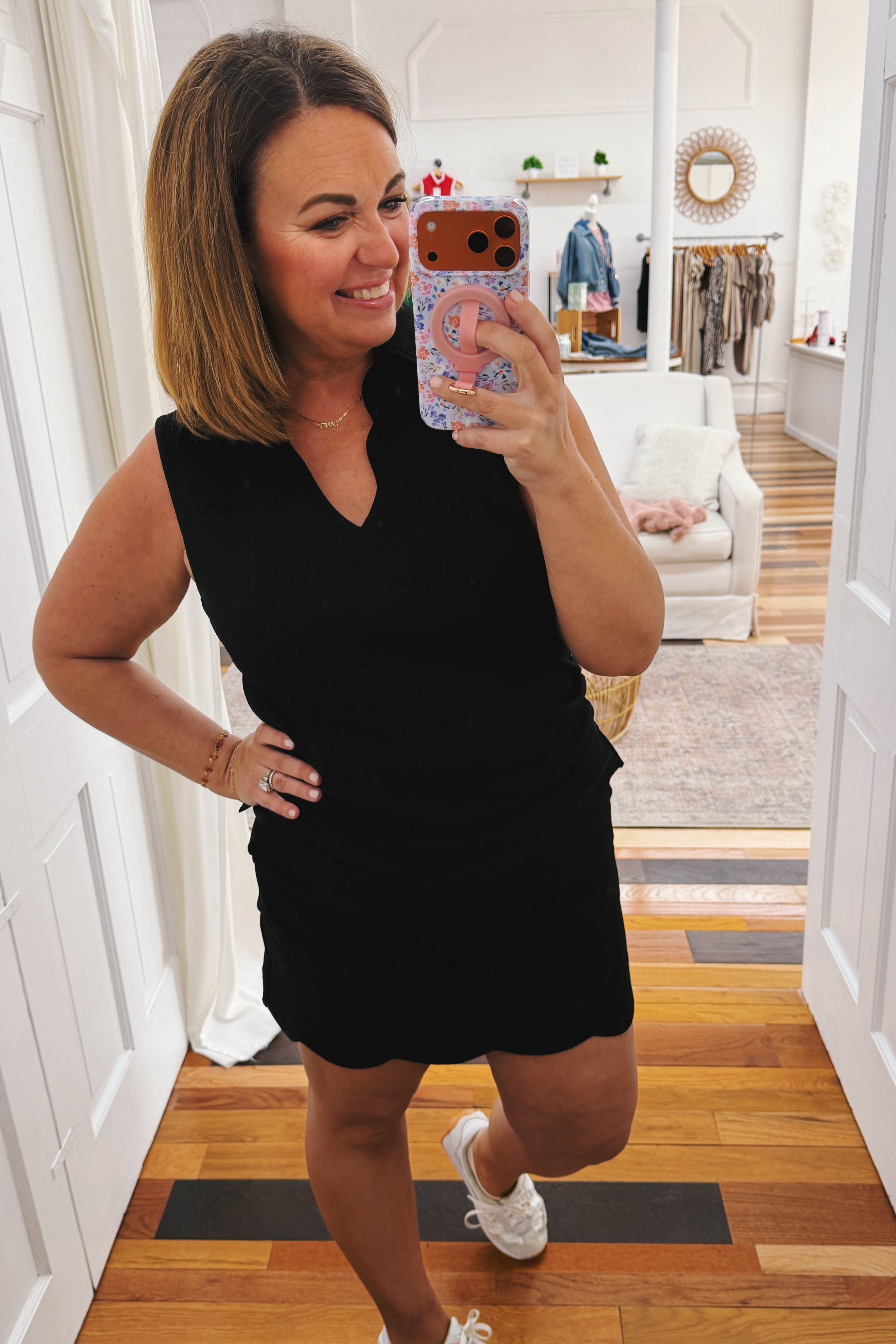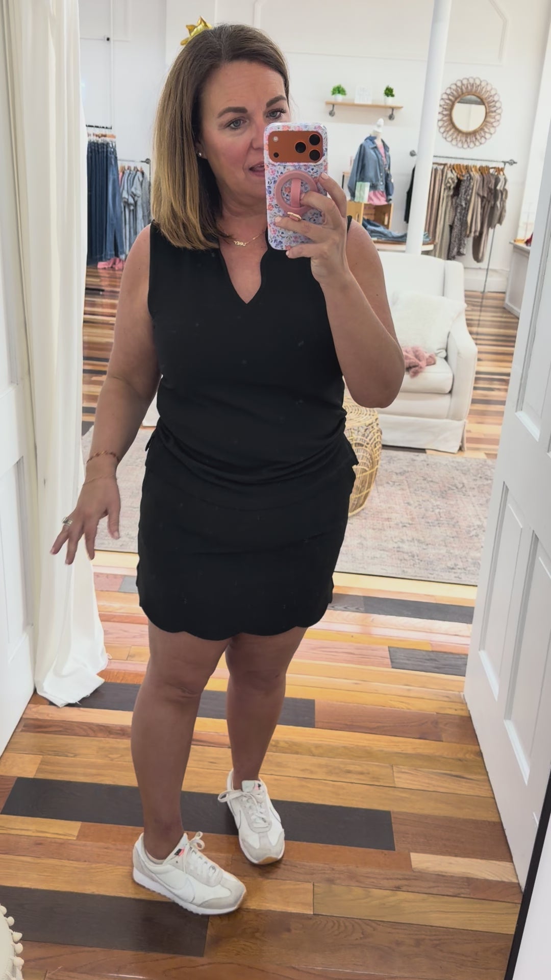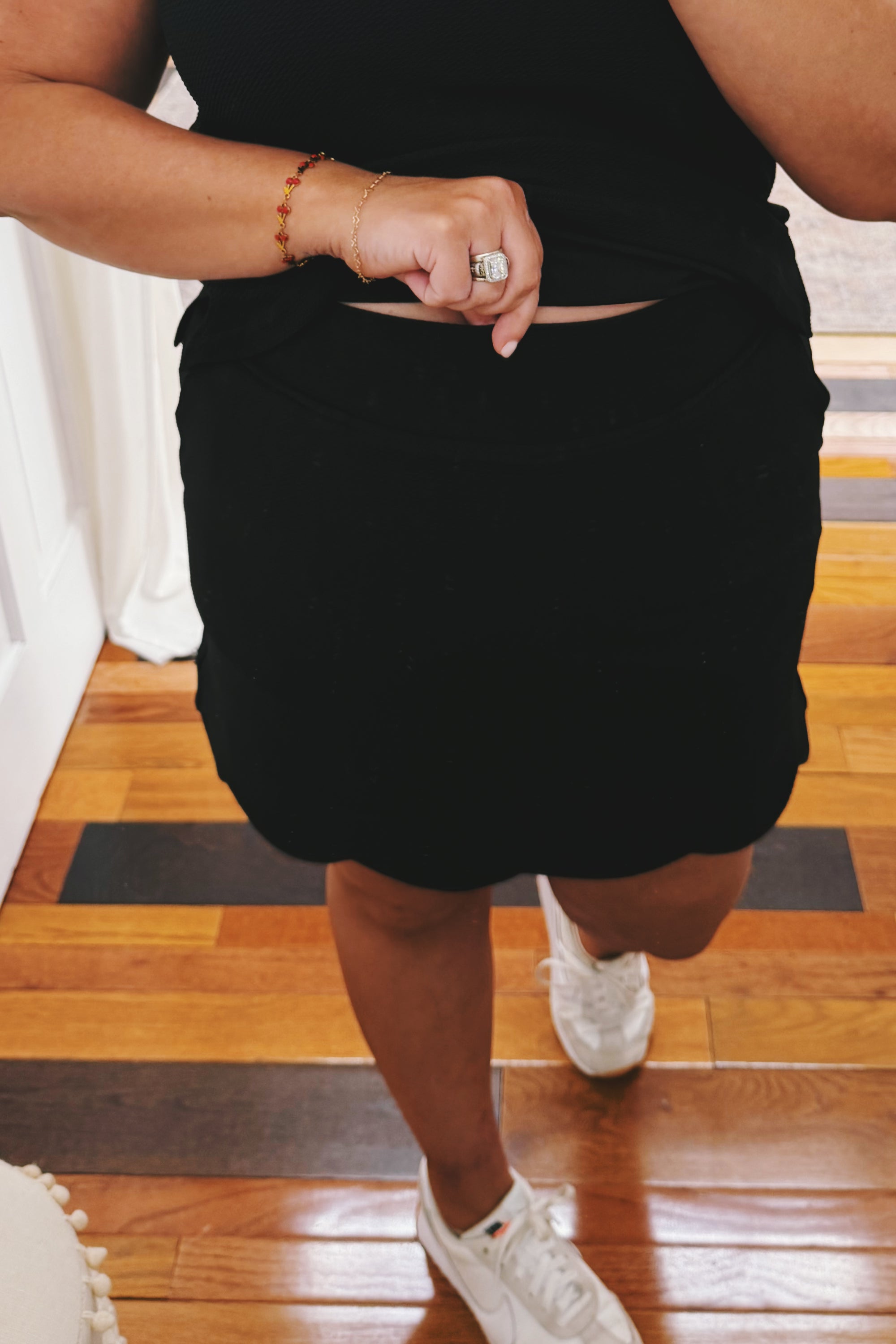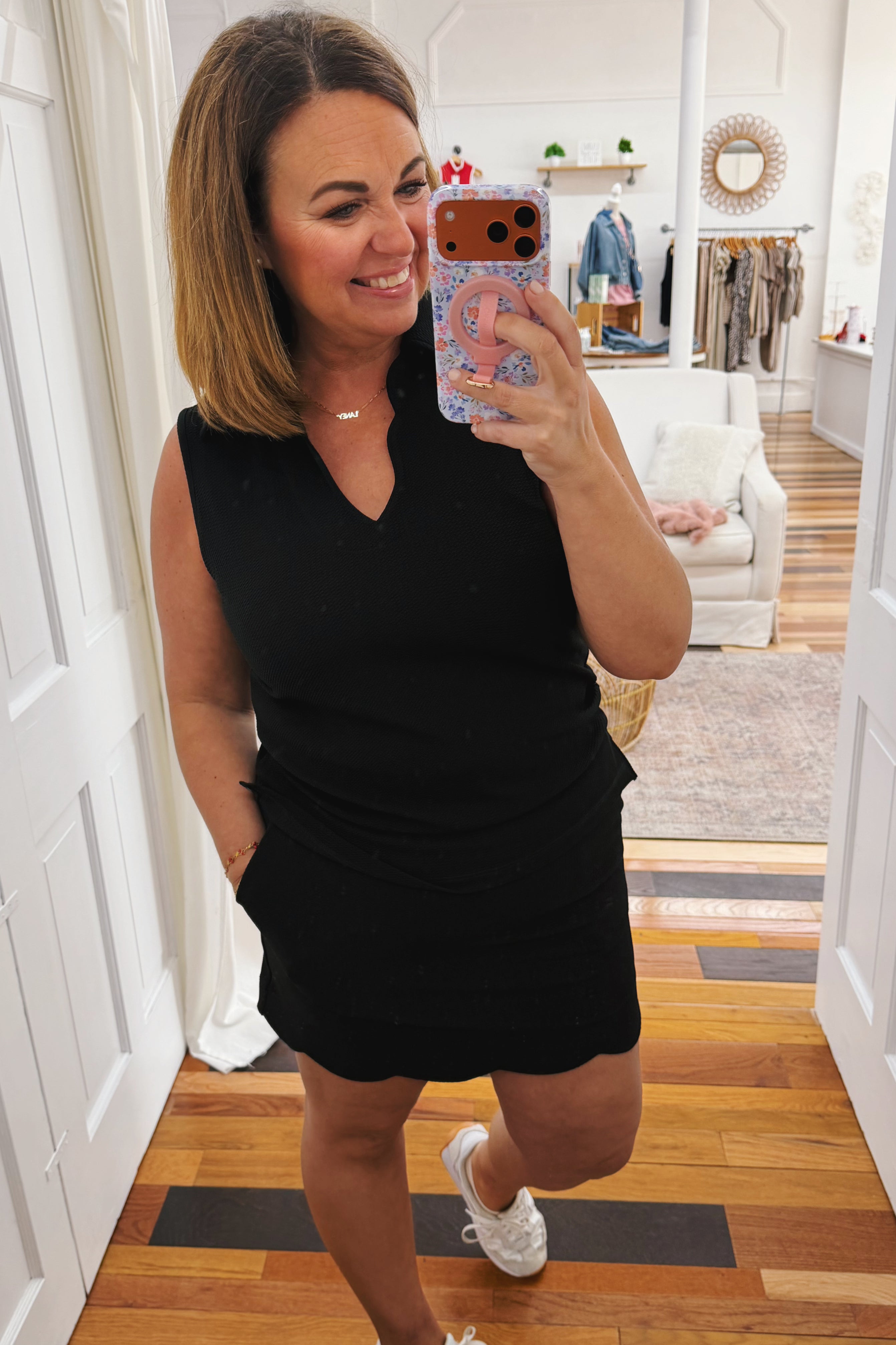 This one won't last!! Grab this fun and functional skort set in textured fabric. With a scalloped hemline and stretchy fit, this set features a unique collar and skort design for a stylish twist on traditional activewear. Perfect for weekend coffees with friends, running errands or hitting the golf course.