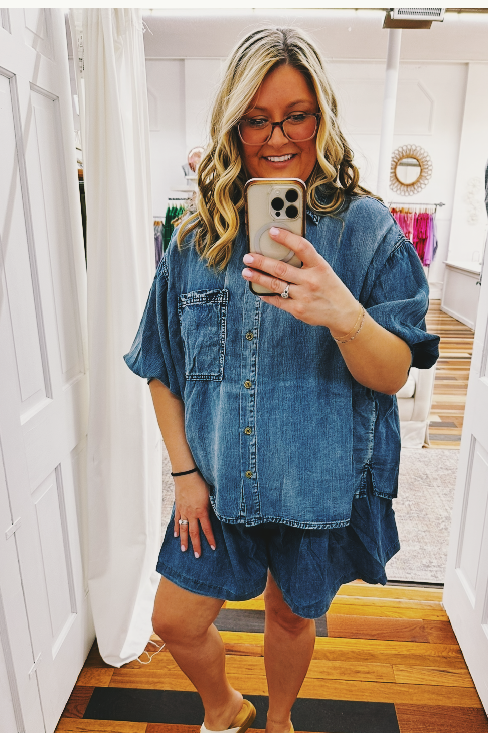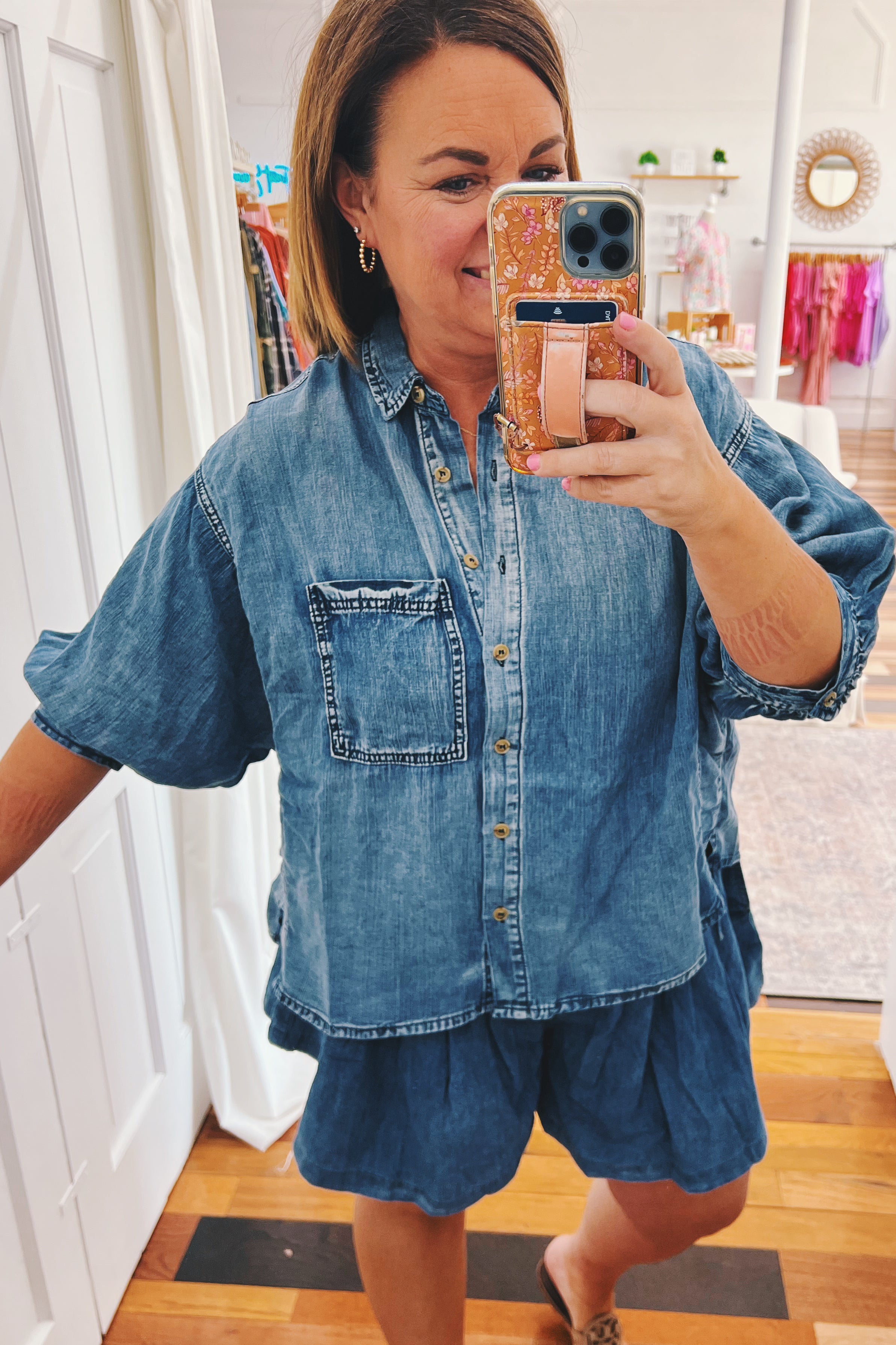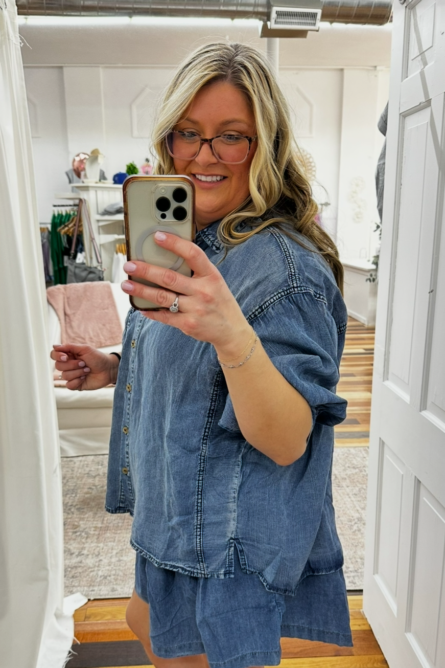 The Wanda Washed Tencel Dolman Top is your ticket to a good outfit day! Designed in an oversized dolman silhouette with half sleeves, this piece showcases beautifully aged chambray denim that feels broken-in and beloved from day one. The flowy fit moves with you while the button front keeps things polished and intentional. It's that rare find—high-end quality that whispers rather than shouts, perfect for anyone who knows that true style is about feeling good in what you wear.