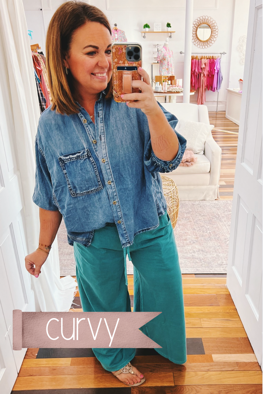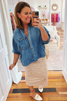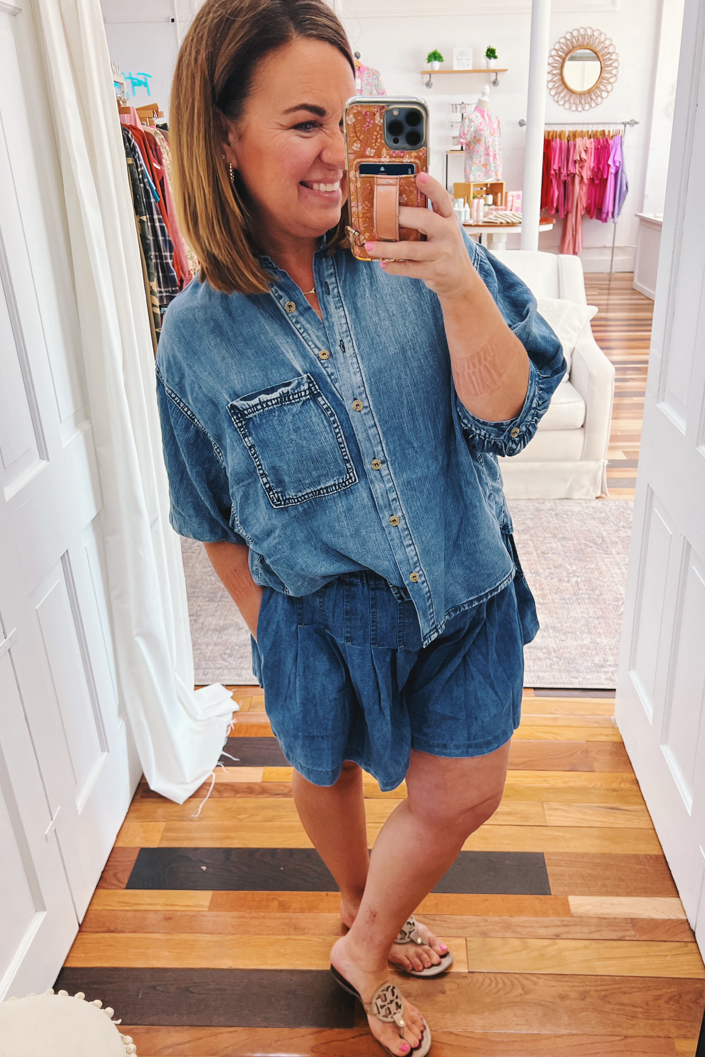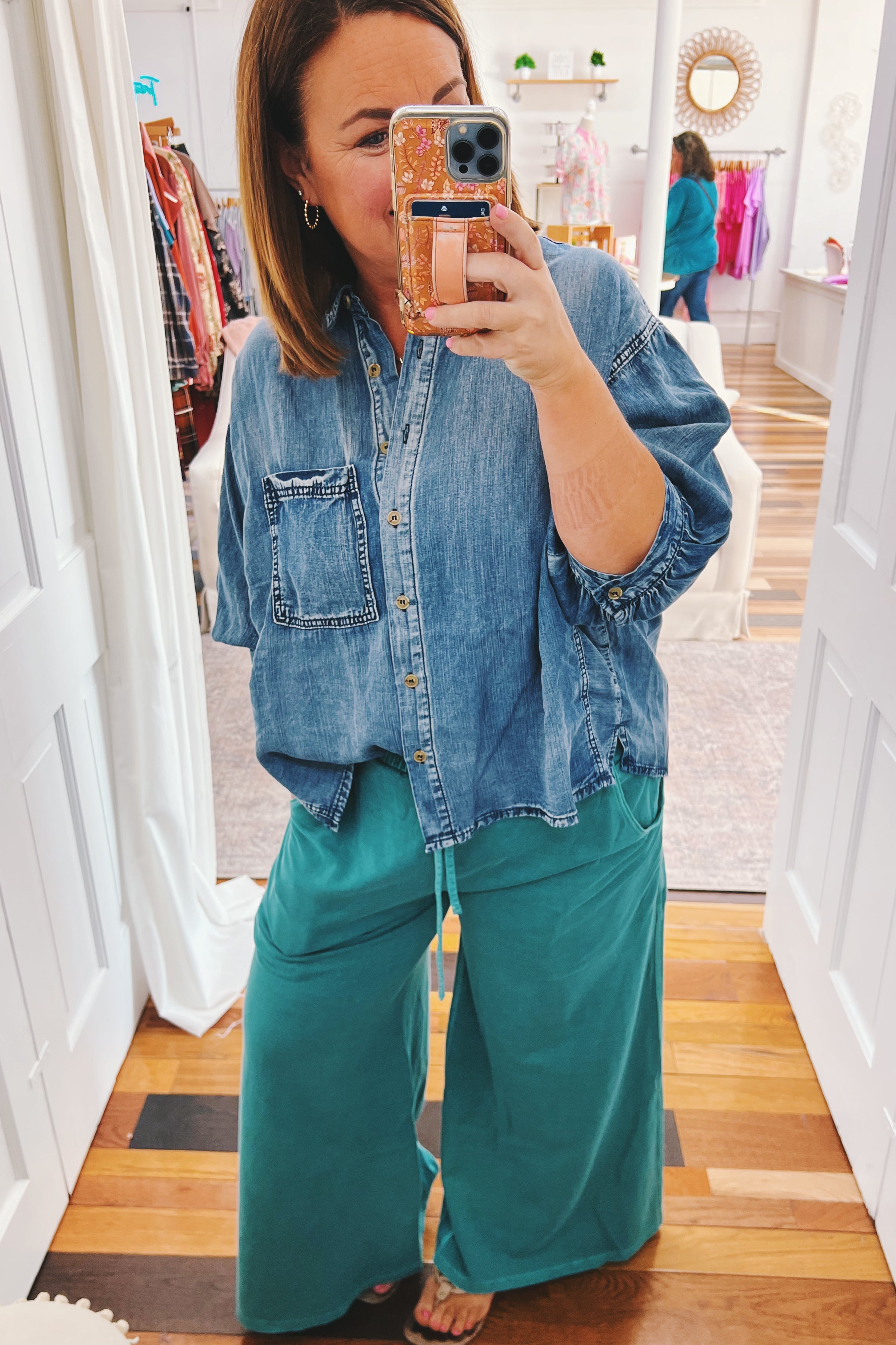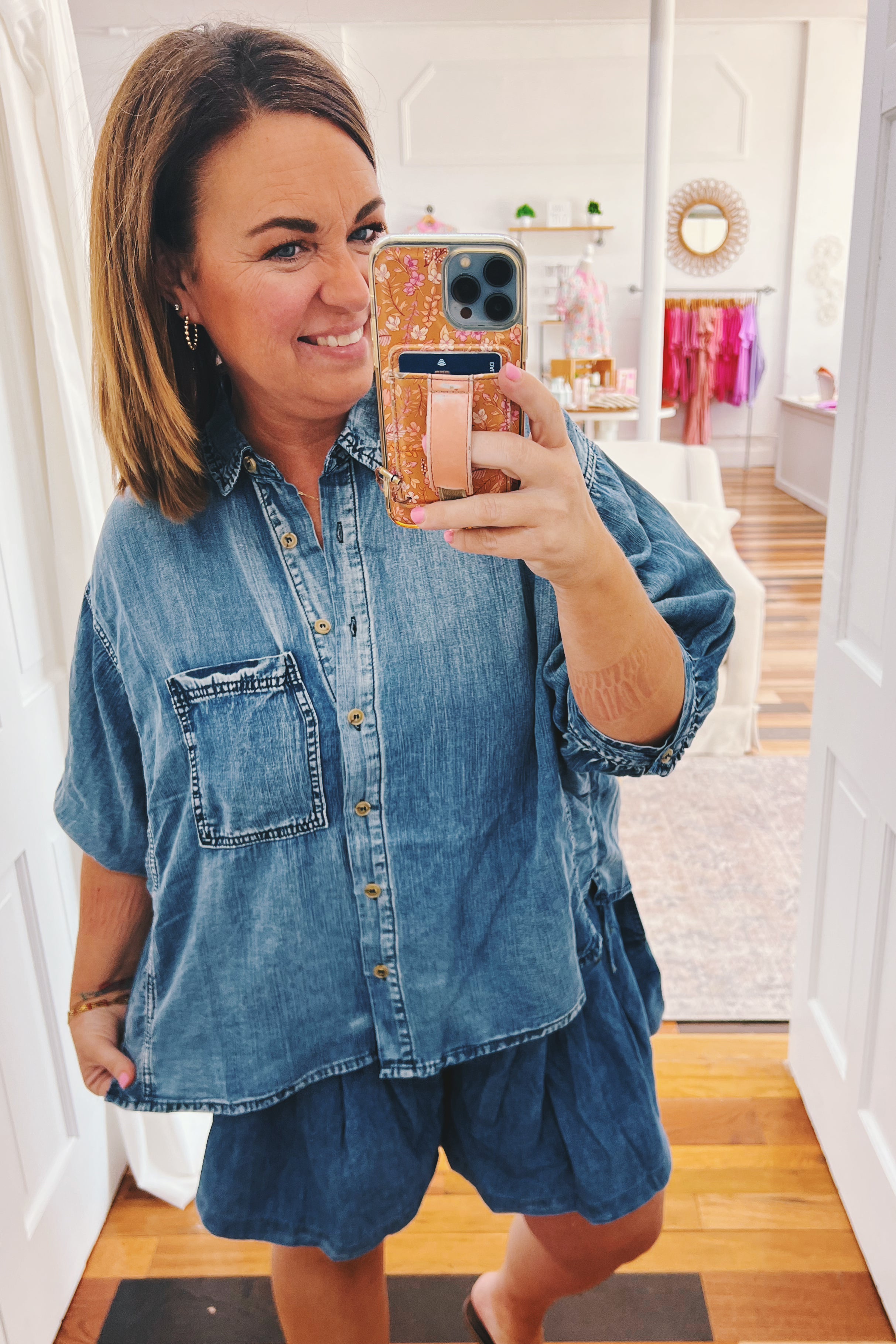 The Wanda Washed Tencel Dolman Top is your ticket to a good outfit day! Designed in an oversized dolman silhouette with half sleeves, this piece showcases beautifully aged chambray denim that feels broken-in and beloved from day one. The flowy fit moves with you while the button front keeps things polished and intentional. It's that rare find—high-end quality that whispers rather than shouts, perfect for anyone who knows that true style is about feeling good in what you wear.