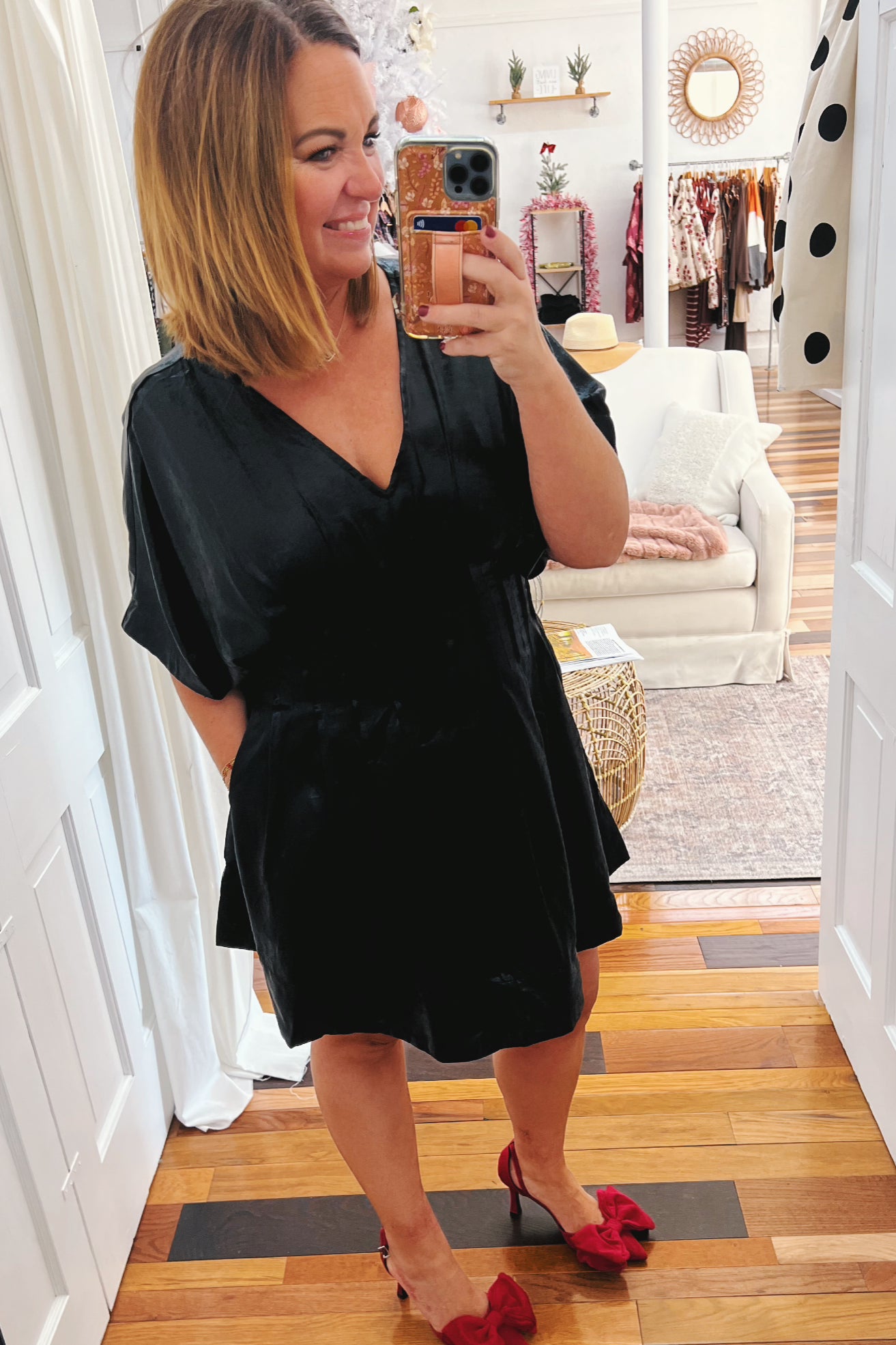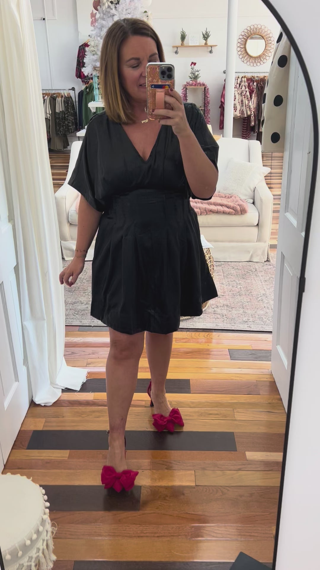 Introducing the Lillian Pleated Mini Dress—your little black dress for holiday 2025. This show-stopping number features a sultry metallic black fabric that catches the light with every move. The deep V-neckline is pure elegance, while strategic pleating at the waist creates a flattering silhouette that hugs in all the right places. A convenient zipper back and practical side pockets add function to the fun, and the lined interior ensures you feel as confident as you look. Whether you're dancing through a holiday party or ringing in the New Year, this trendy stunner delivers sexy sophistication that demands attention.