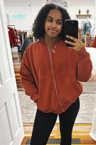 Laney's favorite doorbuster!! Meet your new go-to layering essential—a mineral wash bomber that feels like wrapping yourself in the coziest blanket ever made. The oversized fit drapes perfectly over everything in your closet, while the soft, broken-in fabric gives off that effortlessly cool vibe from day one. Quality construction means this trendy rust-colored jacket will become your favorite piece to throw on, whether you're running errands or keeping warm in style. Pure comfort that actually looks amazing.