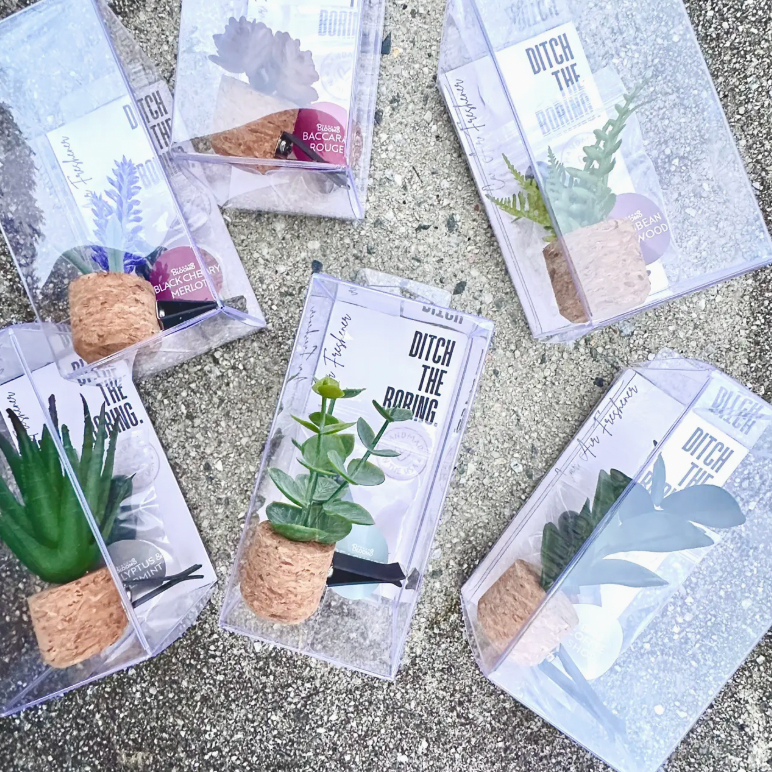 Ditch the Boring. Add some joy to your ride! Our plant car air fresheners / diffusers are an eco-friendly and more health conscious alternative to the traditional boring plastic ones! Our fragrance oils are clean and free of phthalates, parabens, and any ingredients on the California Prop 65 list.