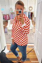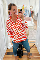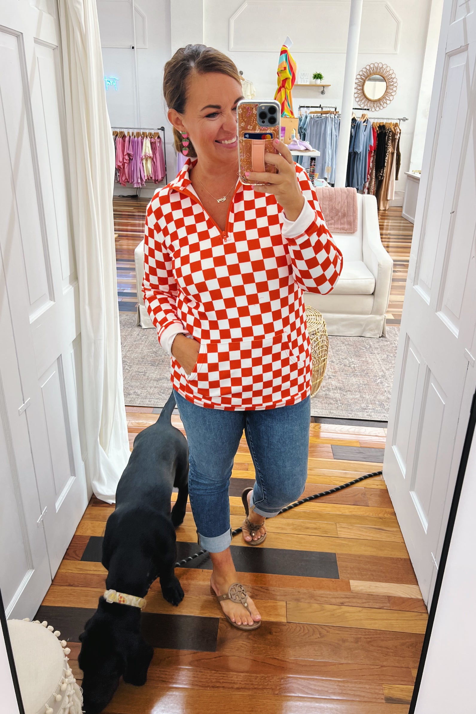 Hey BG!! Stay cozy and stylish with the Marley Checkered 1/4 Zip Pullover in orange and white! Made from a super soft, heavyweight cotton-spandex blend, this trendy pullover is perfect for football season. The comfortable fit and easy 1/4 zip make it a go-to for showing off your spirited side while keeping warm and ready for fun. Pair with shorts during the early season and add leggings or jeans when it gets cool.