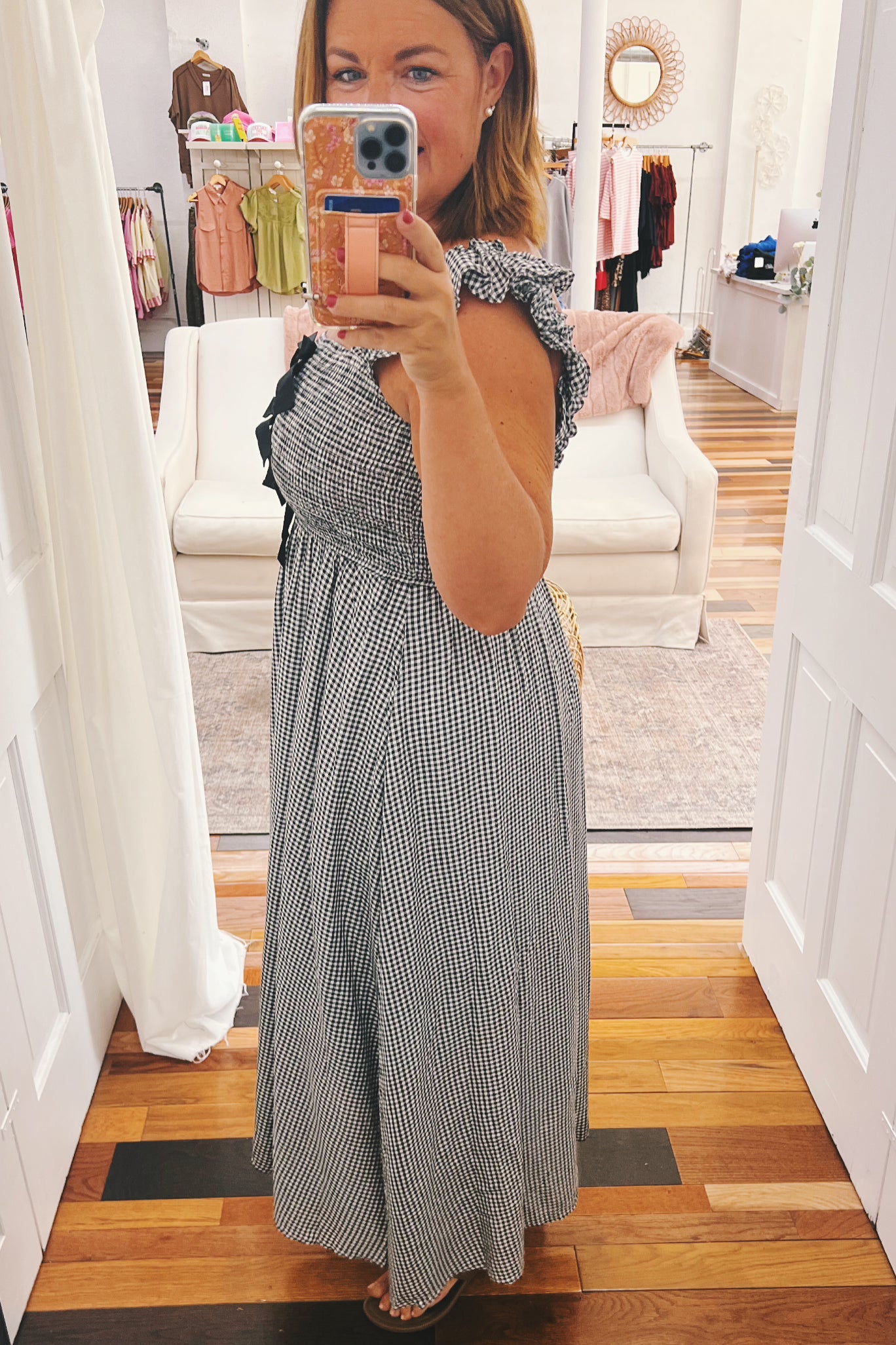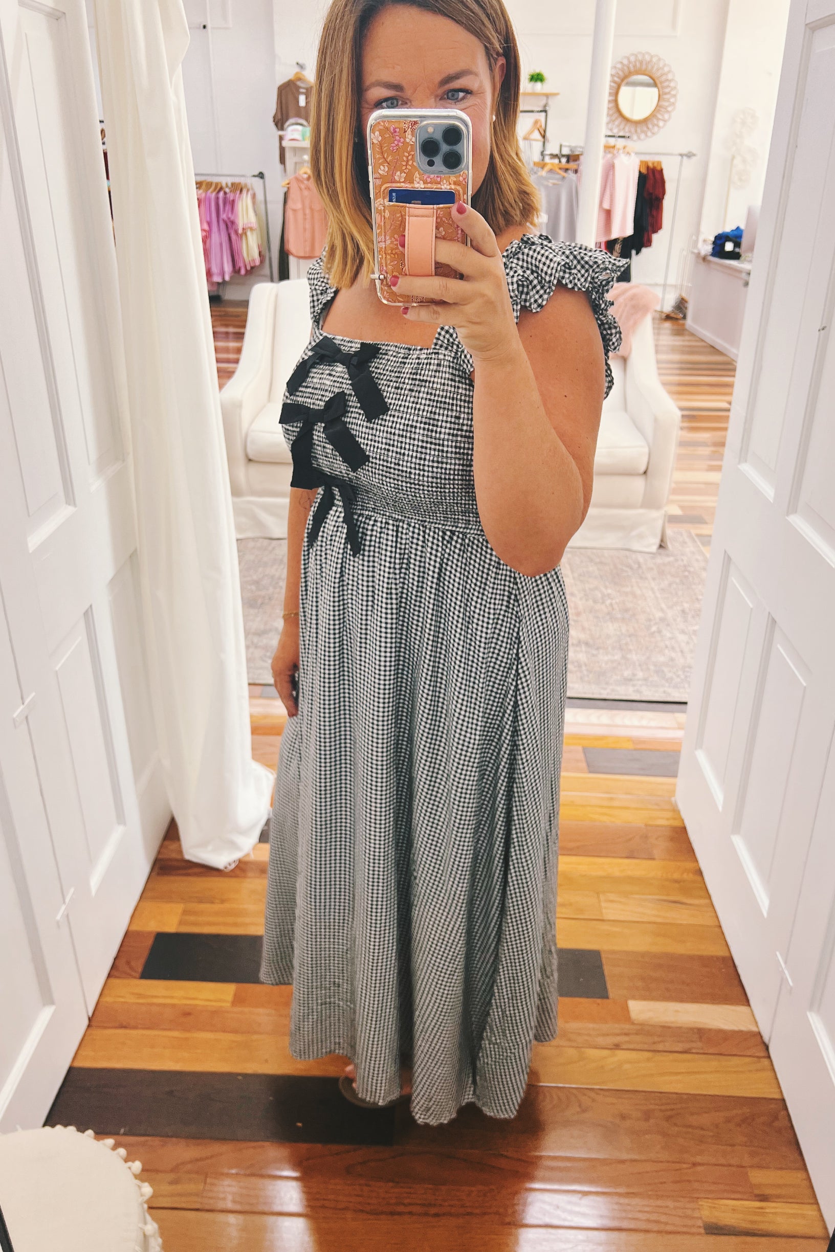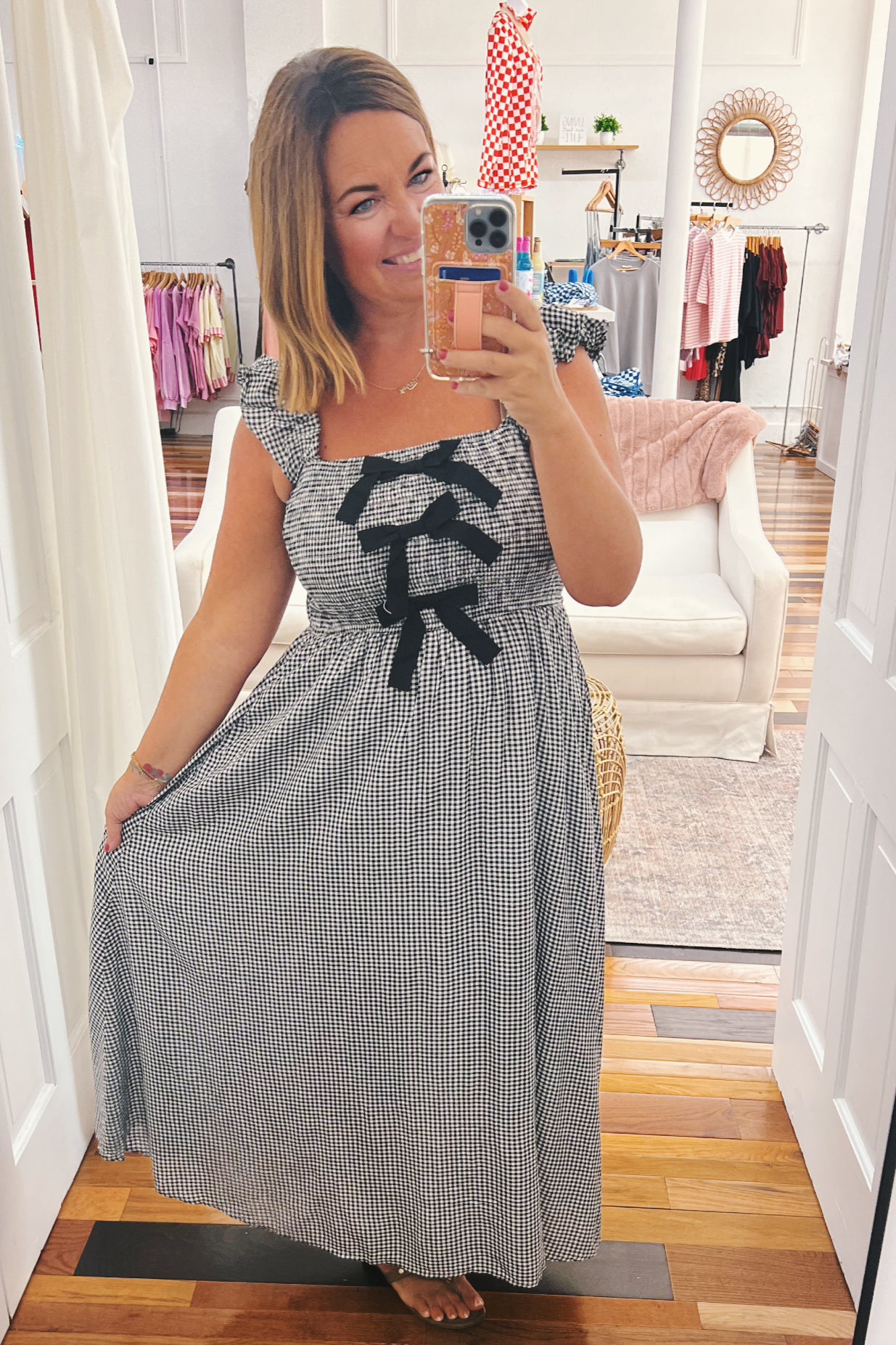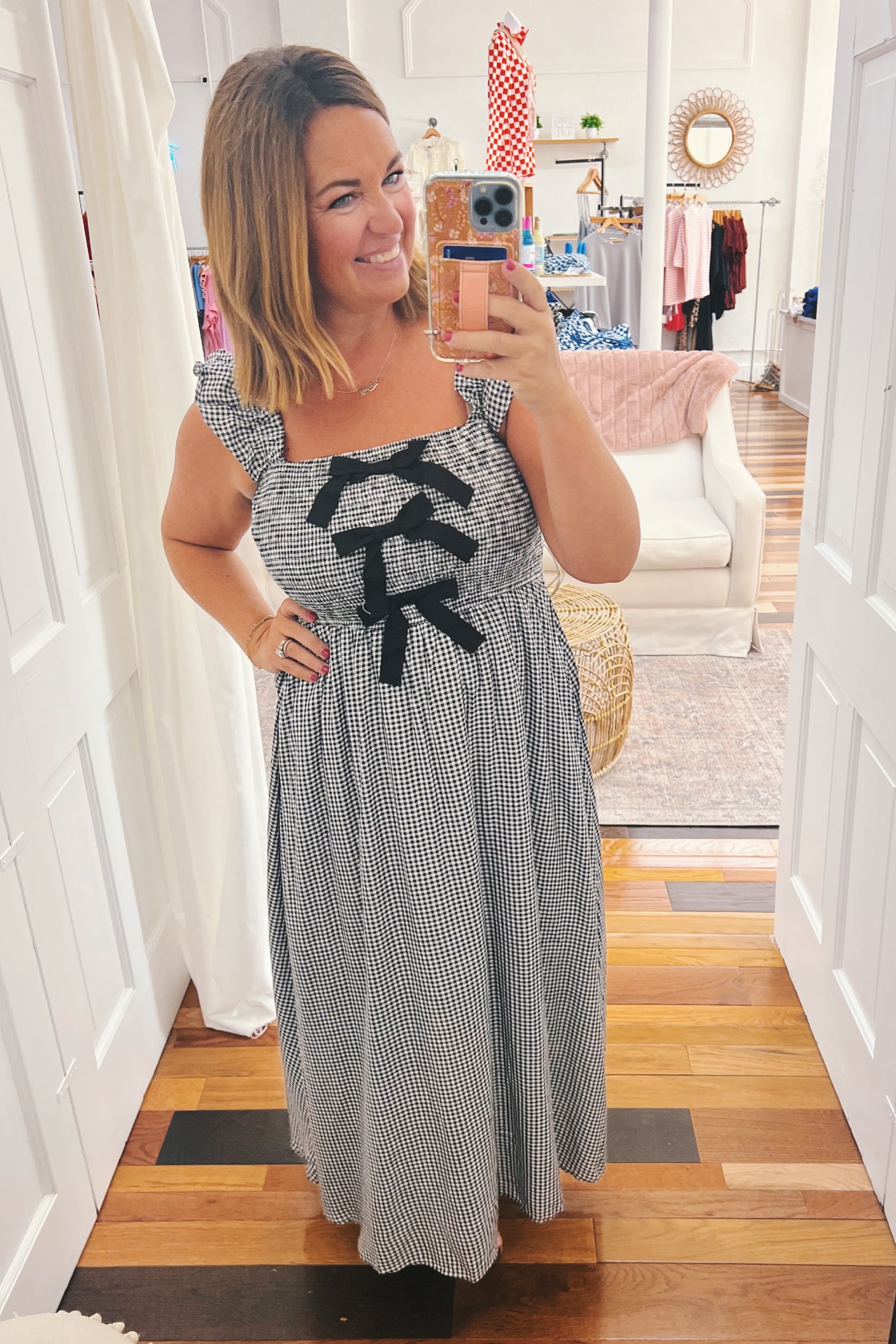 • smocked midi dress in black and white check