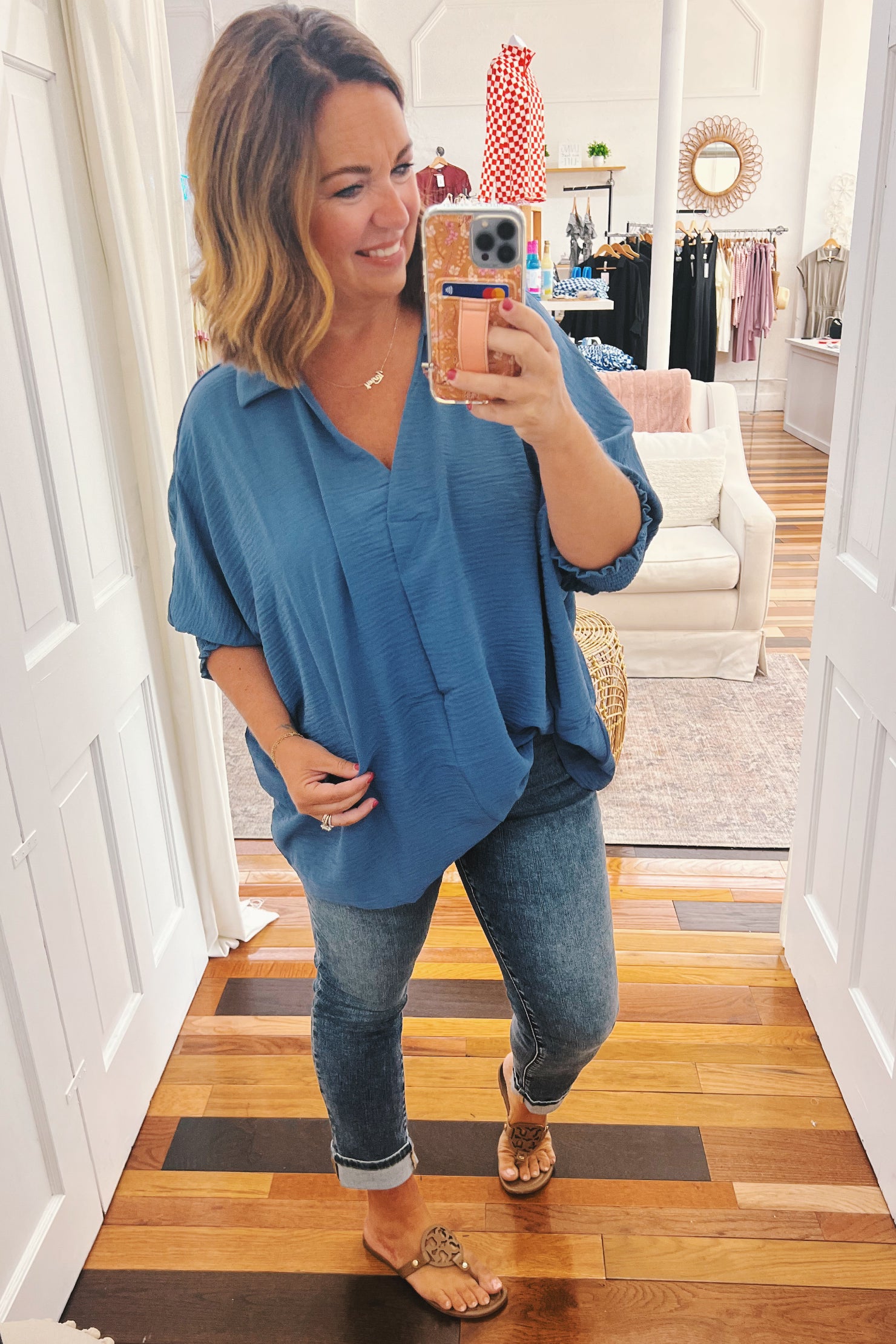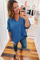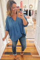 The Gertrude Smocked 1/2 Airflow Top combines classic charm with playful comfort. Featuring a smocked half sleeve and a collared V-neck, this oversized top is crafted from breathable airflow material that keeps you cool and comfy all day. Its oversized fit makes it flattering and versatile...day or night! Great for concerts, work or the classroom.