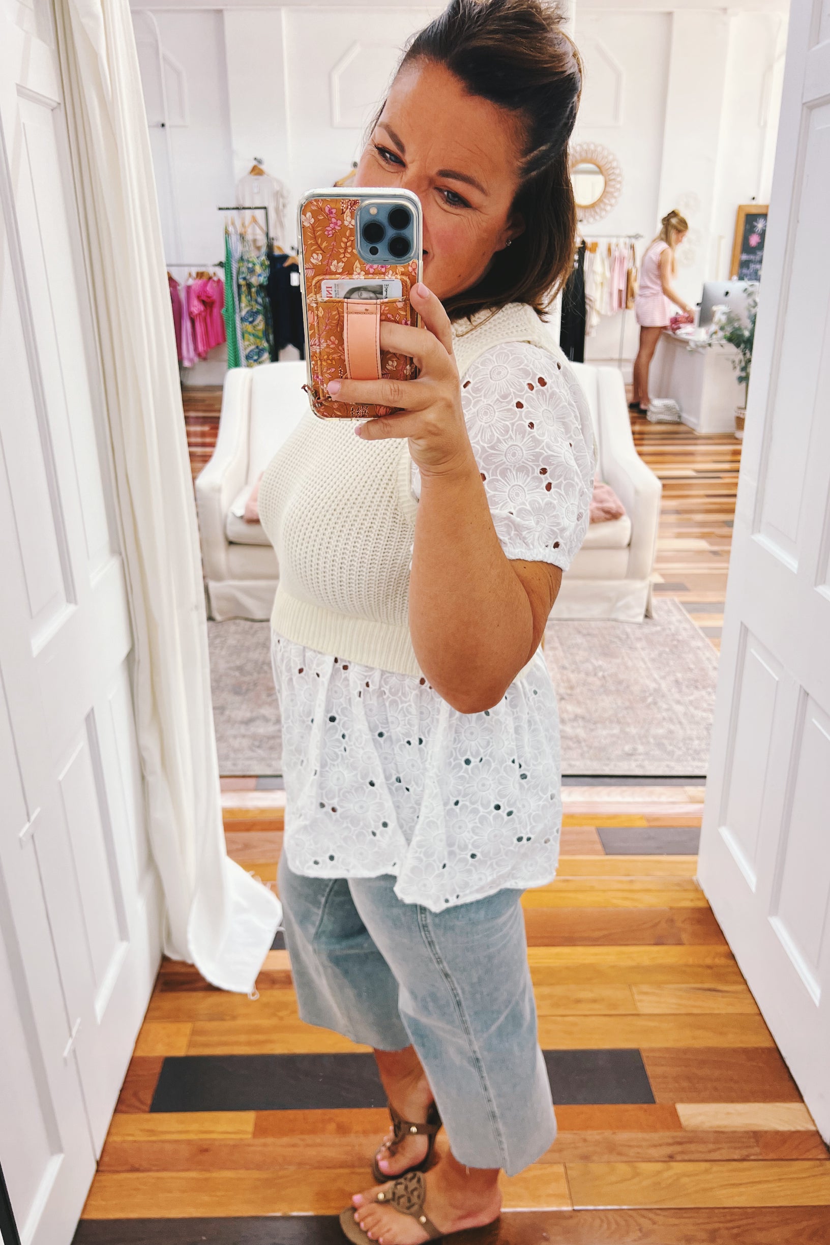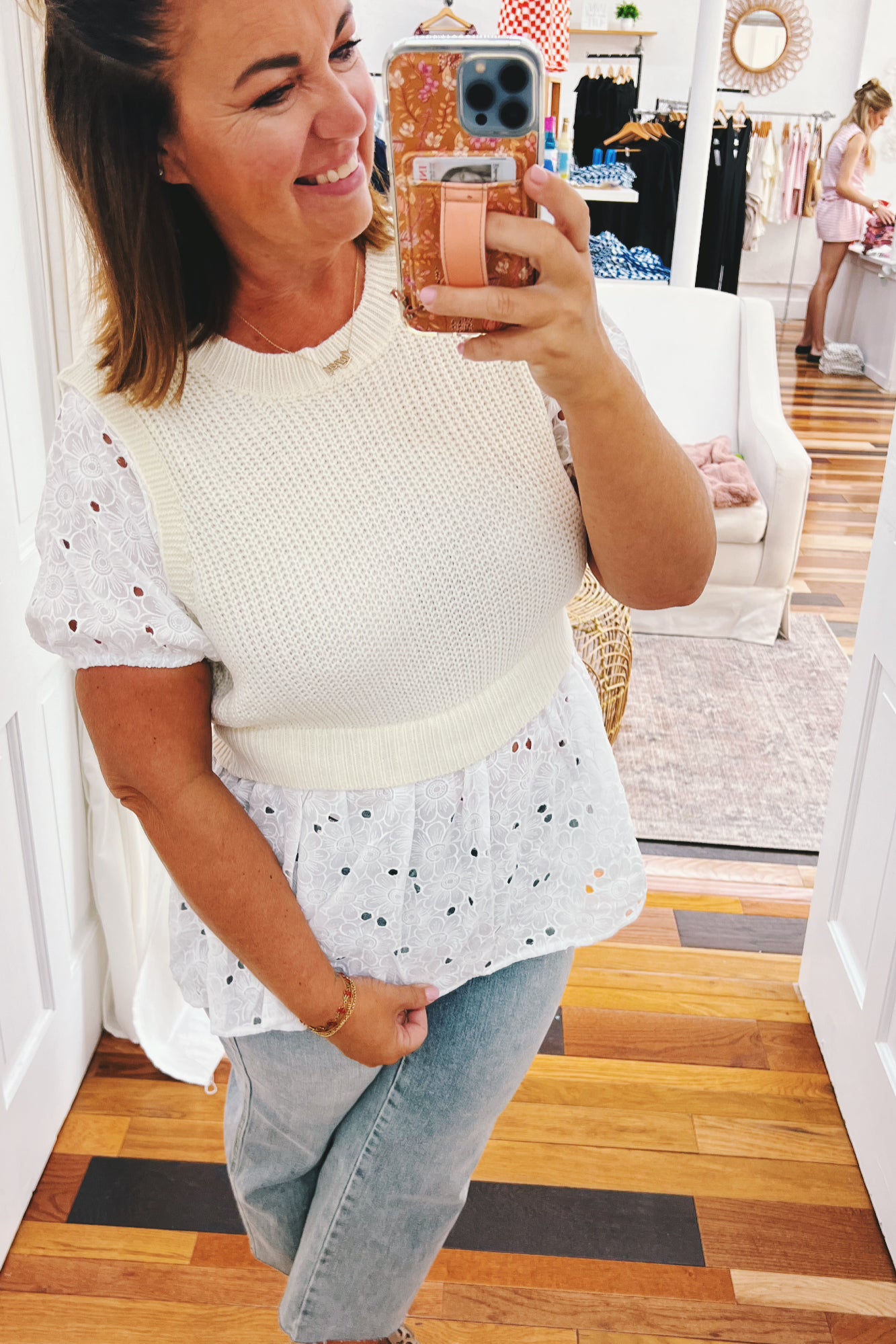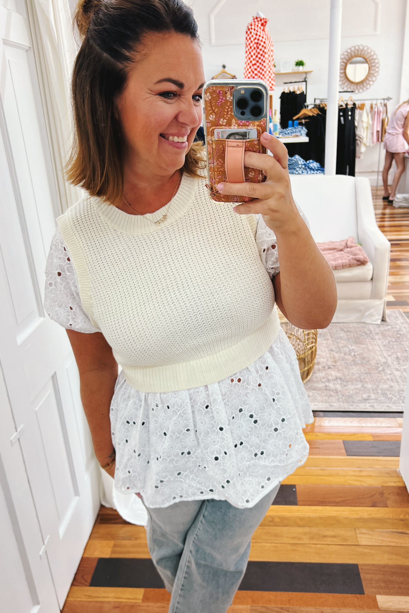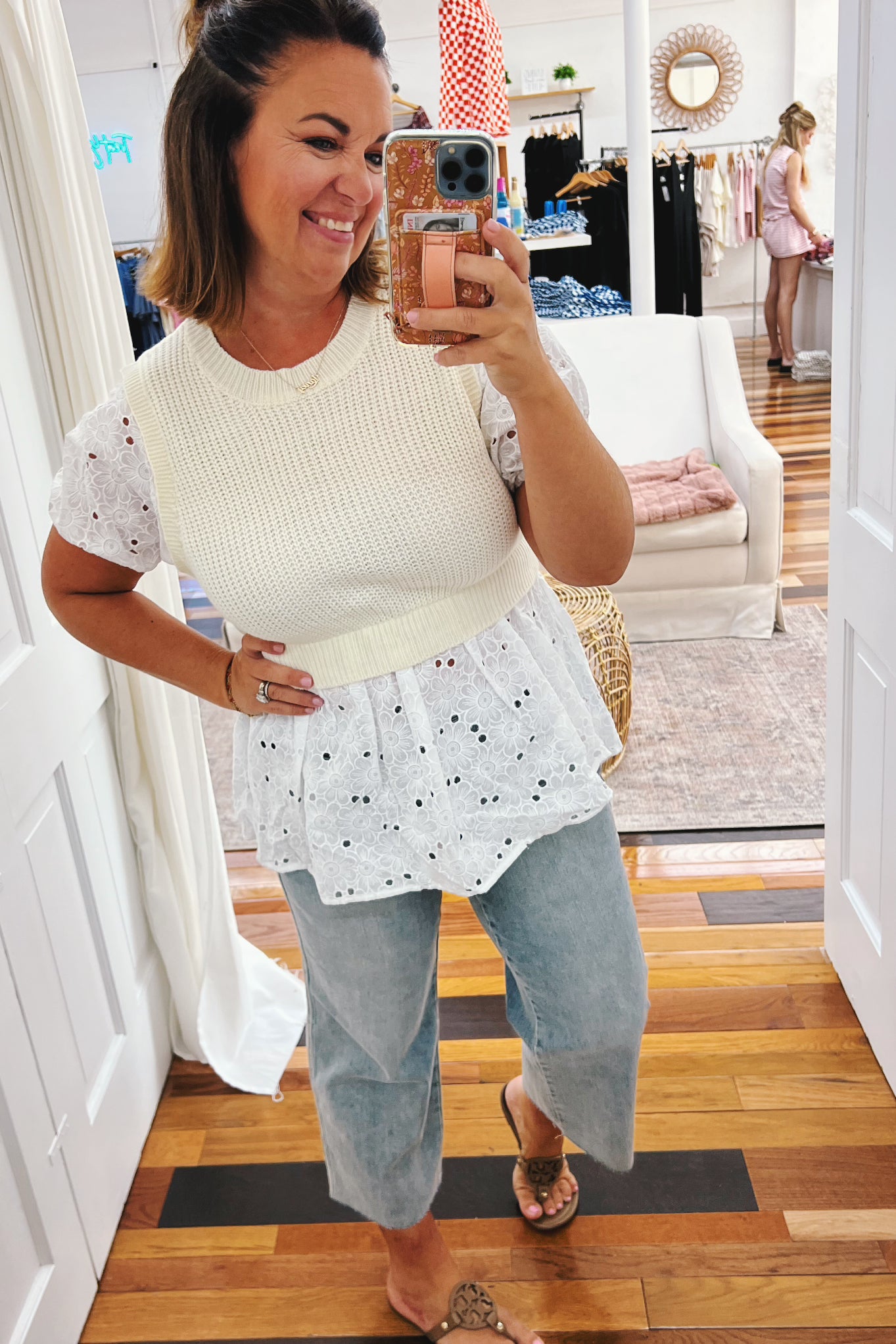 Embrace your feminine side with the Jasmine Mixed Knit Eyelet Top. Featuring a delicate floral eyelet design and a soft knit bodice, this playful peplum-style top highlights your waist while adding a girly touch to any outfit. Its flattering shape pairs perfectly with jeans or skirts for effortless charm wherever you go.
