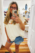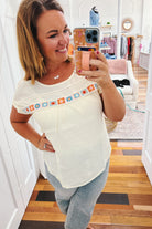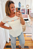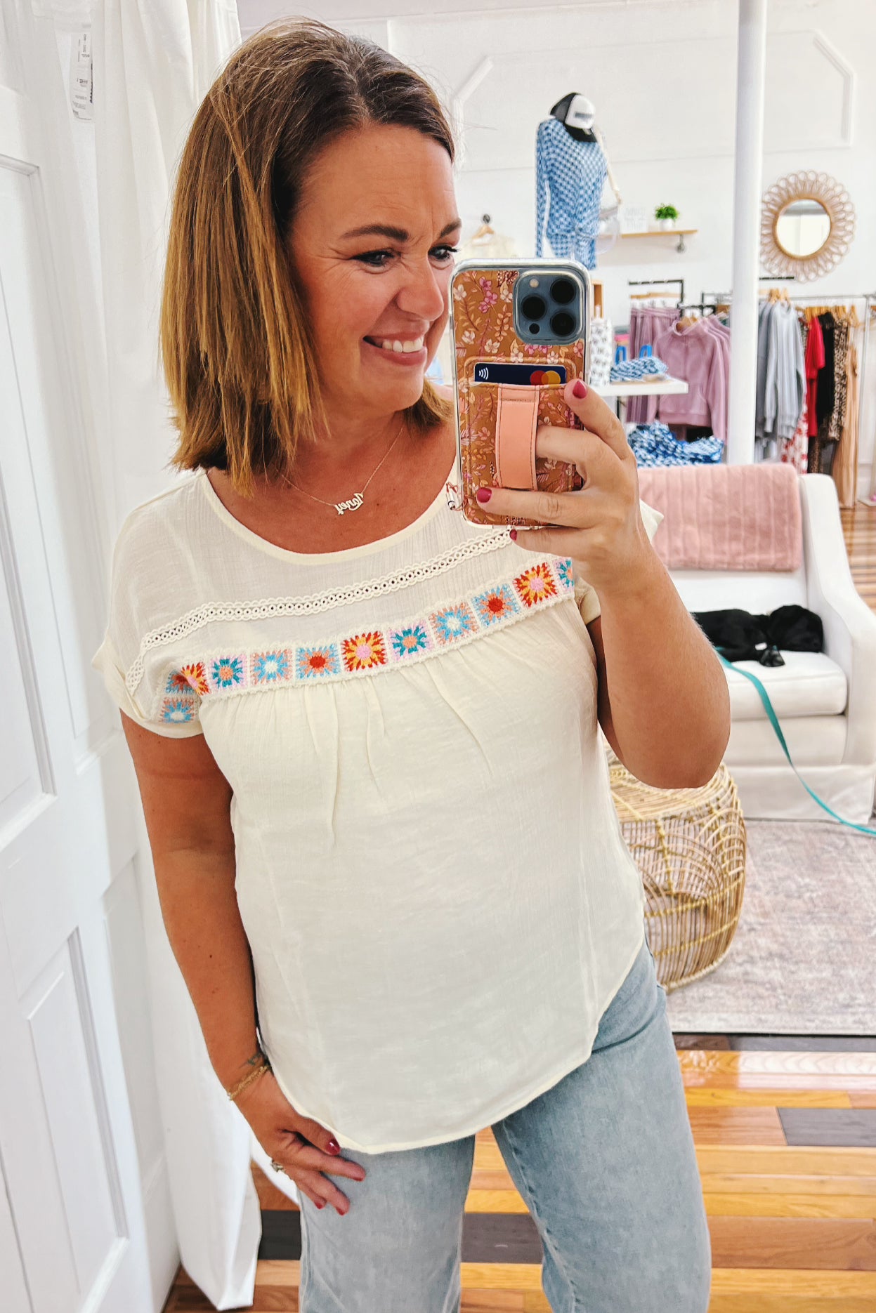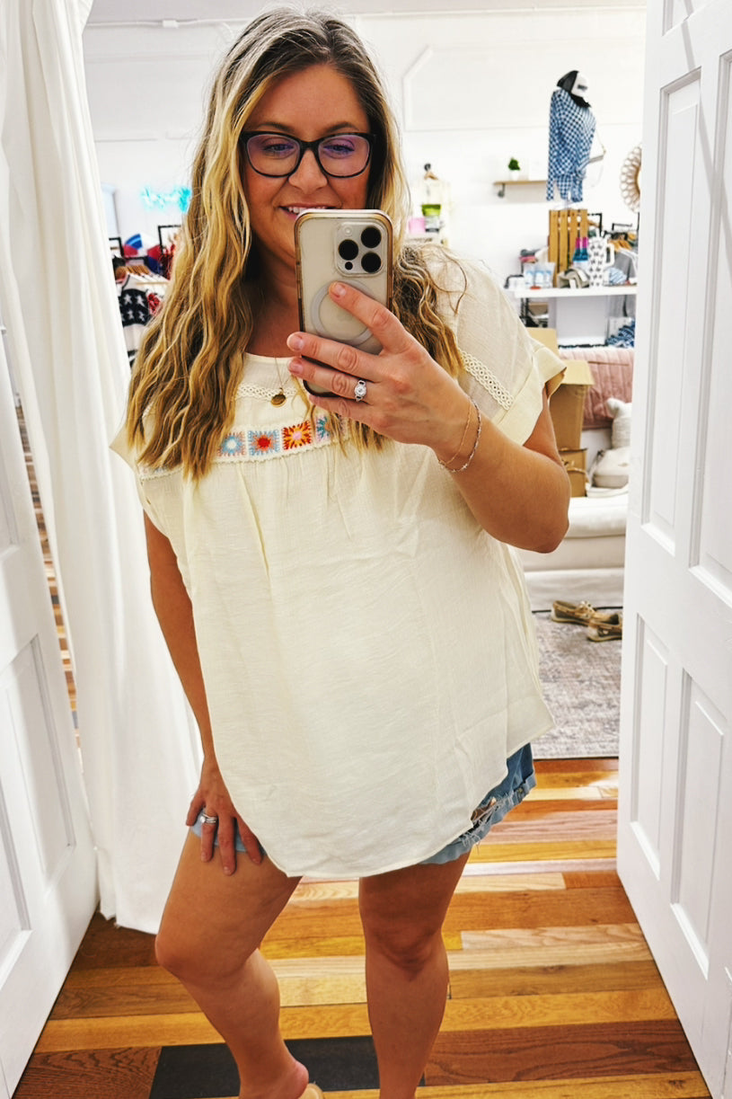 Embrace vintage vibes with the June Crochet Floral Square Trim Blouse. This trendy woven top features a relaxed fit and a charming keyhole button back for easy wear. The granny square embroidered trim adds a playful, nostalgic touch, making it perfect to dress up or down for any occasion.