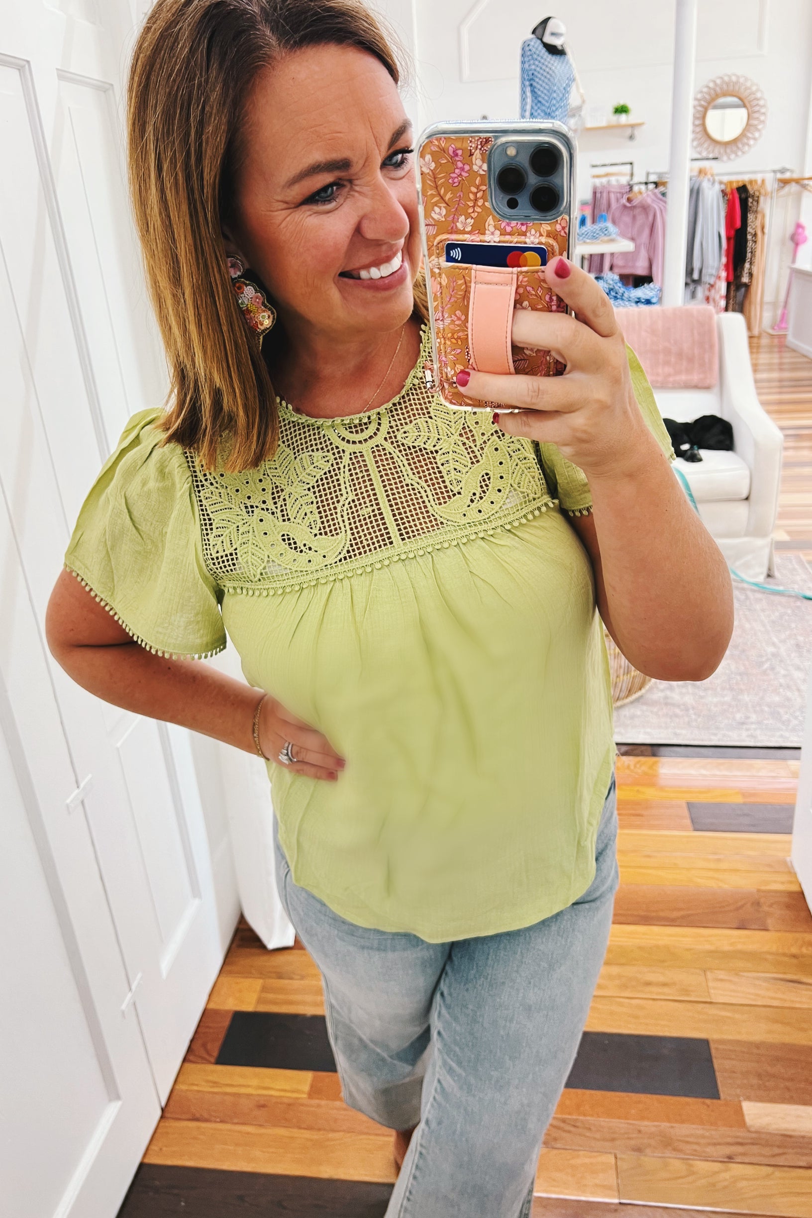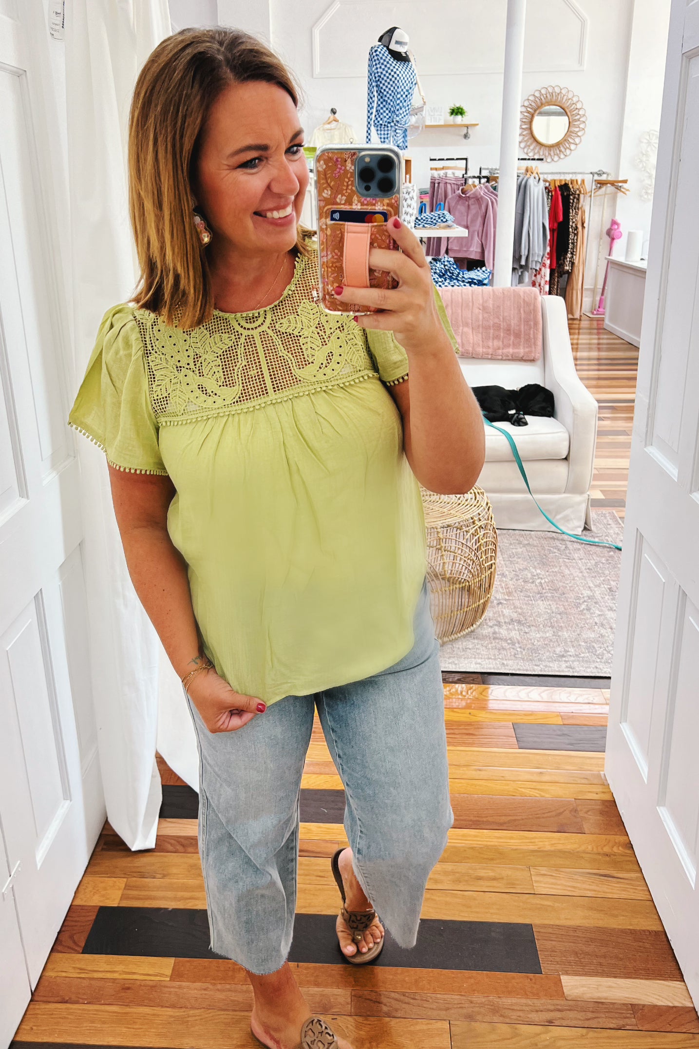 Feel the sweetest charm with the Myrtle Lace Yolk Blouse in Kiwi. This feminine and versatile piece features intricate lace details that add a pretty touch to your look. Its relaxed fit makes it perfect for transitional seasons, easily pairing with your favorite jeans or skirts. Whether dressed up or down, this blouse brings a playful yet neutral elegance to any outfit.