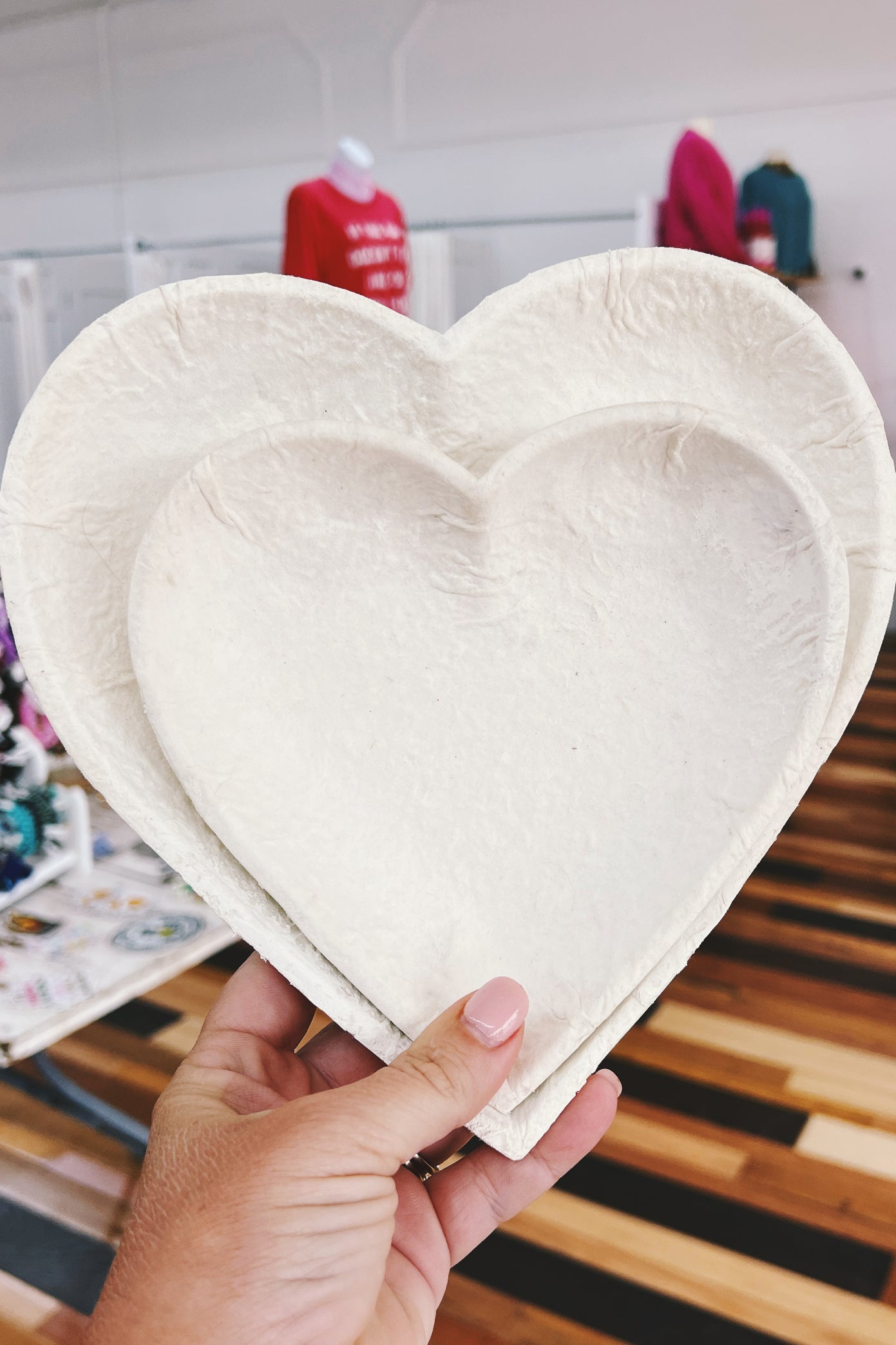 Get ready to serve in style with our Heart Tray Set! This set of two trays, made from durable paper machete, adds a touch of whimsy to any space. Use them to organize and display your trinkets or to serve snacks at your next gathering. Practical and eye-catching, this neutral decor is perfect for any occasion.