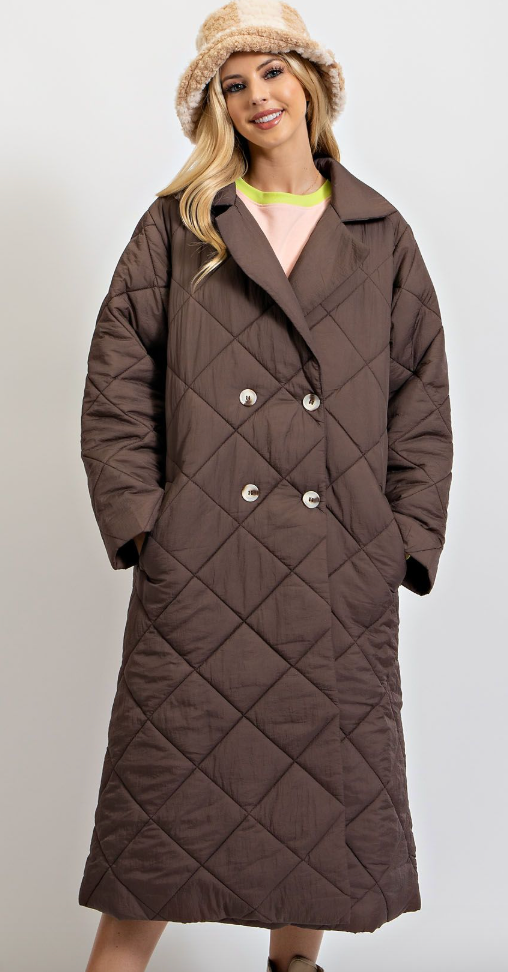 Elevate your outerwear game with this sophisticated long quilted coat that proves timeless style never goes out of fashion. The silky-soft quilted material keeps you warm without the bulk, while the lightweight design makes it surprisingly packable for travel. Double-breasted detailing adds that polished, classic touch, and the elongated length creates an instantly elegant silhouette. Throw it on over anything and instantly feel put-together—this smoke-hued staple is the refined layer you'll reach for again and again.