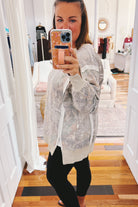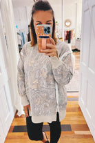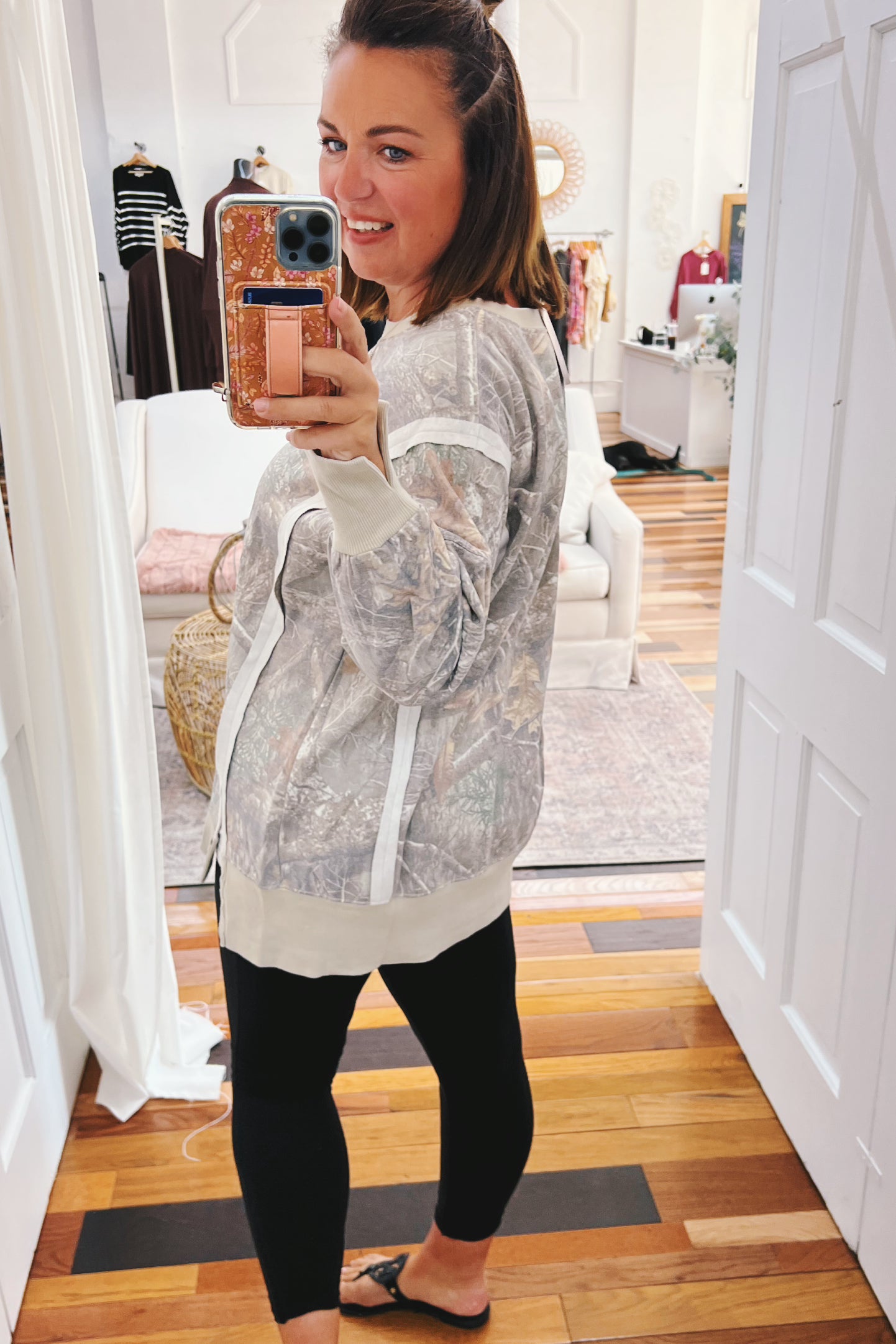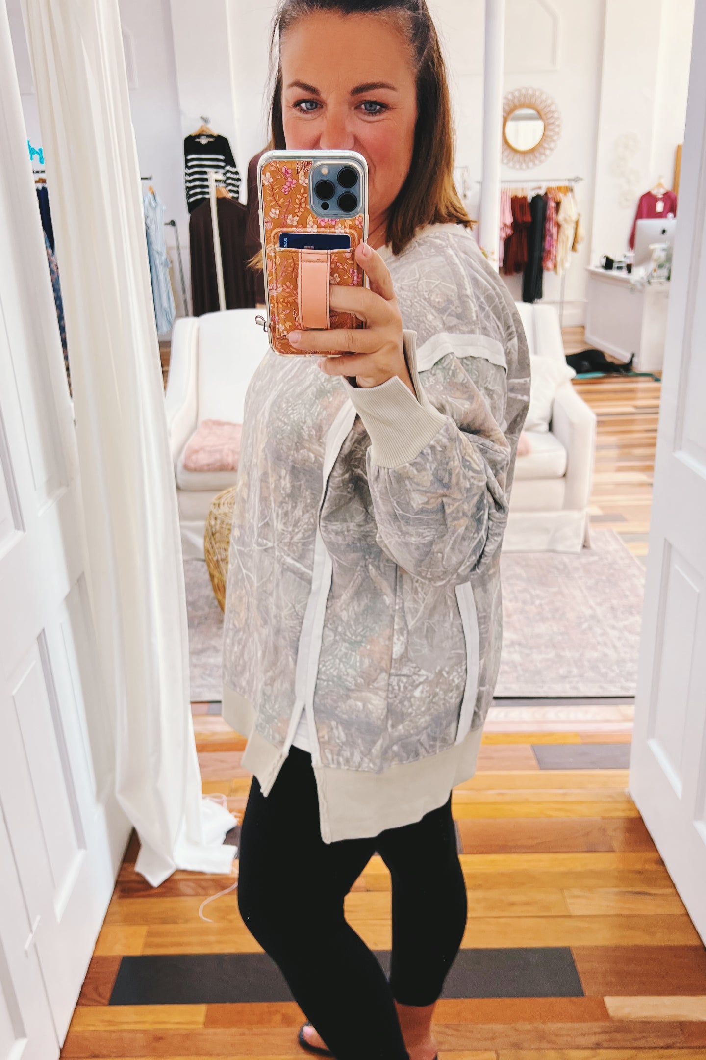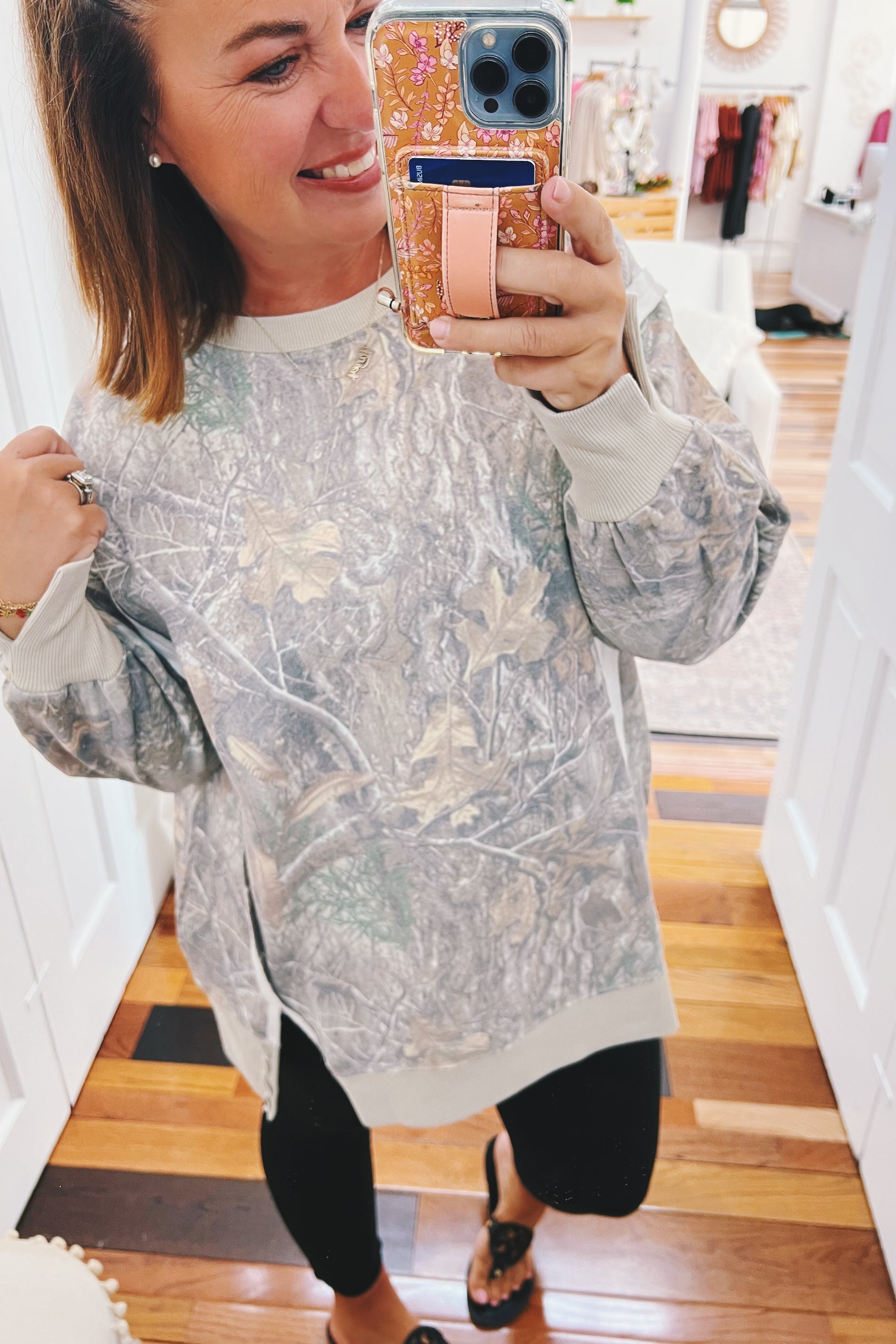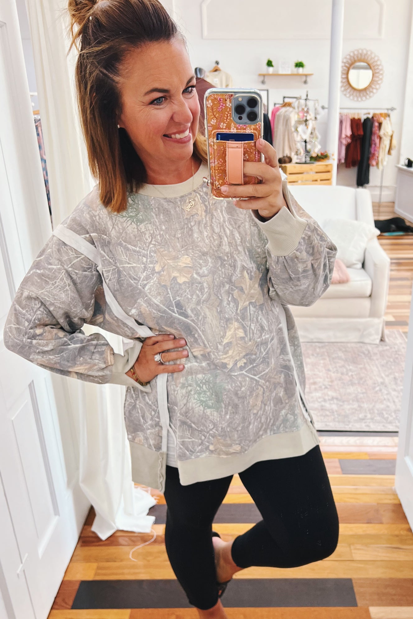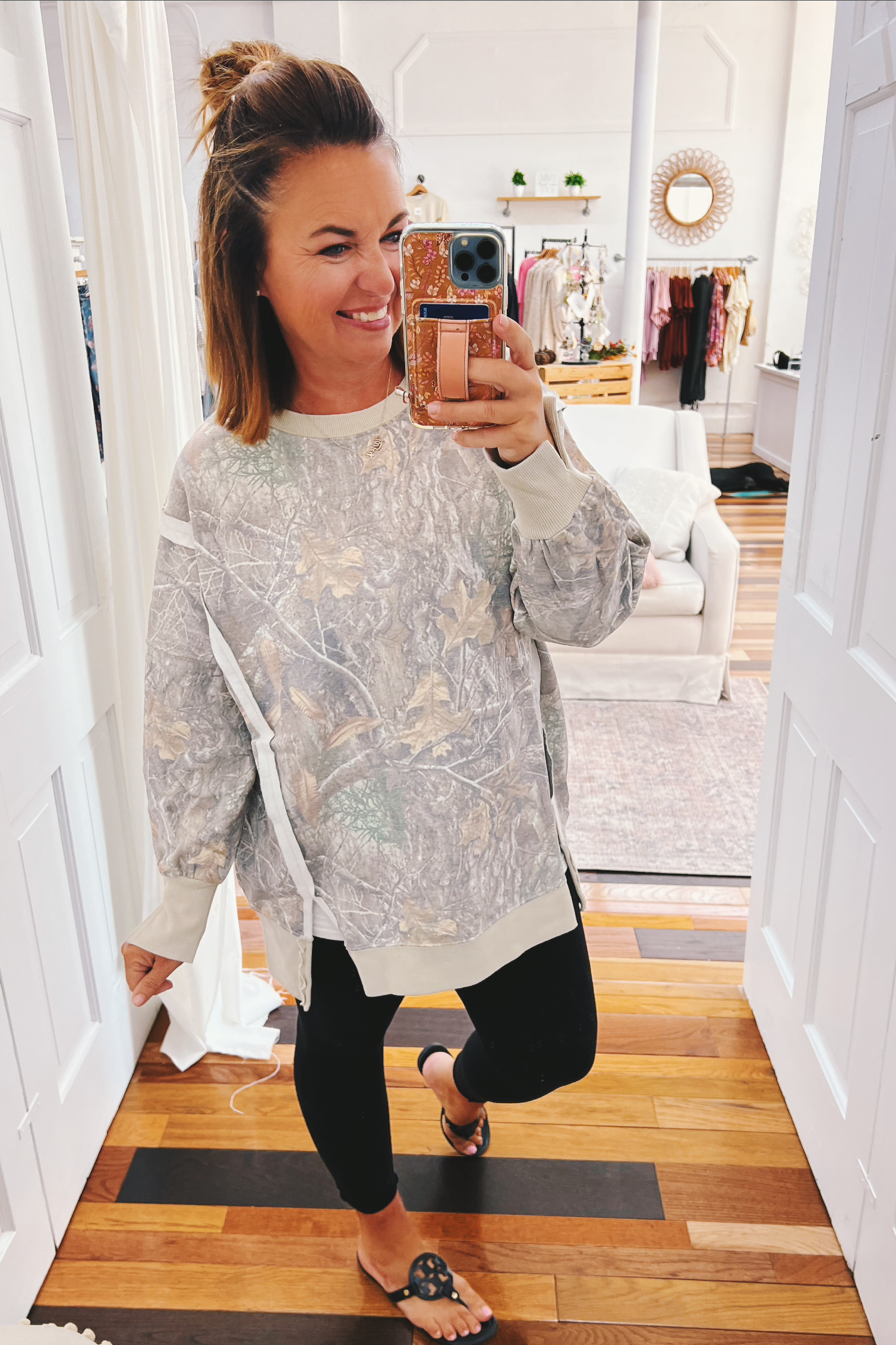This one is going to FLY!! The natural woods camo style is the HOTTEST trend!! Get comfy in our June sweatshirt, a best seller with its slouchy fit and high low hem. Perfect for lounging. The exposed seams and slit cuffs add a touch of style to this must-have sweatshirt of the season.