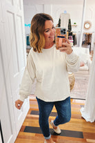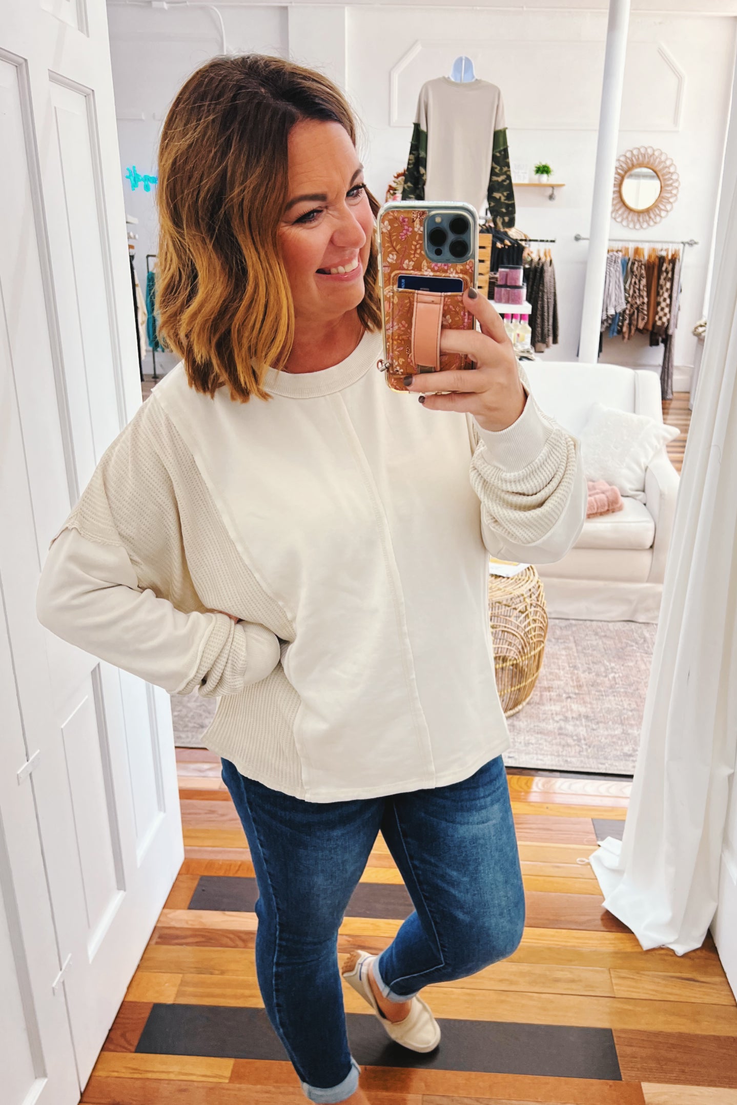 The Sylvia Thermal Mix Top combines waffle knit and French terry fabrics for a super comfy, oversized fit. In a versatile cream color, this basic is perfect on its own or as a layering essential to keep you cozy and stylish throughout the season.