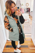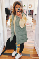 The Ada Hooded Long Puffer Vest in Light Sage green is a seasonal staple that is both trendy and cozy. The perfect layering must-have, it features a hood and zipper front for added warmth and style. Stay on-trend and warm with this versatile vest.