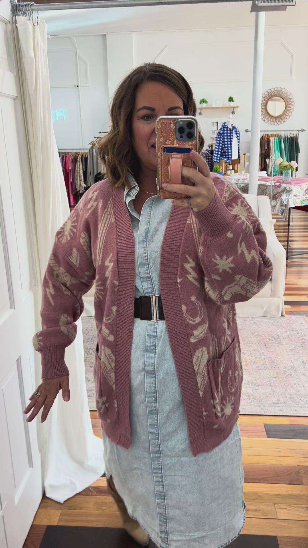 Meet Alaina, the cardigan that brings Western flair to your everyday rotation. This oversized mauve knit features a bold western print that is perfectly on trend. Soft, stretchy fabric keeps you cozy while the oversized fit keeps things comfortable. The open front design lets you layer it however you like, and functional front pockets are perfect for keeping essentials close. Throw it over a tee, dress it up with a chambray dress.