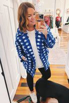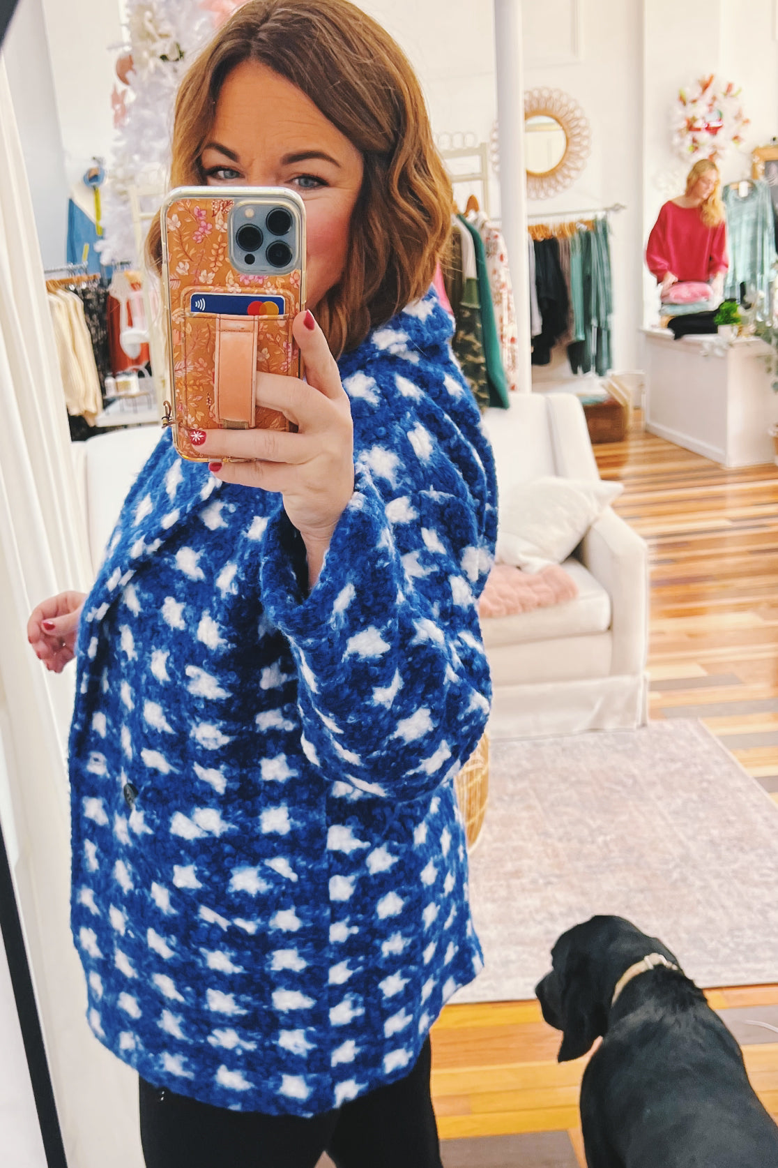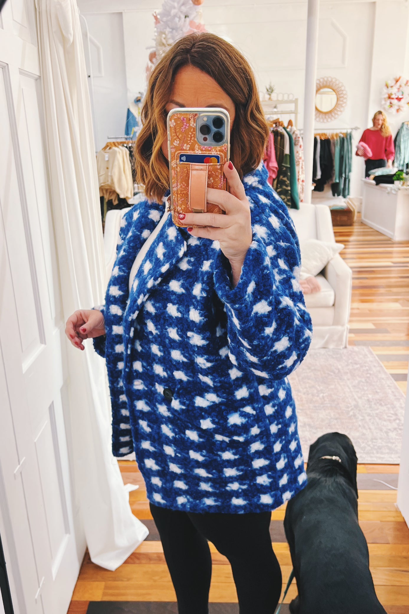 Make a bold statement with the Astrid Double Breasted Check Boucle Fleece Coat. This striking piece features a timeless royal blue and white check pattern in luxuriously soft boucle fabric that feels as good as it looks. The slim fit flatters your silhouette while the double-breasted design adds sophistication and edge. Perfect for layering on chilly days, this coat transitions effortlessly from fashion-forward styling to spirited school pride. Cozy meets chic in a coat that's destined to become your go-to favorite.