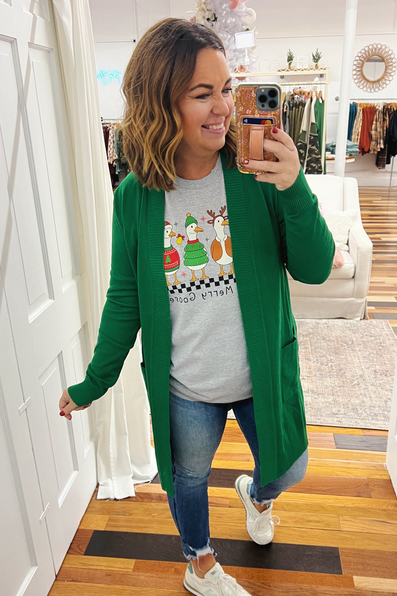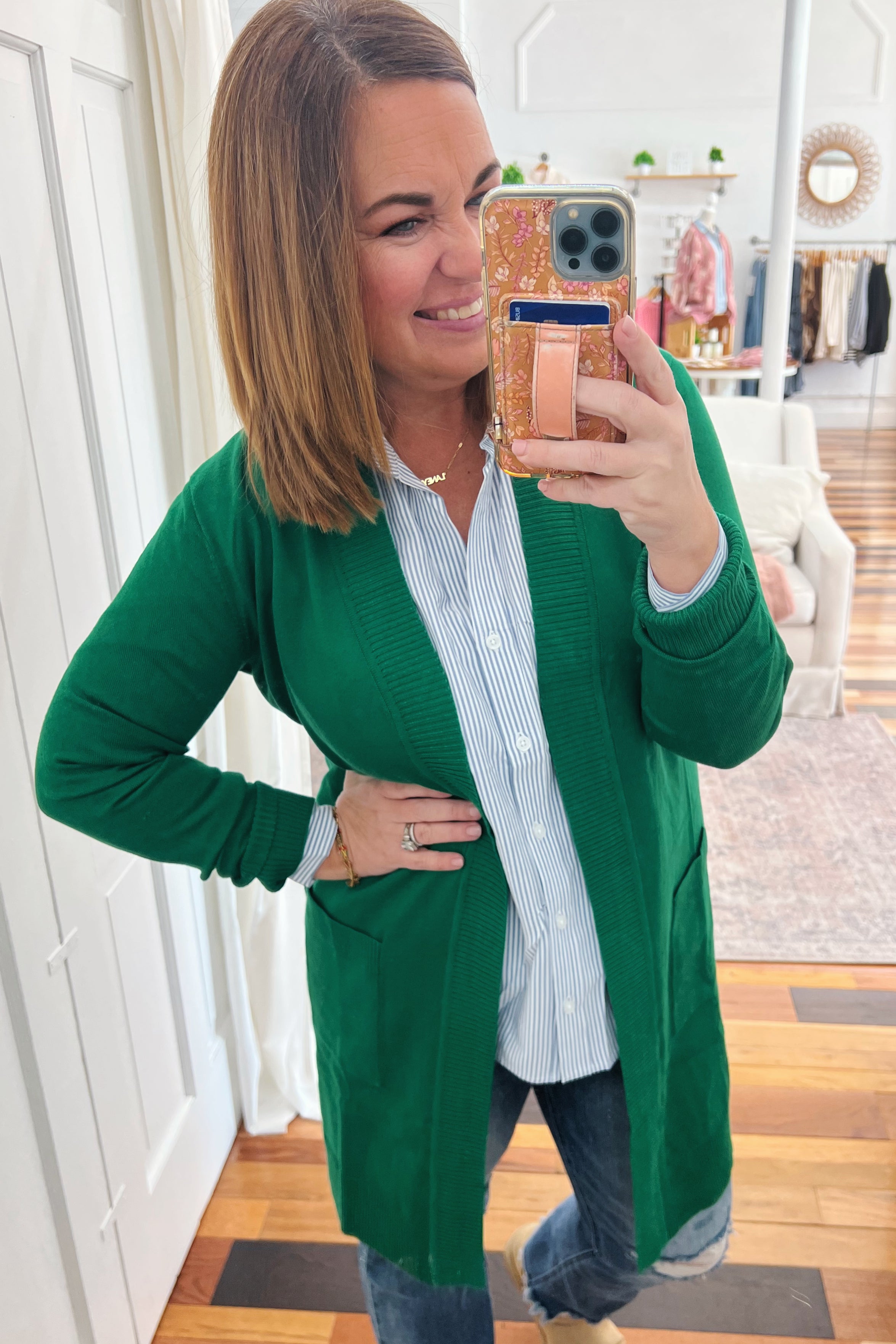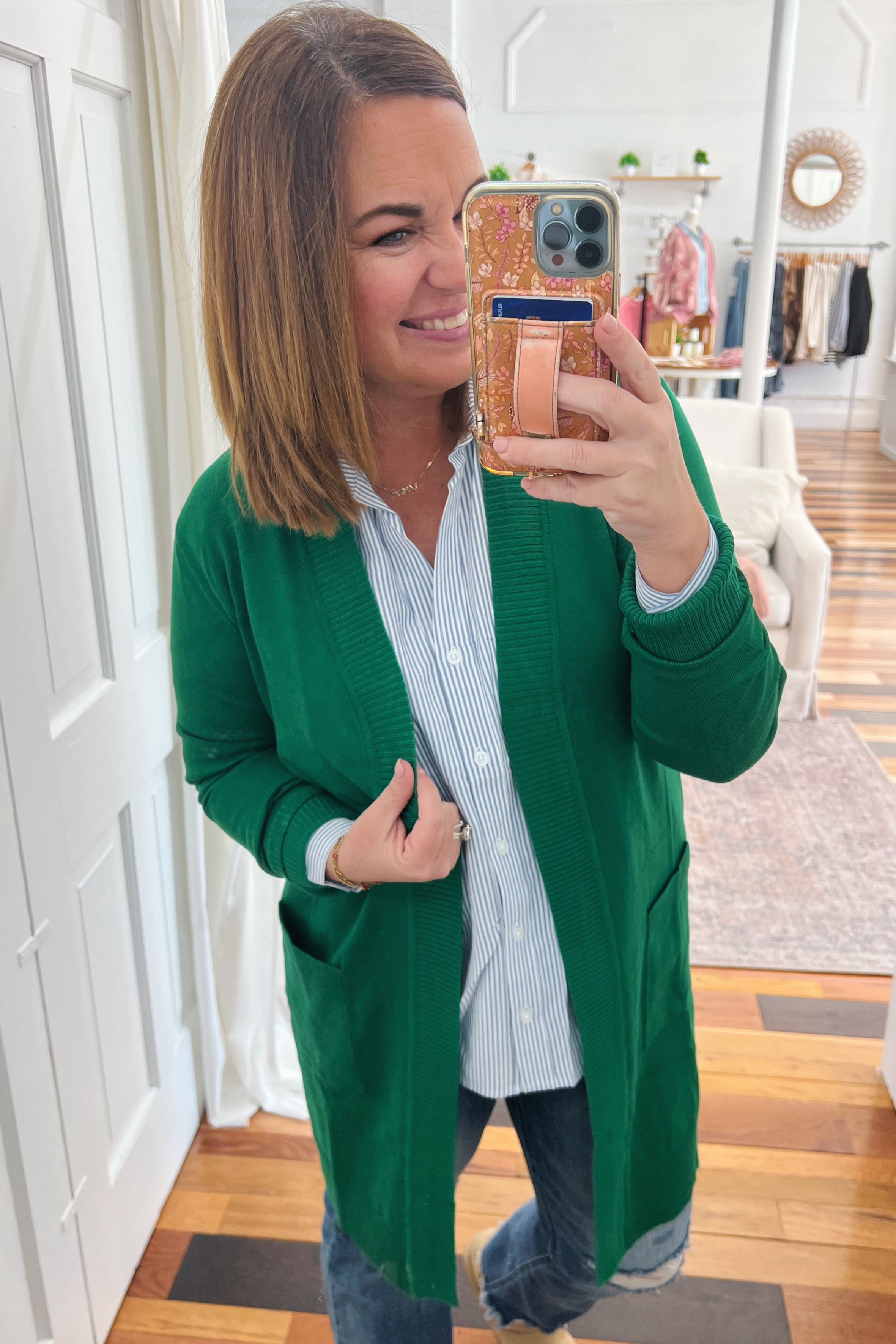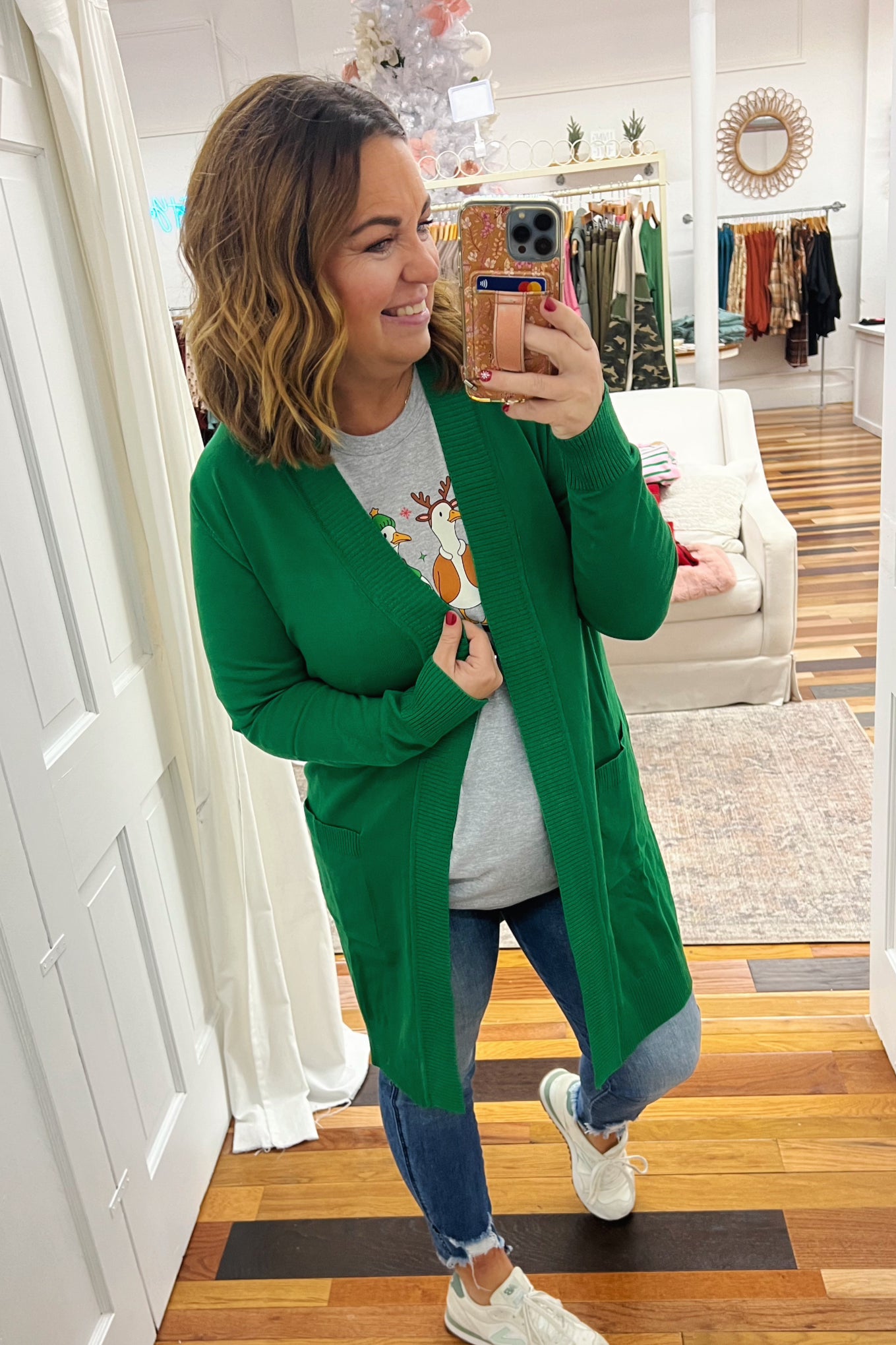 New Favorite Alert! The Aurora Long Sleeve Ribbed Cardigan in timeless classic green is the versatile piece every wardrobe needs. Its generous length hits right at the knee, creating a silhouette that flatters all body types. Crafted from a low gauge knit with a silky soft feel, this cardigan drapes beautifully and feels luxurious against your skin. Effortlessly transition from sophisticated evenings to relaxed weekends—layer it over dresses for polished elegance or pair with jeans for laid-back charm. This is the cardigan you'll reach for again and again.