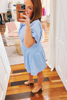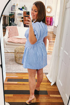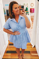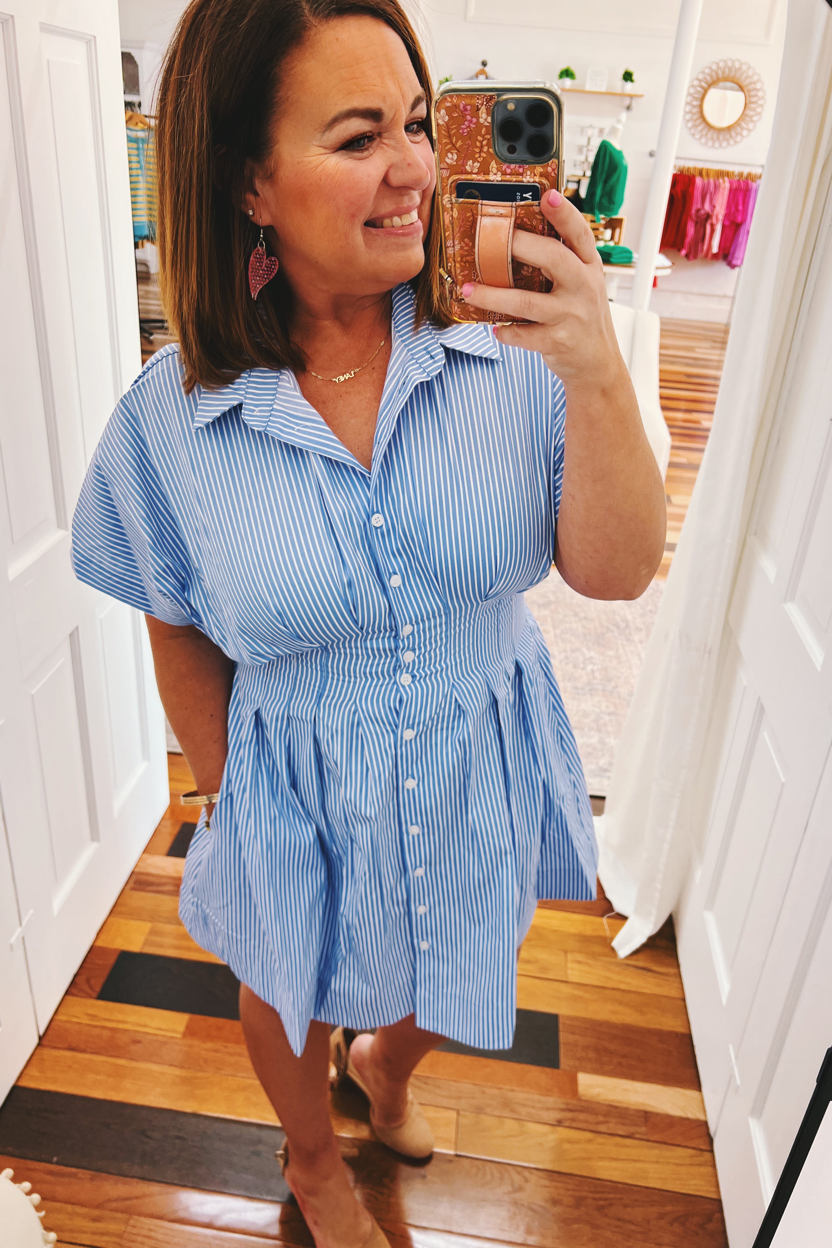 The Blanche Striped Pleated Shirt Dress is your favorite button-up reimagined as a chic, tailored dress. Crisp blue and white stripes deliver timeless appeal with a modern edge, while the structured woven fabric keeps everything polished and put-together. A pleated waist adds dimension and flatters your figure while practical side pockets mean you can actually carry your essentials. Classic meets trendy in this versatile piece that works from desk to dinner.