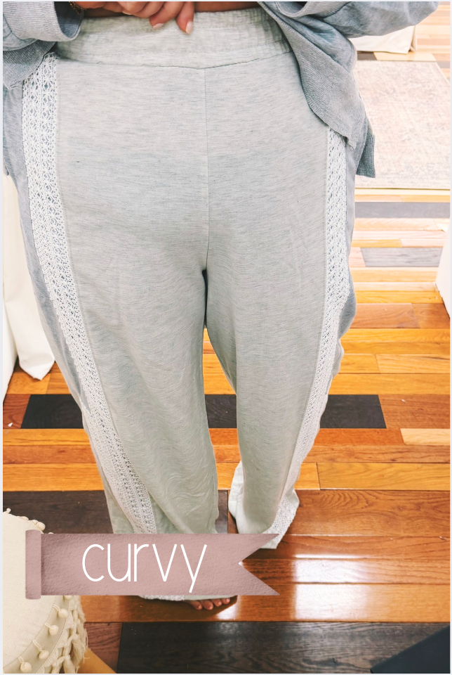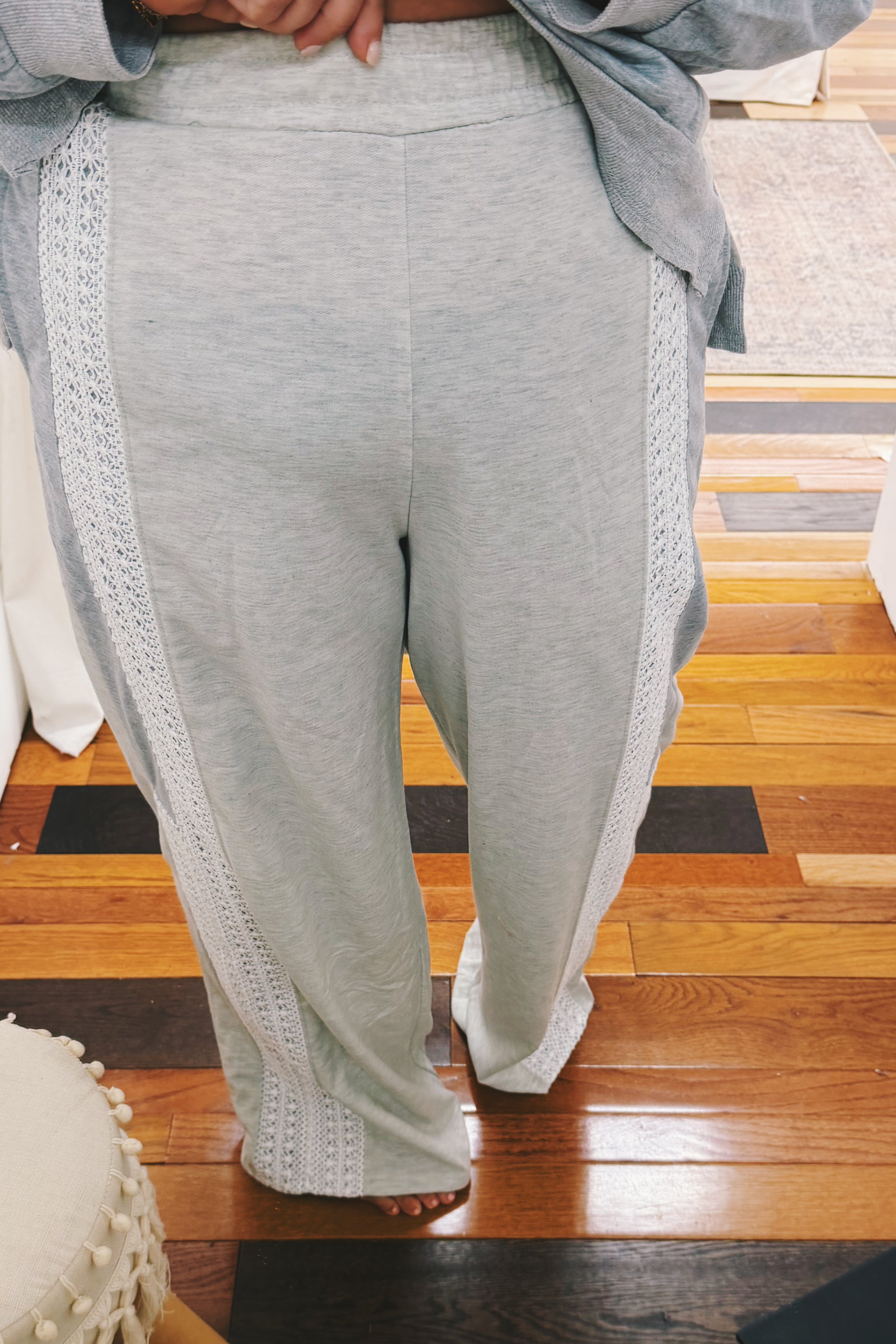 Cozy meets cute with the Clarissa Lace Trim French Terry Sweatpants. Soft French terry in heather gray with a fun colorblock design and delicate lace trim—because who says sweatpants can't be a little fancy? The relaxed wide-leg fit and elastic waist mean maximum comfort, while the girly details keep things playful. Your new go-to for looking effortlessly put-together while feeling like you're wrapped in a hug.