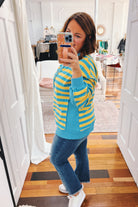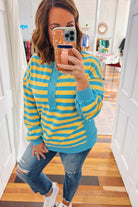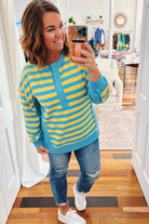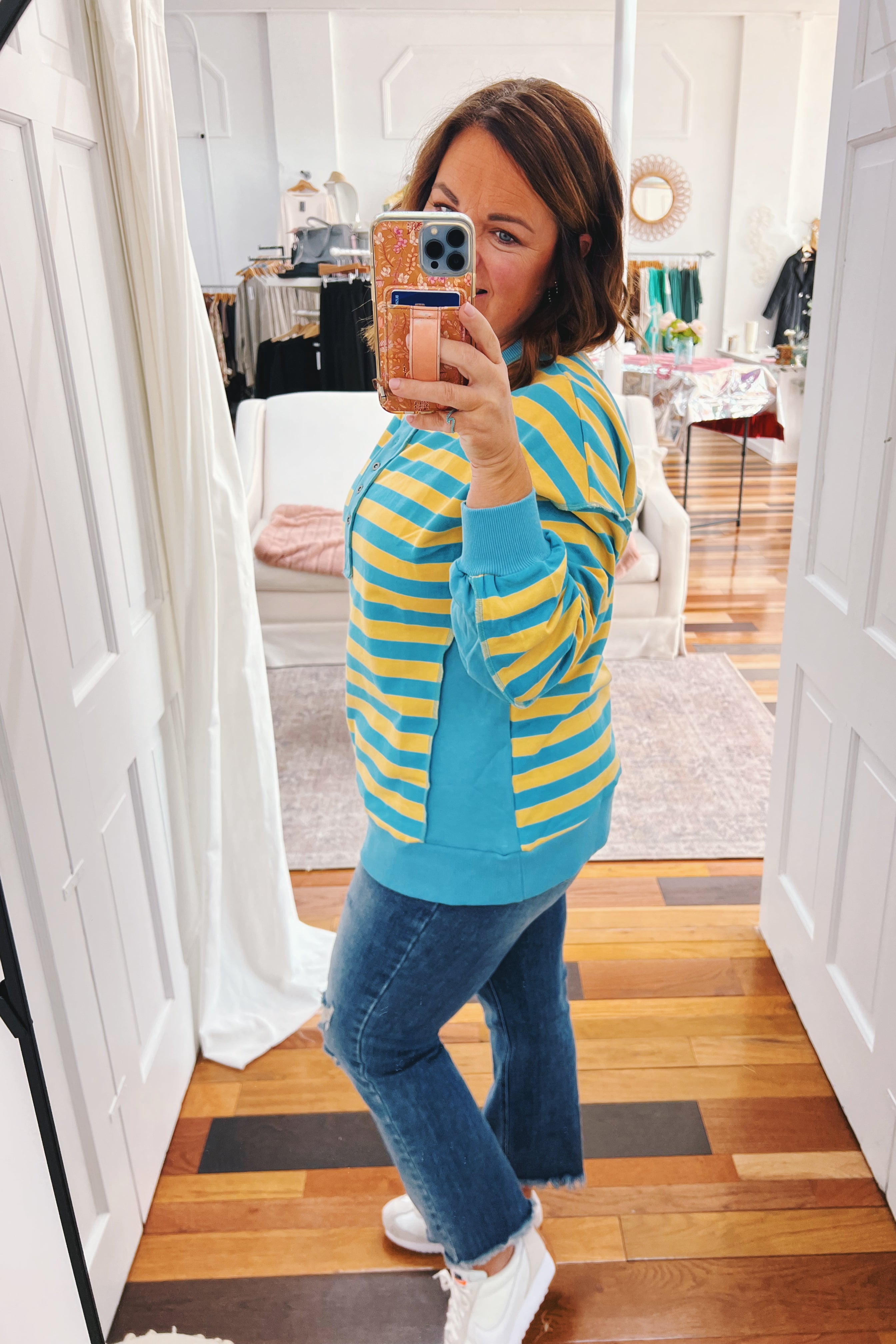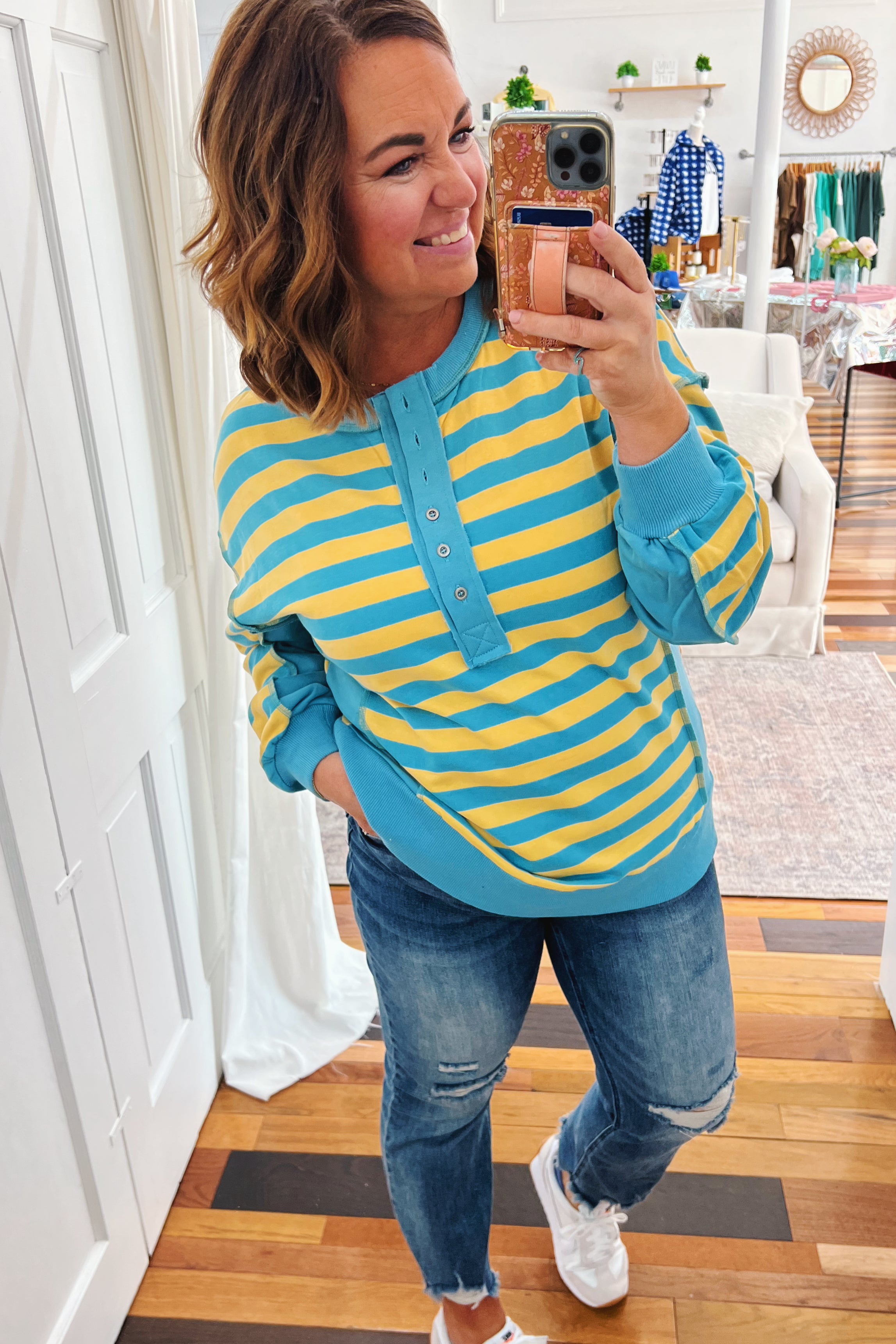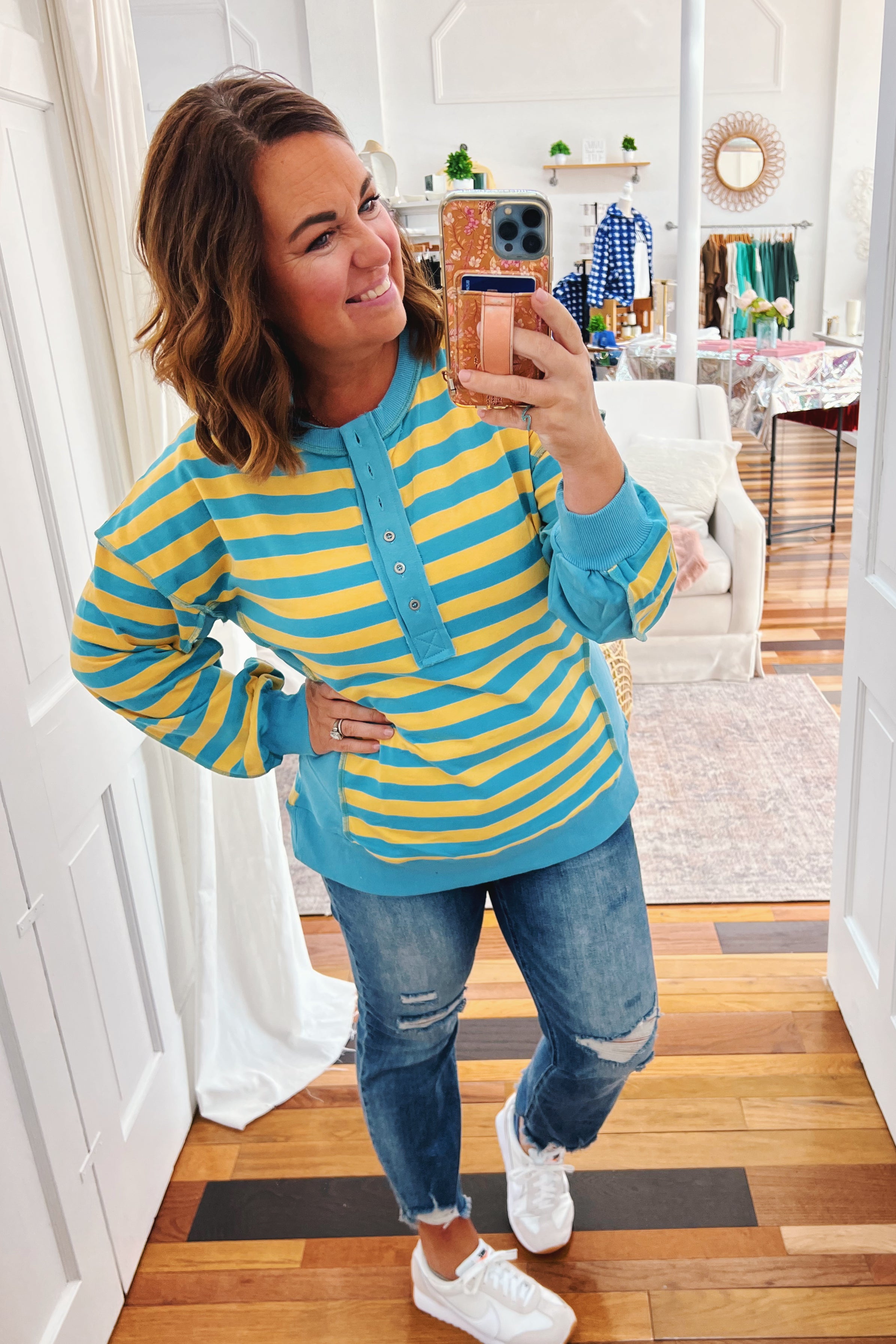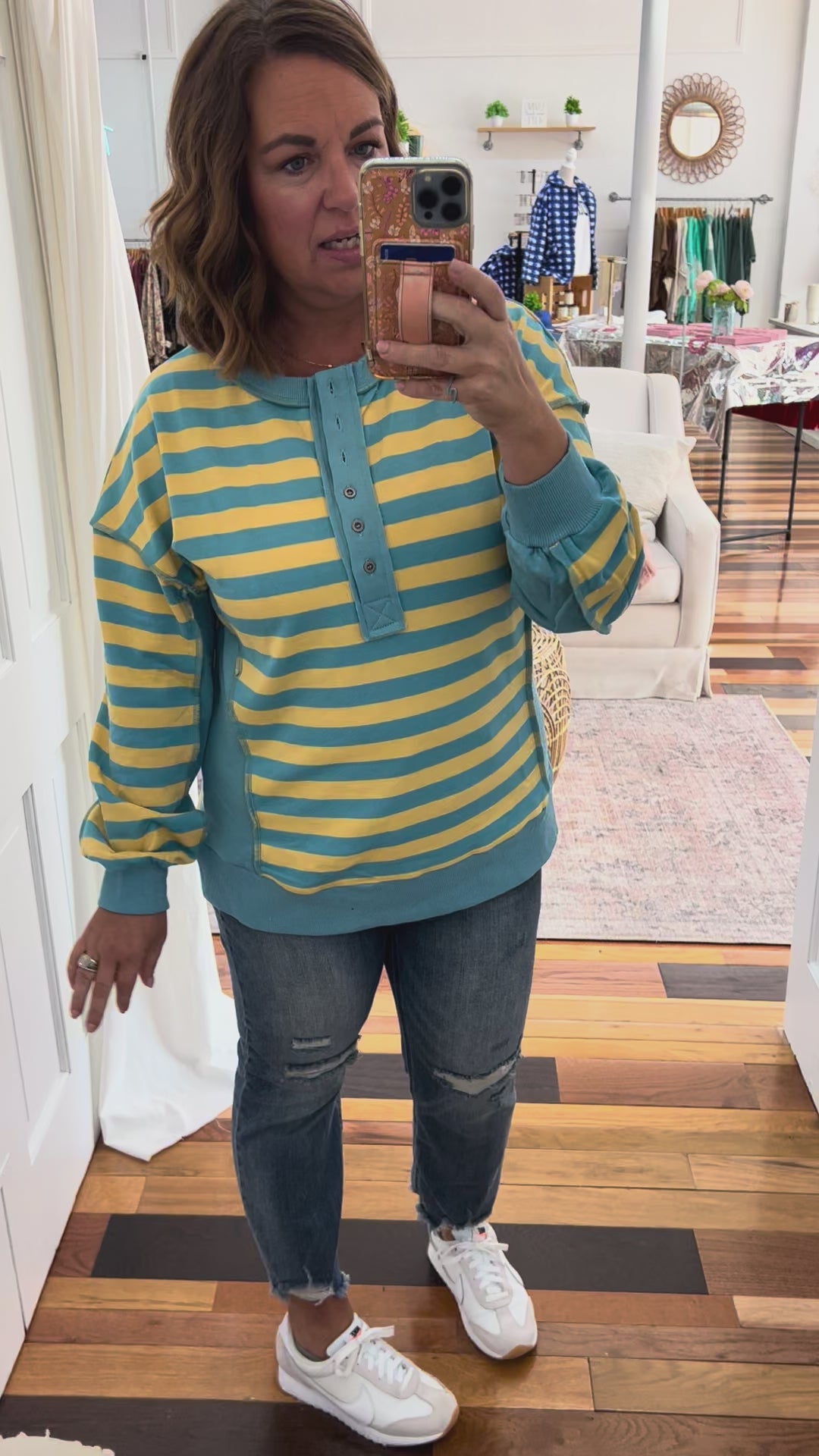 Meet Edith, the striped statement piece that refuses to blend in. This oversized button henley showcases bold aqua and yellow stripes that instantly brighten any day. Made from soft, breathable french terry, it's comfortable enough for all-day wear while the relaxed fit keeps things laid-back and cool. The classic henley neckline with buttons adds just the right touch of polish to your casual rotation. Throw it on and let your outfit do the talking.